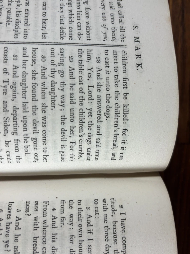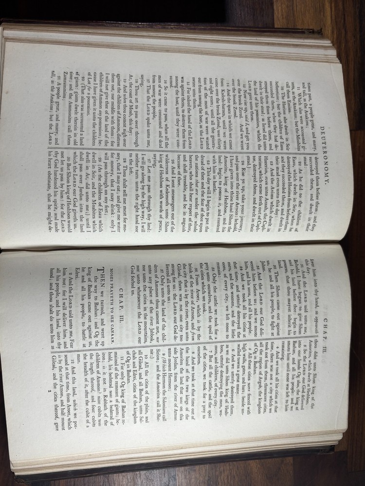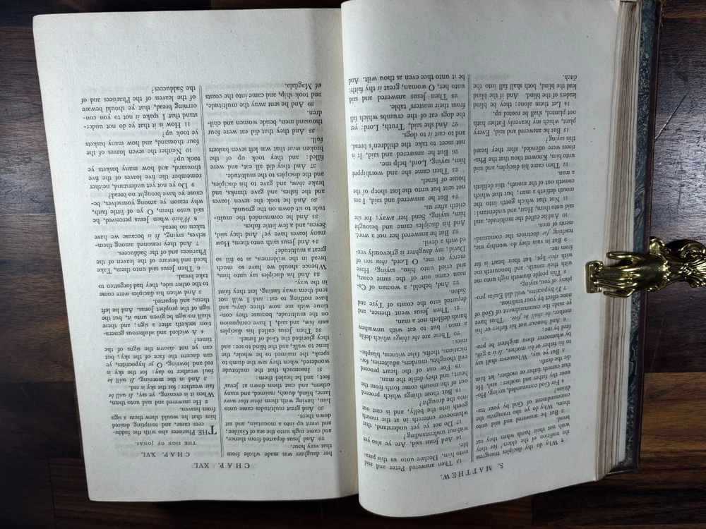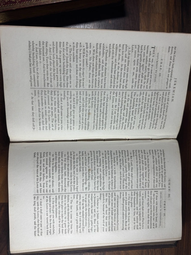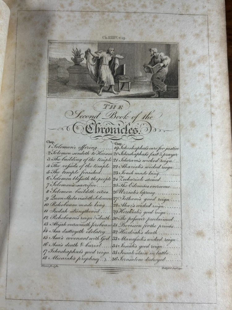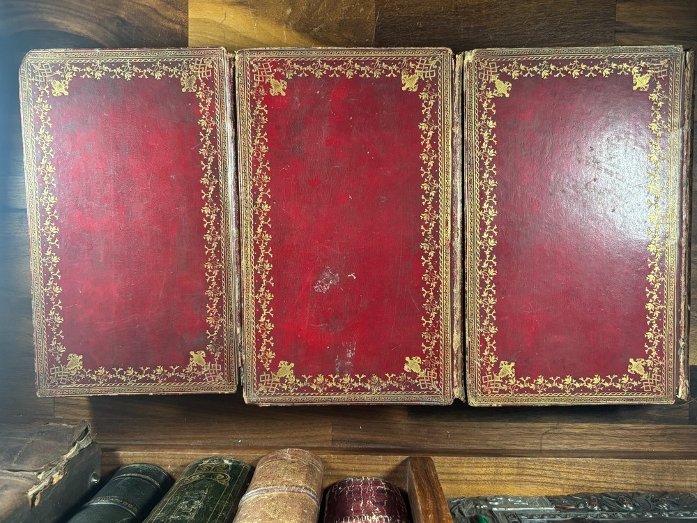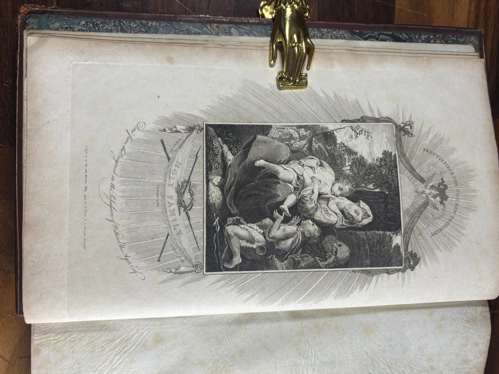 A finely produced late-Georgian illustrated edition of the Holy Bible, printed in London in 1795 and commonly known as the Fittler Cabinet Bible . Complete in three volumes. Format: Quarto (approx. 255 × 170 mm binding; text block 200 × 115 mm). Printed on laid paper. Copperplate engraved illustrations throughout. Contemporary gilt-tooled calf bindings with decorative Greek-key borders, urn tools, and spine compartments richly gilt. Spines lettered “Unique Cabinet Bible,” volumes numbered I–III. Marbled endpapers. Includes engraved titles and numerous copperplate plates after celebrated Old Masters, including works after Albrecht Dürer. Notable Textual Variant Mark 7:27: This copy contains a significant misprint in Mark 7:27, reading: “Let the children first be killed …” The correct King James Version text reads “filled.” The type appears cleanly set, indicating an original typesetting error rather than ink spread or damage. Such single-word errors were possible in hand-set late 18th-century printing, though examples preserved in complete sets are uncommon. This feature adds bibliographical interest to the present copy. James Fittler (1758 - 1835): James Fittler was one of the leading English engravers of the late 18th century. A pupil of Francesco Bartolozzi, he developed a reputation for refined line engraving and reproductive prints after major European paintings. He served as Marine Engraver to King George III and became an Associate of the Royal Academy. Fittler’s engravings are known for their clarity, controlled shading, and academic precision. The Cabinet Bible represents a substantial artistic undertaking, translating revered religious artworks into accessible engraved form for educated Georgian households. It reflects both devotional purpose and the era’s strong appetite for fine art reproduction. Historical Context: Published in 1795 during the reign of George III, this edition belongs to a period of high craftsmanship in English printing and copperplate engraving. The “Cabinet Bible” format was designed for cultured domestic libraries. Elegant, illustrated, and intended as both devotional text and decorative object. Printed by Thomas Bensley, one of London’s respected printers, and issued by publisher Robert Bowyer, this edition reflects the late-Georgian taste for finely illustrated religious works prior to full mechanization of printing in the 19th century. Large illustrated quarto Bibles such as this were substantial purchases at the time and often retained as heirloom volumes. Condition: • Complete in three volumes • Engravings present • Age toning and foxing can be found throughout • Rubbing to binding extremities • Structurally sound Dimensions (Complete set): Weight - 3.75KG Height - 25.5cm Width - 17cm Thickness - 13.5cm