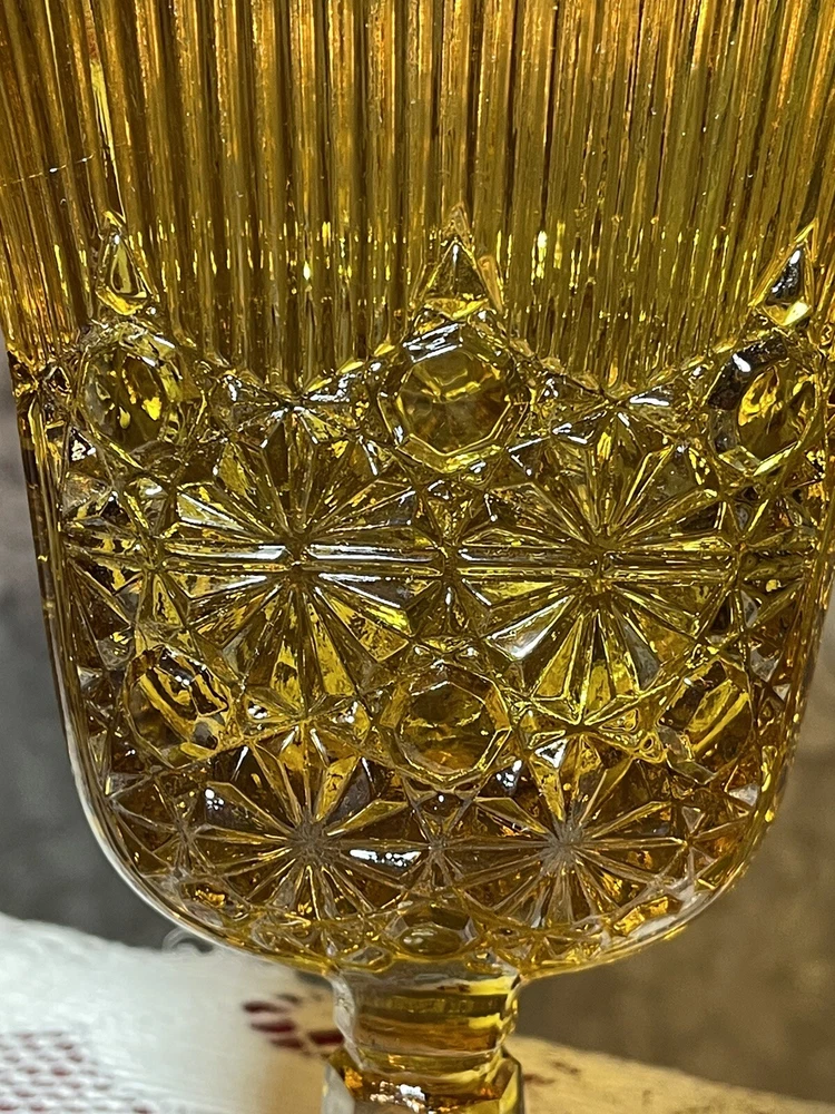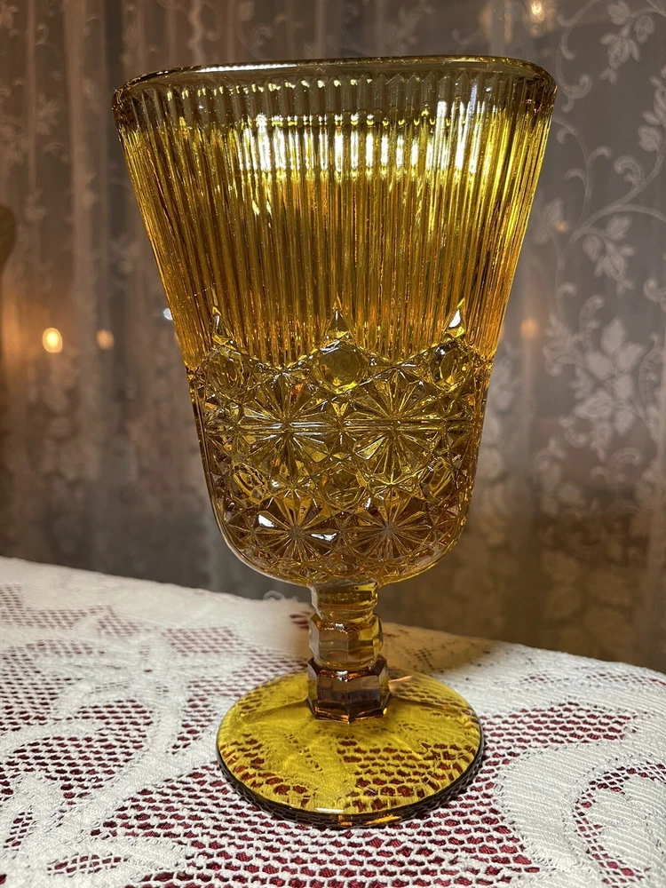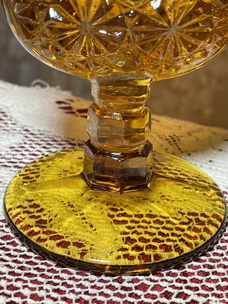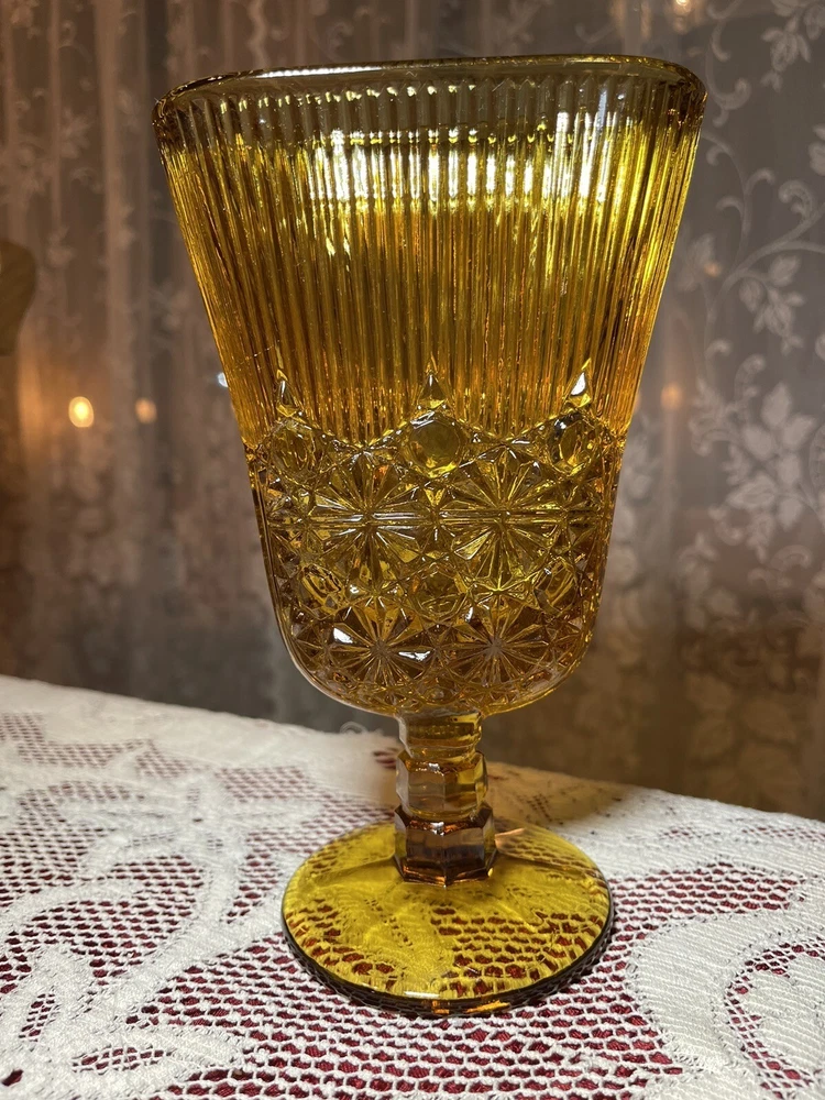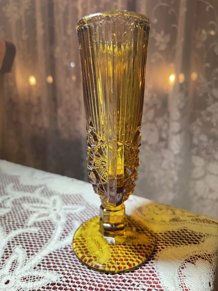 Hard to find! Rare piece. This exquisite vintage amber glass vase is a true masterpiece for collectors! The unique broom shape, combined with the delicate daisy & button pattern, creates a stunning decorative piece that will earn you tons of compliments. Measuring 7.75 inches in height, this vase is perfect for displaying your favorite flowers or simply as a stand-alone decorative item. Crafted from high-quality pressed glass, this vase exudes elegance and sophistication, making it an excellent addition to any home decor collection. If you love amber glass, you’ve got to have this piece! Love how the sun and light shine through it! No scratches! Excellent condition! No worries! Experienced shipper. Heavy piece, weighs 1 pound, 10 ounces.