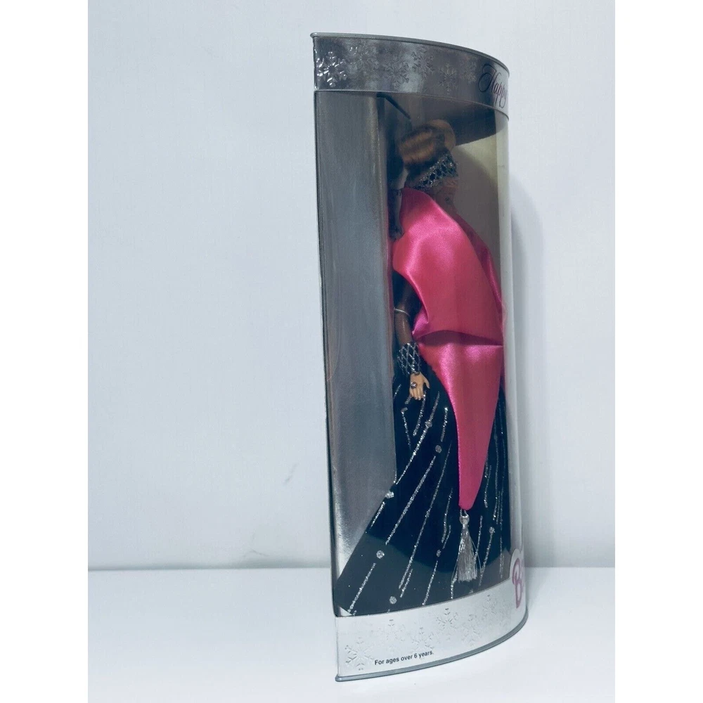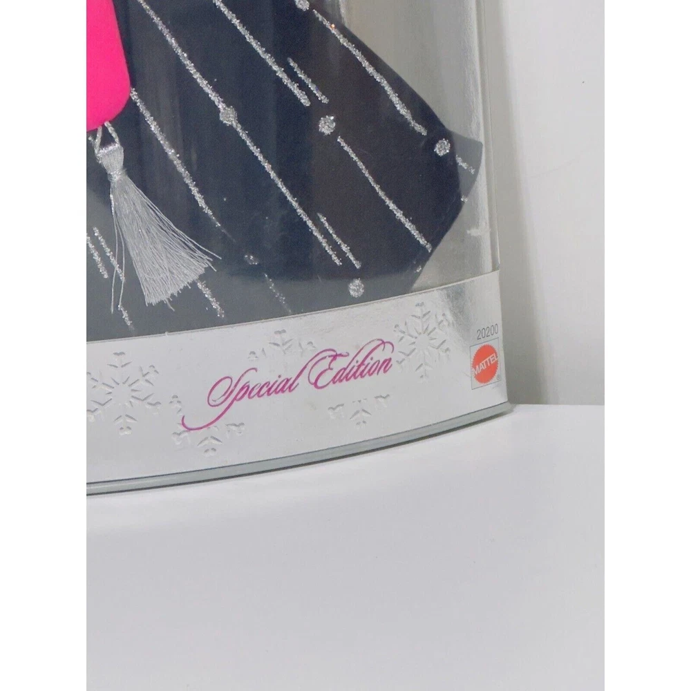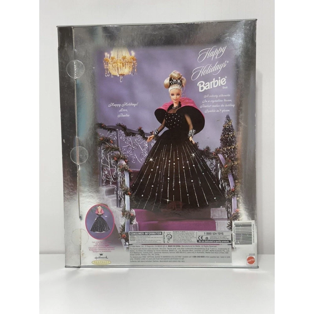 Barbie Special Edition. -RARE- Happy Holidays Barbie, Special Edition from 1998. This specific collectible Barbie is rare because of an error on the back of the box. The doll itself has a long shawl, while on the back of the box she’s wearing a short cloak/hood. She is also wearing a belt on the front, and this belt is missing on the back image. Vintage 1998 Happy Holiday Barbie 11th in Series Special Edition # 20200 Mattel Black Velvet Dress Great Gift Barbie Collectors Black Velvet Dress, Silver Accents, Blonde Hair, Pink Satin Stole, Gemstones Shop for Christmas early! This is the very rare new in box Happy Holiday Barbie collectors treasure find. Barbie is ready for a night on the town and is wearing an elegant long black velvet black holiday gown trimmed w/shiny silver strands w/gemstones. This is a great edition to your Happy Holiday Barbie collection. She is the only Barbie in the series who is wearing black. She has a beautiful black & silver choker also bright pink satin stole w/silver tassels that complete her great look. Great Christmas gift for your little girl. Barbie's beautiful long blond hair is styled in curls with an up do for a formal evening accented w/ a wide black & silver headband and & crown fit for a princess or queen. Barbie is wearing classic jewels including a stunning pearl ring, pearl stud earrings, and a silver belt. The back of box says: Happy Holidays Barbie Doll A Velvety silhouette In a crystalline dream Barbie makes the Holiday sparkle & gleam.
