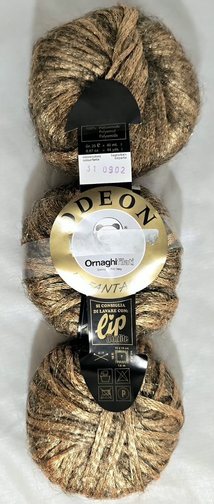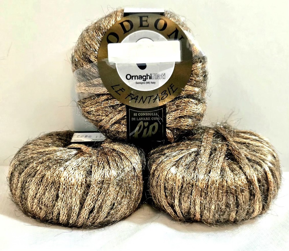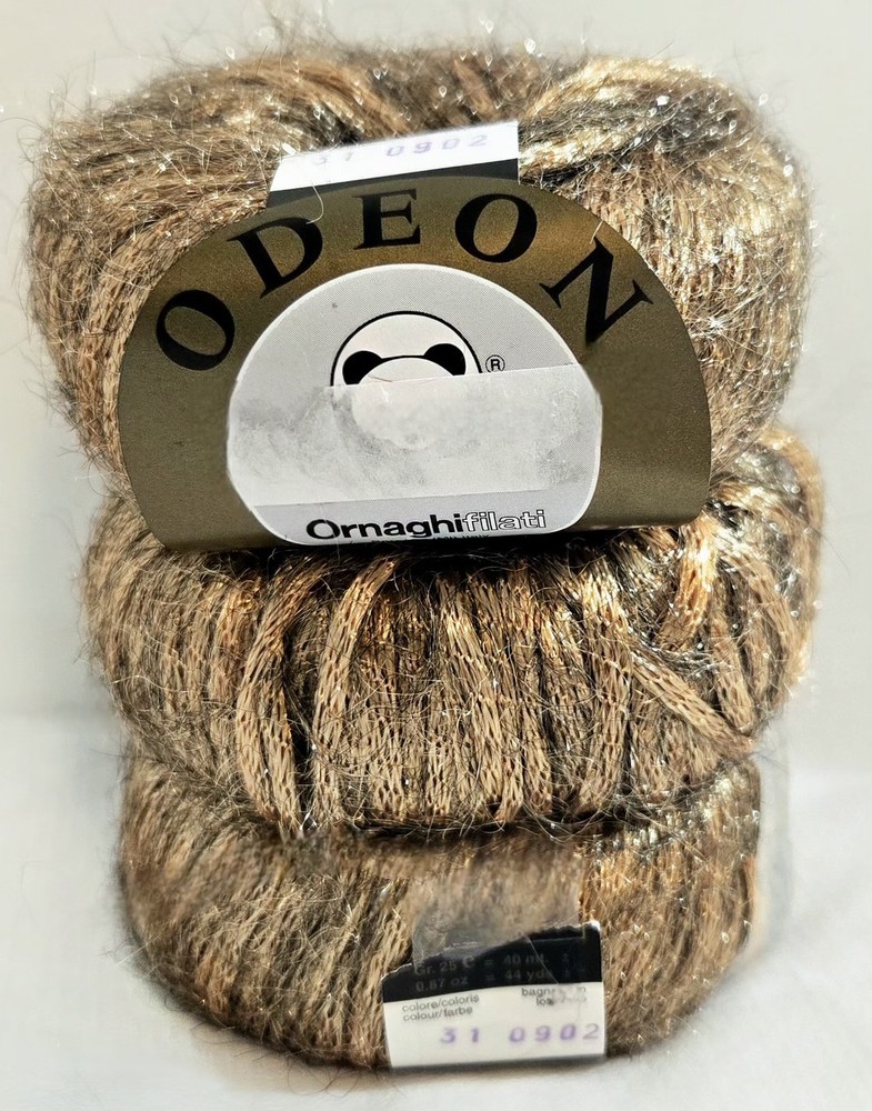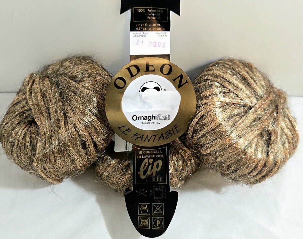 Find your next creative spark with this stunning and rare set of metallic yarn from Italy's Ornaghifilati. This high-quality lot is perfect for adding a touch of glamour to any project. Condition: This yarn is in new, unused condition. The original labels are fully intact, clean, and show no signs of wear, fading, or damage. The yarn itself is pristine, free from any odors, dust, or damage. KEY DETAILS & SKEIN INFORMATION Brand: Ornaghifilati Line: Odeon Quantity: 3 Skeins Fiber Blend: 100% Polyamide (Nylon) Color: Gold Metallic Color Number: 310902 Weight (per skein): 25g (0.87 oz) Length (per skein): 40m (44 yds) Total Weight (Lot): 75g (2.61 oz) Style: Metallic, Novelty, Boutique Manufactured In: Seregno, MI, Italy Recommended Needle Size: US 3-5 (3.25mm - 3.75mm) is an estimated range based on yarn weight guidelines for this yardage. A swatch is recommended to confirm your tension. Gauge: Approximately 5-6 stitches per inch (knit), which corresponds to the estimated needle size. Don't miss the opportunity to work with this exceptional, vintage-condition yarn. It's ready to transform your next project into something truly spectacular!