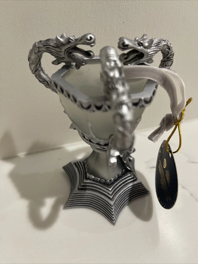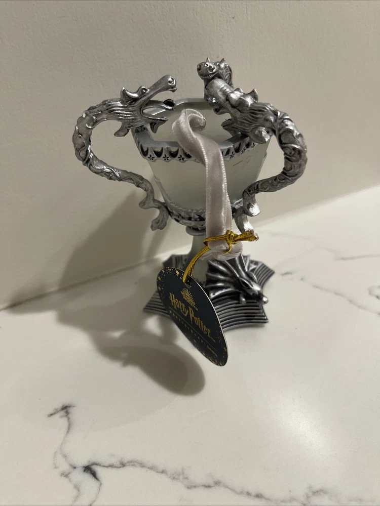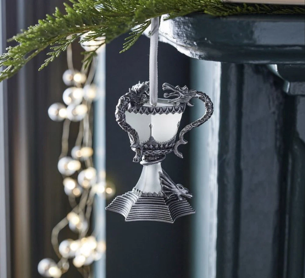 The product is a Harry Potter Triwizard Cup Light-Up Ornament by Pottery Barn Teen. This ornament features a design inspired by the Triwizard Cup from the Harry Potter series and has the ability to light up, adding a magical touch to holiday decorations. The ornament is new in box, making it a perfect addition for Harry Potter fans looking to incorporate their love for the series into their holiday decor. *BRAND NEW IN BOX. Never used and batteries are still new inside ornament. Comes in original PB box.