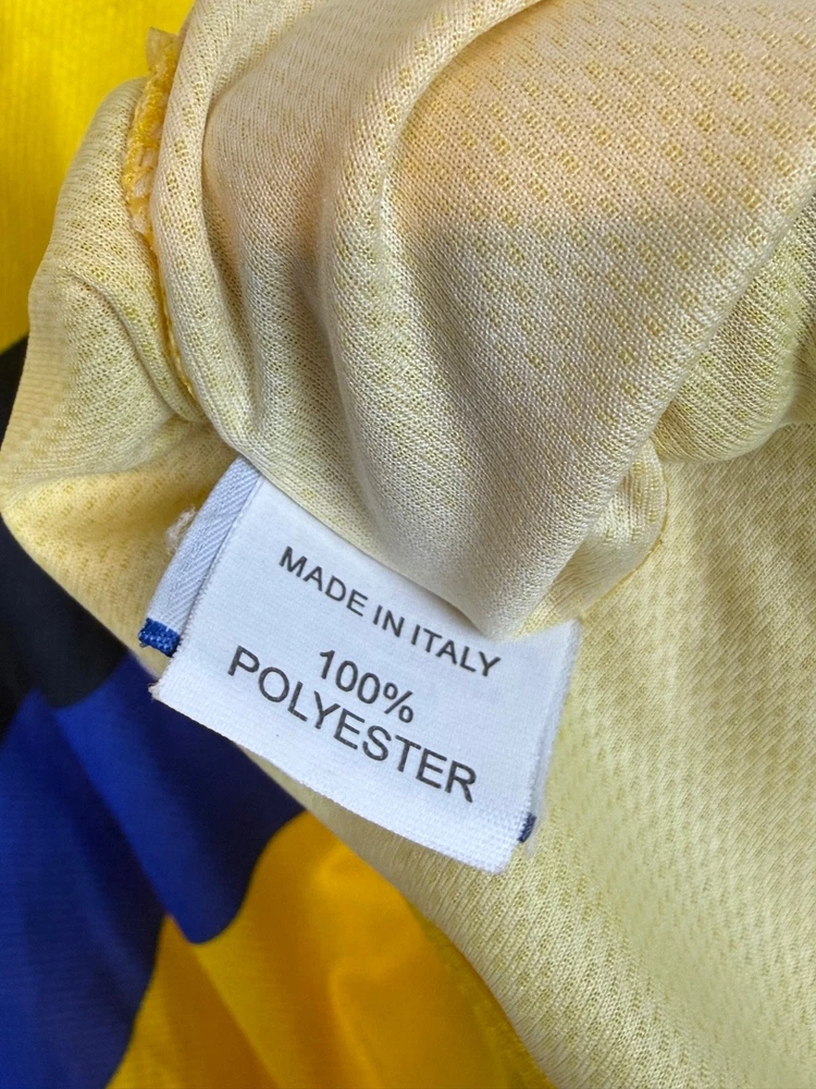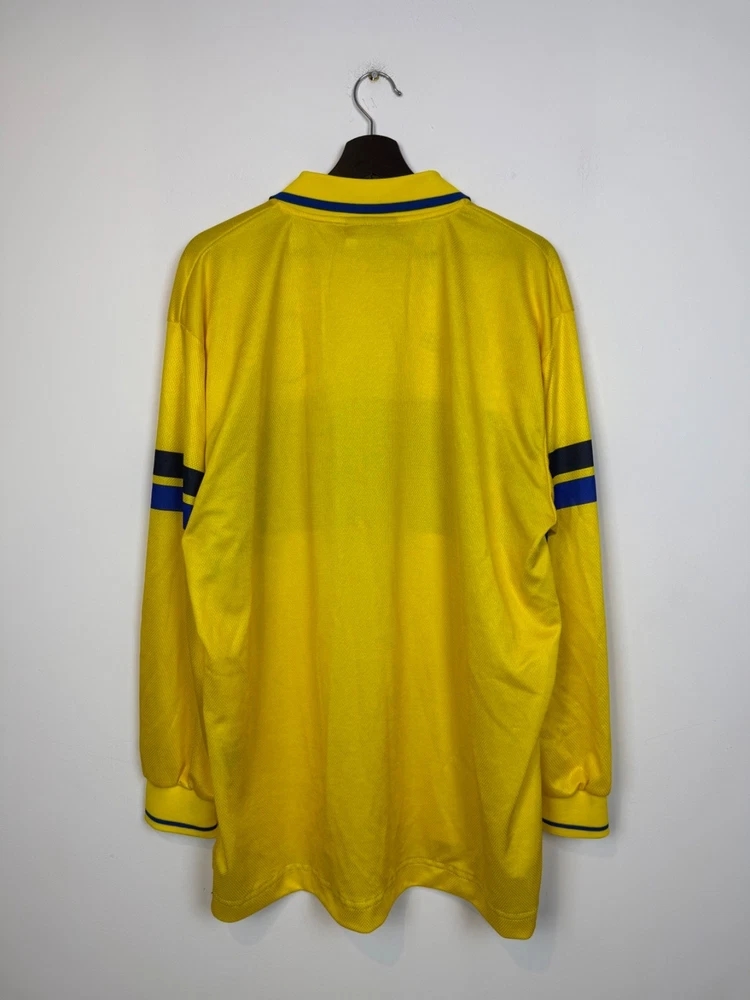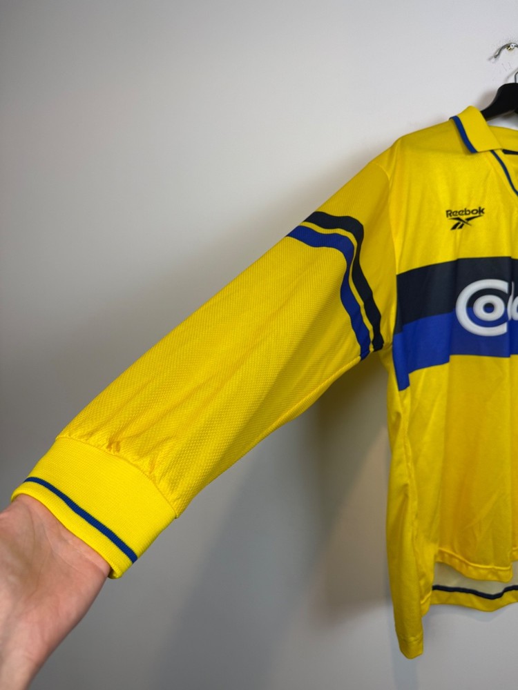 This rare Reebok Brøndby IF 1998/2000 home soccer football jersey features a Codan sponsor and long sleeves. Officially licensed by Brøndby IF, this yellow jersey is in size XL and made for men. The jersey is a collectible item that represents the team's design and colors from that period, making it a valuable addition to any sports memorabilia collection. Made in Italy, this jersey showcases the quality and craftsmanship of Reebok products from that time. Size XL Very Good Condition! Look at the photos! Fast Shipping! Chest 65 cm Shoulders 56 cm Length 83 cm Sleeve Length 61 cm