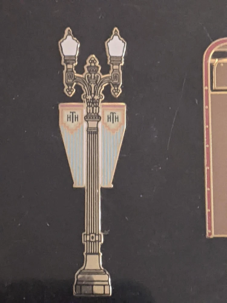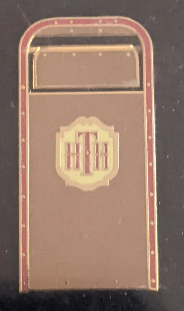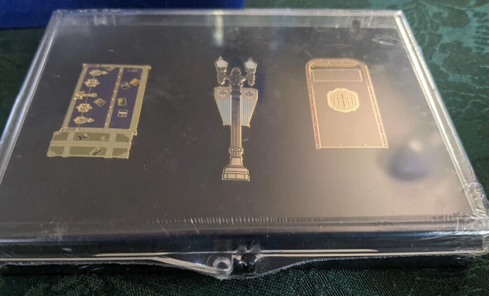 Cast Member Exclusive Hollywood Tower Hotel aka Twilight Zone Tower of Terror 3 Pin Set Limited Edition 2000 PinPics #30223 Wow!! Very Sharp Set, Beautiful finish. Nice representation of the classic elegance of the 1940's. This trash can isn't a part of the original Cast Trash can series but is the same size and a swinging lid/opening. The pin is .75" W x 1.5" H, dark tan, burnt red trim, and HTH logo on pale yellow shield. From Disney's California Adventure or DCA. Update on colors: I was there today and the dye lot may be off a bit but the trash cans with the HTH logo are tan (kind of a mustard/tan) with orangish/rust trim. I don't know if they didn't have them in place during the Grand Opening event but they're there now. Back of pin reads:Disneyland ResortCast ExclusiveLimited Edition 2000©DisneyChina Tower of Terror Lamppost - just like the ones at DCA. Old fashioned bright gold pole with HTH logo pennants. This pin is .5"W x 2"T with a really well done high gloss finish. HTH Logo flags on each side of the Light post and on front of the Trash can. This pin is a purple steamer trunk on top of a olive green suitcase. The hinges/clasps on the trunk are set-in with a brushed gold finish - really nice. The pin is .875"W x 1.5"T The suitcase has several stickers from its many travels. The set comes in a small plastic case with a black velvet backdrop. Set #30223: Trash Can #30231, Lamppost #30232, Luggage #30233