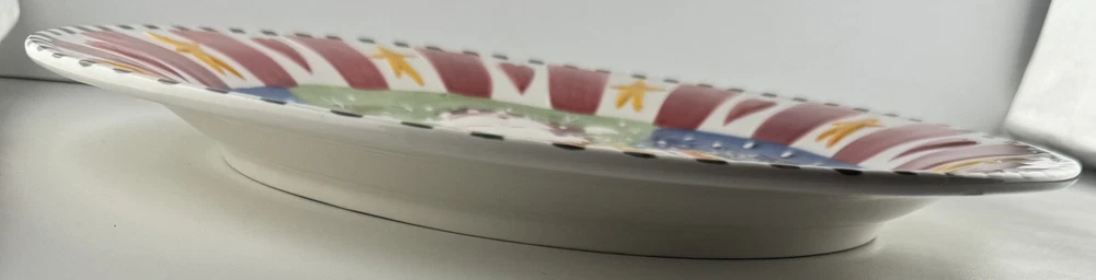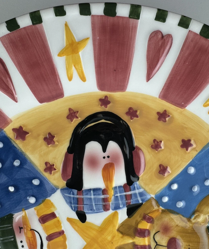 One chip on the underside, pic 2. There is a small crack on Santa’s beard that doesn’t go all the way through the plate, see all photos. Approximately 12” wide.