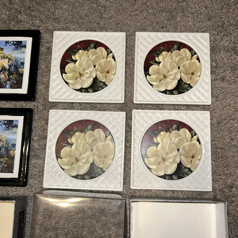 YOU GET 4 OF THE FLOWER COASTERS AND YOU GET 4 OF THE OTHER KIND! A GREAT PRICE FOR THIS AWESOME SET OF COASTERS! NOTICE THE SLIGHT DISCOLORING SHOWN IN THE PHOTOS, NOT SURE IF ITS BECAUSE THEY WERE USED OR MANUFACTURING ERROR, BUT THEY STILL LOOK AMAZING! Please review all of the pictures shown above, as you will get the EXACT item/items shown! Please feel free to contact me with any questions or OFFERS!