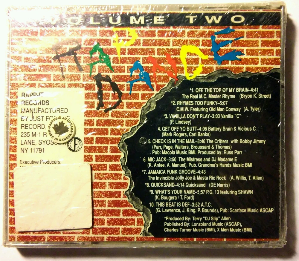 MEGA RARE, COLLECTABLE VINTAGE, NEW AND FACTORY SEALED OLD SCHOOL RAP DANCE, HIP HOP, FAMOUS, LEGENDARY DANCE BEATS CD VOLUME 2 BY RAP-IT RECORDS, CANADA LAST CHANCE TO FIND SUCH A RARE 10-TRACK RAP DANCE CD FACTORY PLASTIC WRAP IS A BIT LOOSE AND BROKEN IN PLACES DUE TO AGE, BUT STILL TIGHT ENOUGH TO PROTECT THE CD. PRODUCED BY: TERRY "DJ SLIP" ALLEN PUBLISHED BY: LONZOLAND MUSIC (ASCAP) CHARLES TURNER MUSIC (BMI) X MEN MUSIC (BMI) PLEASE SEE PICTURES FOR DETAILS
