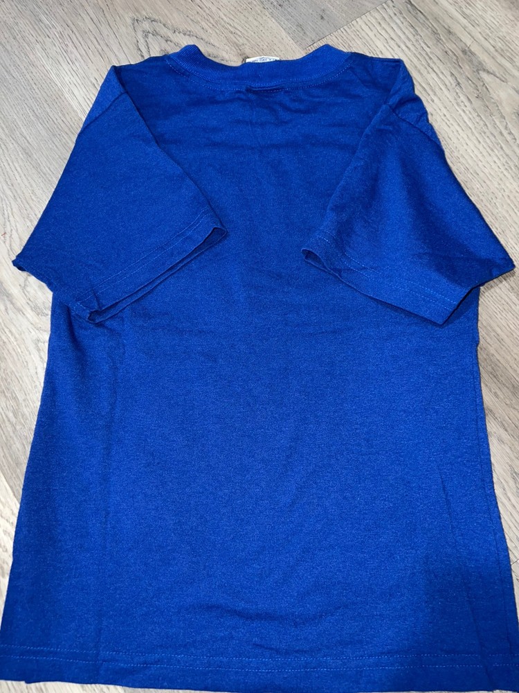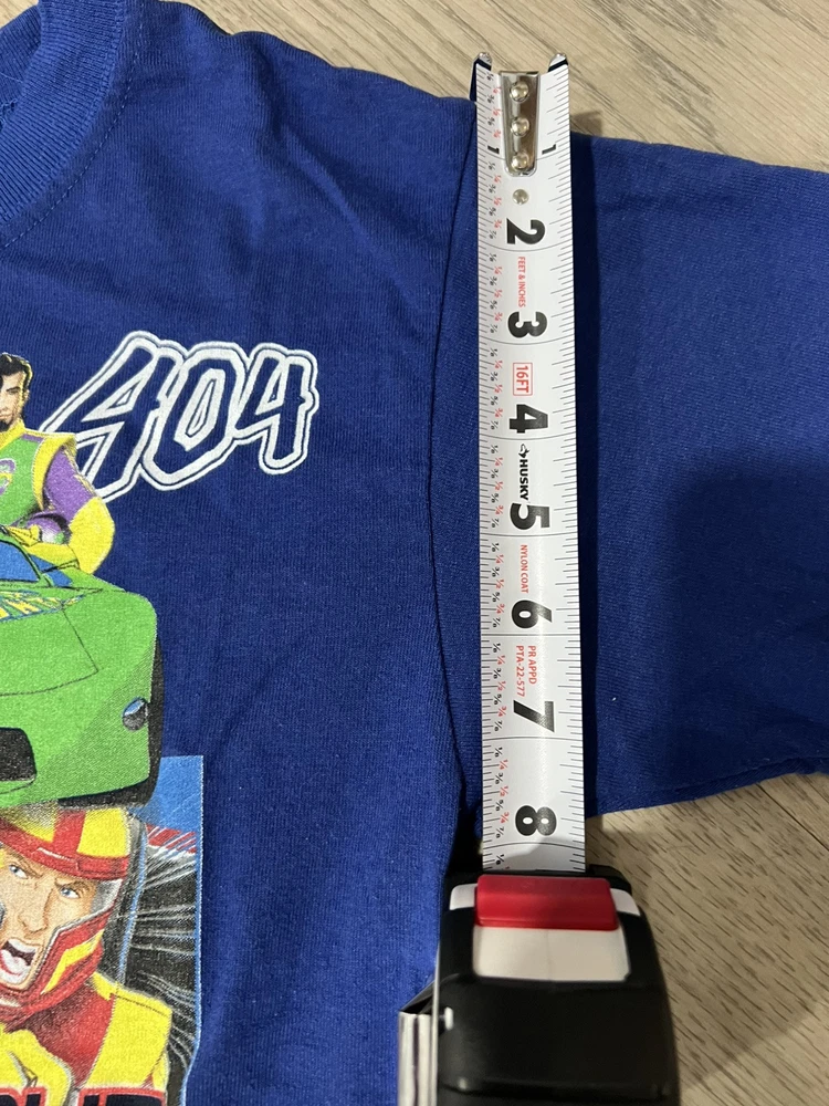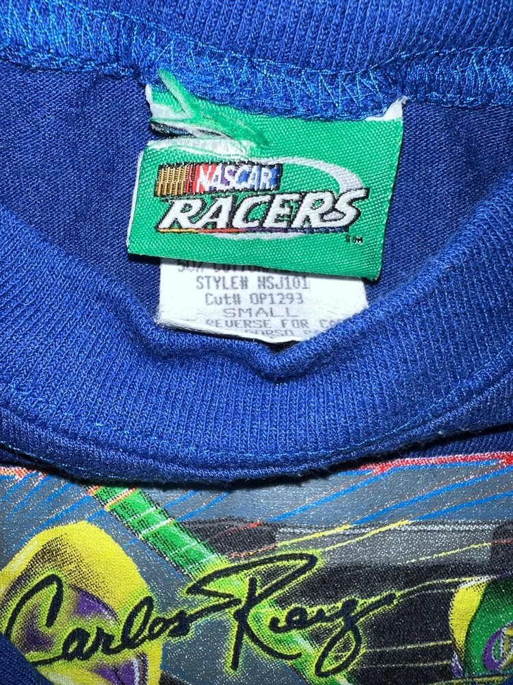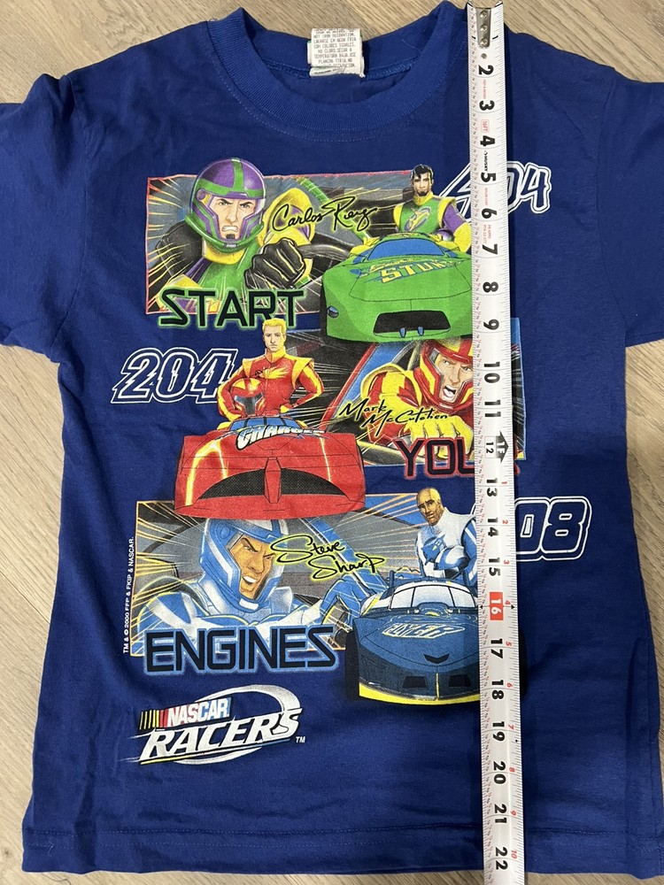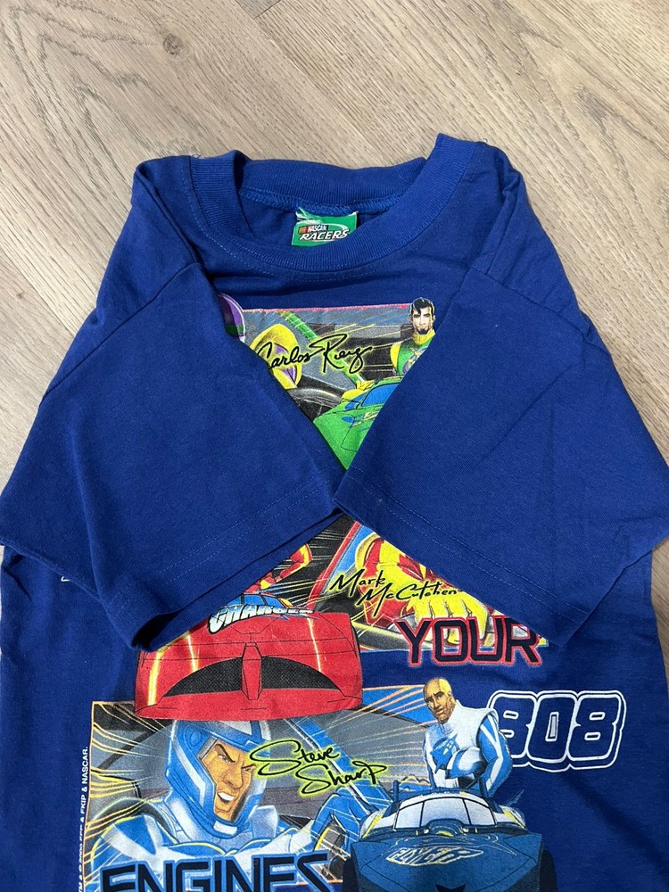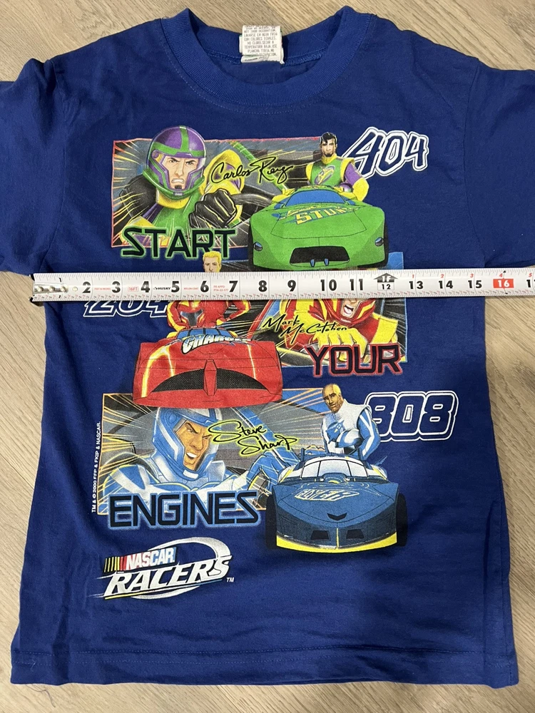 This is a rare vintage 90s NASCAR Racers youth small kids t-shirt in blue. It is officially licensed by NASCAR, making it an authentic piece of fan apparel for young auto racing enthusiasts. The shirt is designed for unisex children and features a classic NASCAR design, perfect for young fans looking to show their support for the sport. It is a collectible item that would appeal to fans of NASCAR looking for retro merchandise from the 1990s.