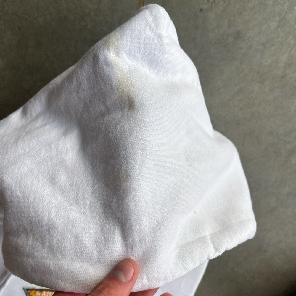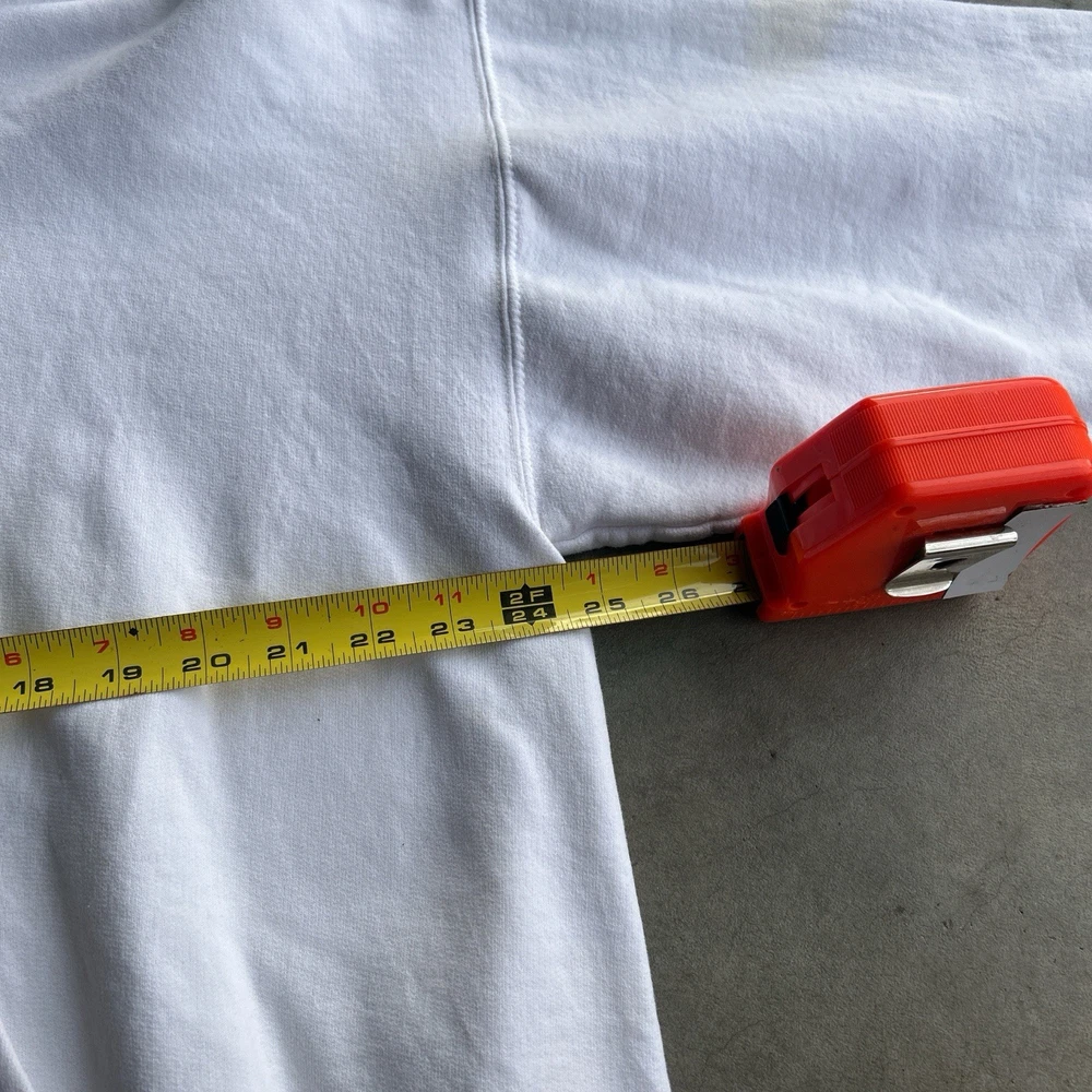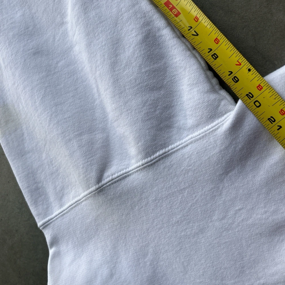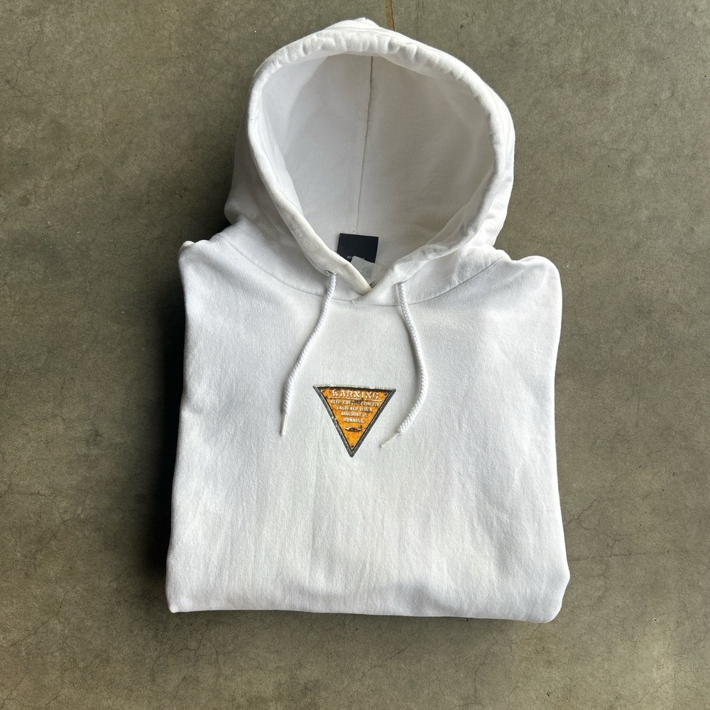 The product is a rare vintage Oakley Software Saw Blade hoodie in size large. This white pullover hoodie features a graphic print with a drawstring closure, making it a stylish and unique addition to any man's wardrobe. With themes ranging from army to sports, this heavyweight hoodie is perfect for all seasons and offers plenty of pockets for convenience. Perfect for those who appreciate retro and 90s style with a touch of steampunk flair. Slight yellow stains throughout