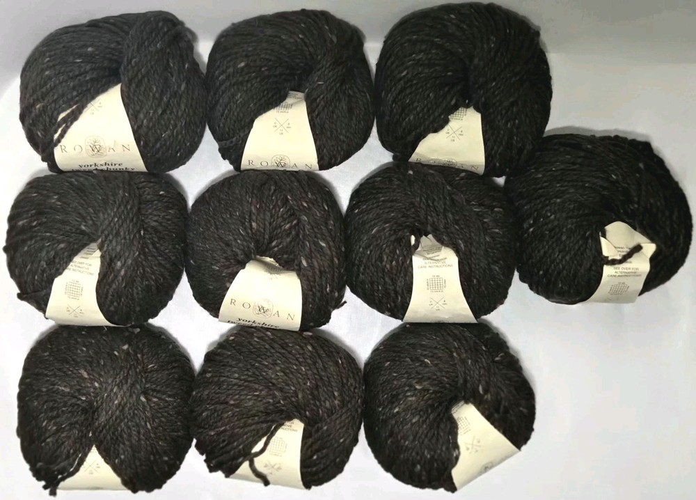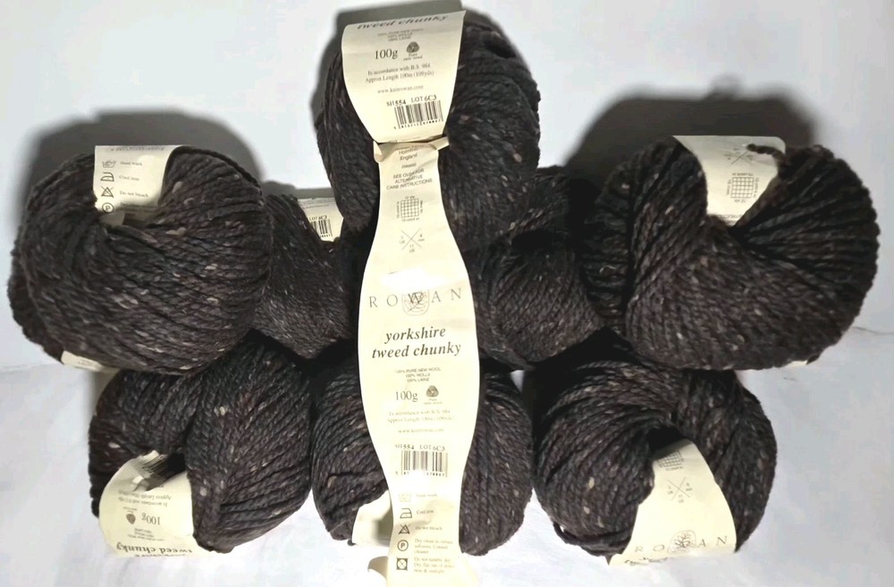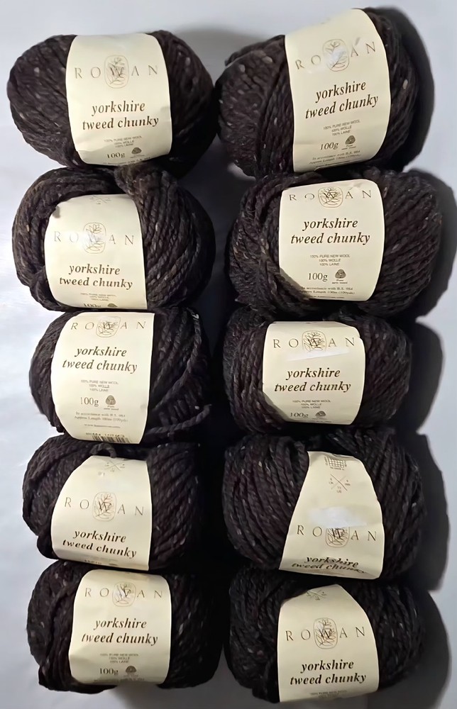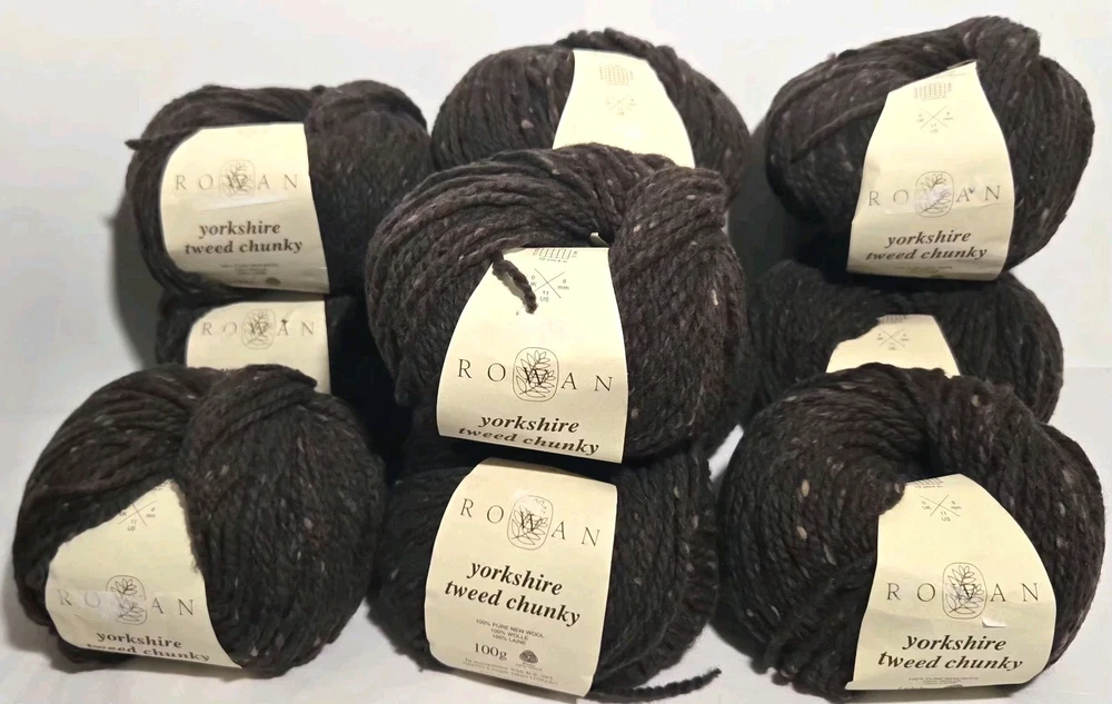 RARE & Discontinued: Vintage Rowan Yorkshire Tweed Chunky Yarn - Colour 554 Stout (Dark Brown) This is a listing for a lot of ten (10) new, highly sought-after skeins of Rowan Yorkshire Tweed Chunky yarn. This rustic, classic yarn is made from 100% Pure New Wool and features the characteristic colorful tweed flecks. It is a discontinued product line, making this bulk lot a valuable find for knitters and collectors. YARN DETAILS: ▪︎Brand: Rowan ▪︎Line Name: Yorkshire Tweed Chunky ▪︎Dye Lot: 6C3 (All 10 skeins are from the same dye lot to ensure consistent color variations across the lot. ) ▪︎Color: 554 (Stout / Dark Brown Tweed) ▪︎Origin: Made in the UK ▪︎Fiber Content: 100% Pure New Wool ▪︎Condition: New and unused with original labels. Stored safely away from all elements in a smoke-free, pet-free, and fragrance-free home. SKEIN & LOT DIMENSIONS: ▪︎Weight Class: Super Bulky / Super Chunky (#6) ▪︎Unit Weight (per skein): 100g / 3.5 oz ball ▪︎Length (per skein): approx. 100m / 109 yds ▪︎Total Lot Weight: 1000g (1 kg) ▪︎Total Lot Length: approx. 1090 yds TECHNICAL GAUGE: ▪︎Recommended Needles: 8.0mm (USA 11) ▪︎Tension/Gauge: 12 stitches = 10cm (4") in stocking stitch ▪︎Garter Stitch Gauge: 11 stitches & 24 rows = 4" in garter stitch CARE INSTRUCTIONS: ▪︎Gentle hand wash only ▪︎Dry flat in shade ▪︎Do not tumble dry or dry clean WHY BUY THIS YARN? ▪︎Rarity: Secure a large bundle of this classic, retired UK-made wool yarn line. ▪︎Quality: Experience the warmth, durability, and rustic texture of pure new wool. ▪︎Bulk Lot: Enough yardage to complete a significant project like a large sweater, cardigan, or blanket. Opportunities to secure this much rare, vintage Rowan Yorkshire Tweed Chunky yarn are fleeting; click "Buy Now" to claim this perfect bundle for your next cozy project today!