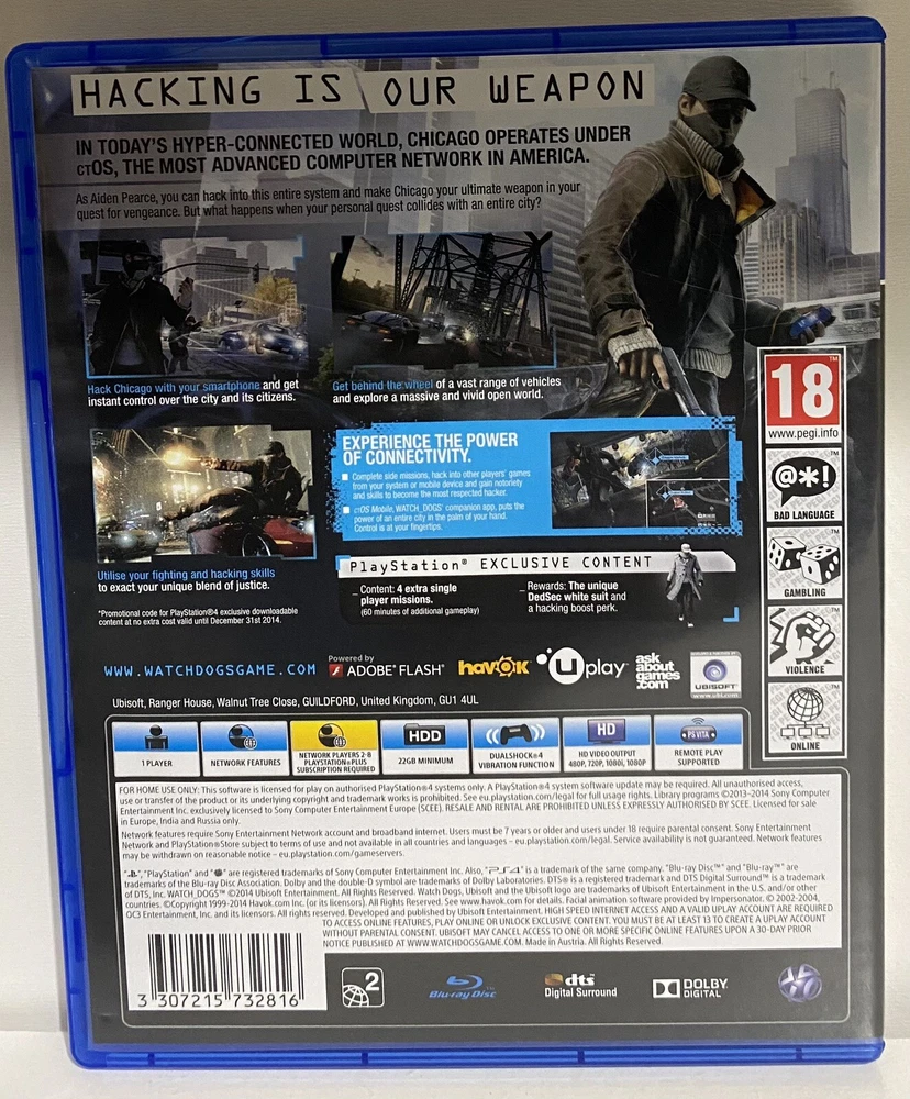 Embark on an exhilarating journey with the exclusive Watch Dogs (PS4) Exclusive Edition, a game that seamlessly blends action and adventure in a rich, immersive open world. With a PEGI 18 rating, this title promises intense gameplay that's packed with thrilling elements such as fighting, shooting, and survival horror. Whether you're plotting crime or engaging in intense battles, the game's diverse genres ensure that there's something for every gamer. The rarity of this edition makes it a coveted item for collectors and gaming enthusiasts alike. It comes with a multitude of features including the original manual, multiplayer capabilities, and online playability. With a platform that offers stunning graphics and a captivating storyline, the Sony PlayStation 4 is the perfect vessel for this adrenaline-fueled adventure. 😊😊 PLEASE SEE OTHER ITEMS, I M LISTING THIS FROM A MEGA NERF LOT - I WILL BE LISTING NERF PISTOLS, RIFLES, ACCESSORIES, ETC - NERF RIVALS WHITE/RED, ACCUSTRIKE, TERASCOUT, RAMPAGE, ZOMBIE ETC m, VIDEO GAMES (NINTENDO GB, DS,WII, PSP) - HOT-WHEELS 100S, TECH DECKS, MATCH BOX, MUSCLE MACHINES, FUNKO POPS, TOYS, PLUSH, BOARD GAMES, DVDS, CDS, BLURAYS PUZZLES, LEGOS, ETC FREE SHIPPING ⭐️⭐️⭐️⭐️ PROCESSING TIME: 3 DAYS I HAVE ALMOST 100 FUNKO POPS FROM VARIOUS SETS TO INCLUDE: MASTERS OF THE UNIVERSE, STRANGER THINGS, MARVEL, DISNEY, JUMBO SIZE ETC - PLEASE SEE STORE - FAST FREE SHIPPING - I WOULD BE WILLING TO COMBINE SHIPPING FOR MULTIPLE ORDERS - I HAVE MANY ITEMS PER SET - ITEM: - WATCH_DOGS PS4 EXCLUSIVE EDITION - 18 PEGI - DATE: N/A FUNKO NAME : N/A # : N/A SPECIAL EDITION ? - PS4 EXCLUSIVE EDITION - DESCRIPTION: - EXCLUSIVE - DAMAGED TOP CASE - VERY GOOD DISC - RETRO/ VINTAGE - PREOWNED ITEMS MAY SHOW SIGNS OF SHELF WEAR DUE TO THE NATURE OF AGE. THANKS MUCH FOR YOUR SUPPORT MY DEAR CUSTOMER ⭐️🙏