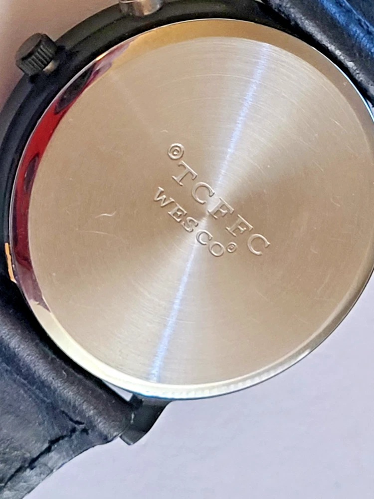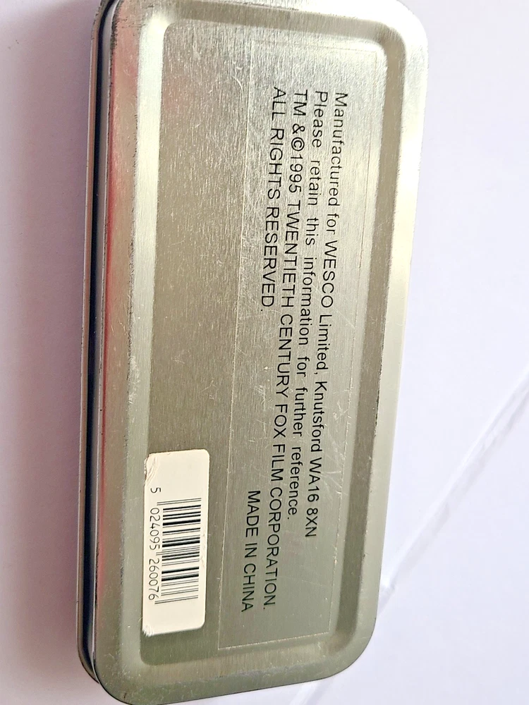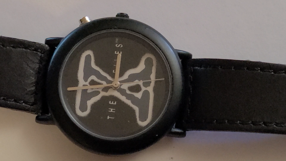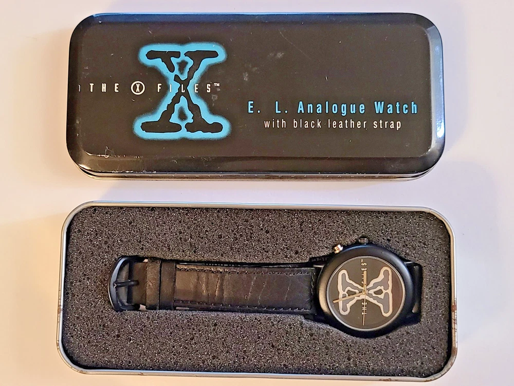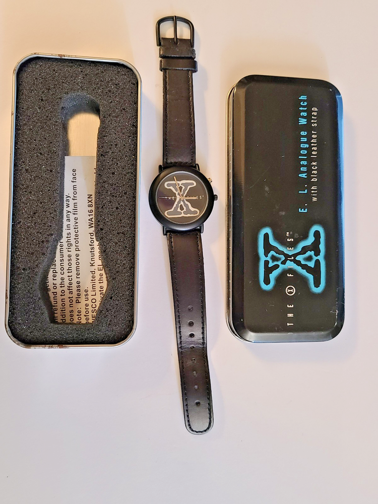Here's another fabulous collector's timepiece for character watch fans ~ an original X-Files glow-in-the-dark watch from Wesco, manufactured in the United Kingdom in 1995 and official licensed merchandise for 20th Century Fox. This is a highly sought after collector's item that is almost impossible to find in this excellent condition. This is the original E.L. (Electro-Luminescence) watch that lights up the X-Files logo on the watch face with a cool blue glow! Running strong with a new battery professionally placed. This beauty ships in its original X-Files Wesco tin with papers. FREE SHIPPING! Watch measures 9" from end to end. 1-3/8" wide watch case. Stainless steel caseback. Black dial with The X-Files logo in dial center; logo glows when E.L. is activated. Black crown and steel light activation button. Black leather strap. Ships in original case with papers. Excellent condition, running strong. I can see some white dots when I take closeups of the watch face but couldn't see them with the naked eye. They might be dots of color loss on the black dial as they show up in all the pictures. Protect yourself and your money! You work hard for your dollars, don't give them away to just anybody. We have been trusted eBay sellers for almost 25 YEARS and our feedback reflects the high level of customer satisfaction you can expect from us! We do not use AI for anything in our ads, including text or pictures. Read your auctions carefully before bidding. We NEVER ship out watches that aren't running or need batteries (unless stated otherwise in ad, such as with a vintage watch or one sealed in original packaging). And all of our items are official merchandise from the licensed manufacturer, not cheap knock-offs. Please note that all pictures and ad content are COPYRIGHT and may not be used without permission. We have a generous return policy! When you buy from someone listing a watch that "just needs a battery" or sold "as is", check their return policy! If you receive an item that is not working you will be stuck with a non-working watch. Our watches have a new battery professionally placed before shipping, unless the item is still in original packaging and needs a battery. SMOKE-FREE ENVIRONMENT