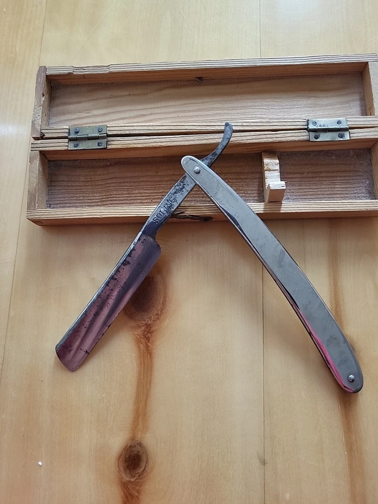 This is a handmade straight razor made in Solingen, Germany by Rasiermesser SOLINGEN. It is a high-quality grooming tool for shaving. there is some rust on the blade. see pictures.