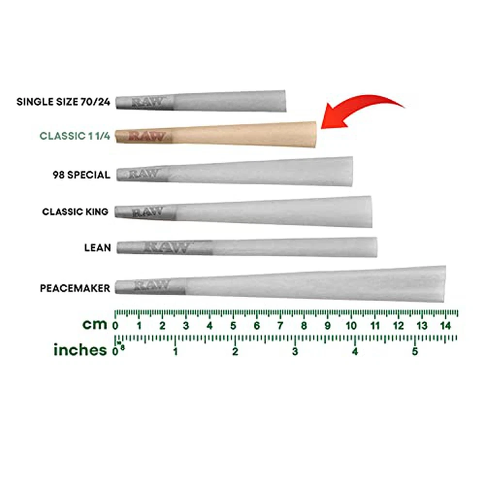RAW Cones Classic 1 1/4 Size: 150 Pack Product Overview Cone Size: 1 1/4 Size - 83mm / 3.25 inches Size: 150 Pack + Tube Featured Refinements: Raw Cone Country/Region of Manufacture: Indonesia Brand: RAW EAN: 0856881008488 UPC: 856881008488 MPN: 856881008488 100% GREEN BLAZER SATISFACTION GUARANTEE: The Green Blazer is an authorized Raw distributor in partnership with the RAW brand. We will fully refund any customer not 100% satisfied with their purchase no questions asked. What do you have to lose? Add to your cart now!
