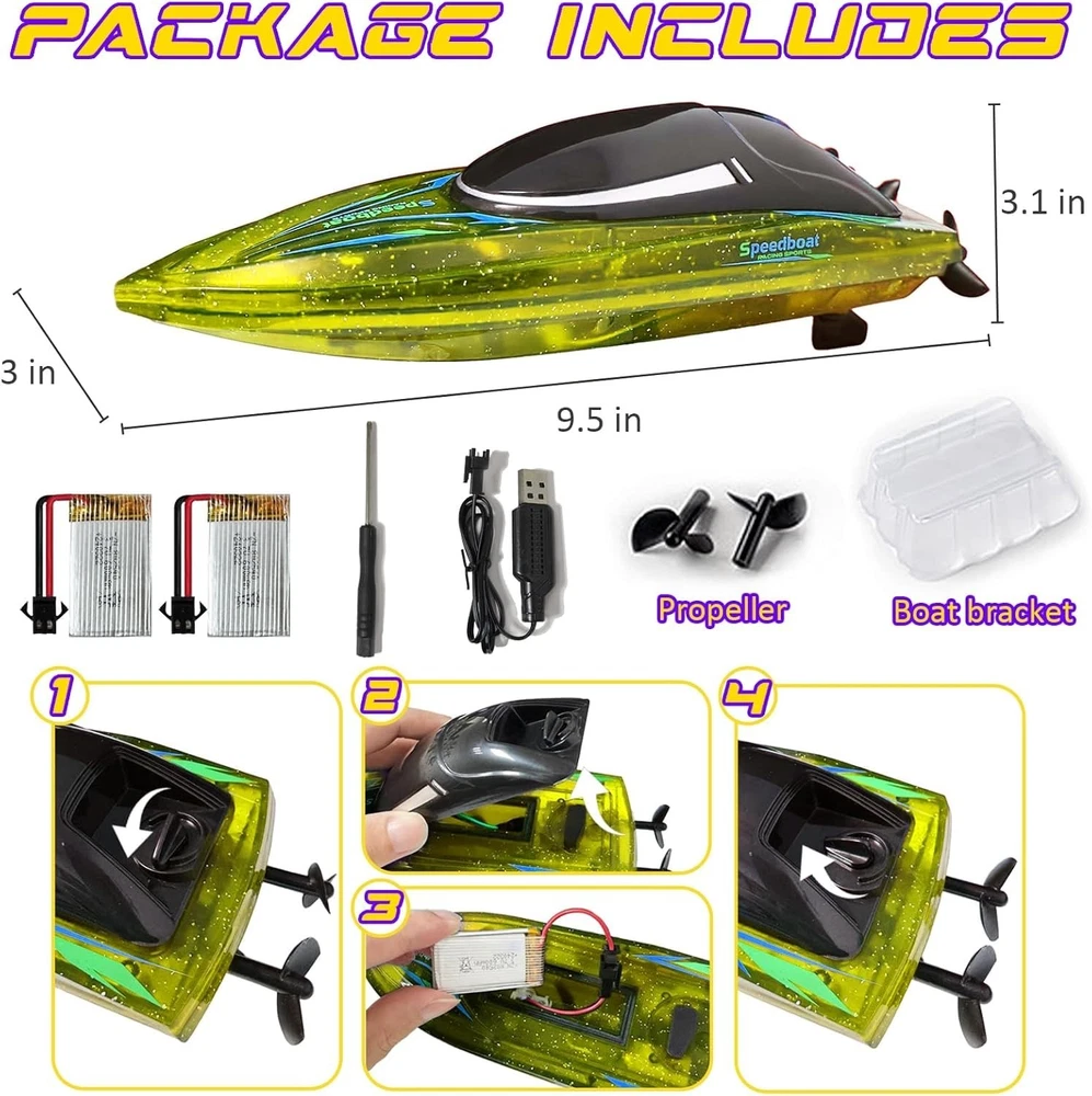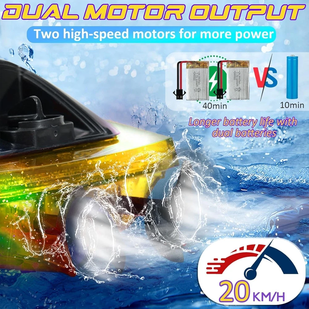 MODLE 1 High - Speed Thrills: Experience an exhilarating ride with this 2.4GHZ RC boat, capable of reaching speeds up to 30KMH. Perfect for both adults and kids aged 8 - 12, it offers endless high - speed fun on pools and lakes, providing an exciting water adventure every time. Eye - Catching Design: Stand out on the water with the built - in LED lights that illuminate the boat, creating a stunning visual display during both day and night play. The vibrant lighting adds a magical touch to your water play sessions. Ultra-Long Battery Life: Double your playtime with 2 rechargeable batteries—get up to 60 minutes of non - stop fun! This remote control boat’s extended battery life ensures long - lasting aquatic adventures, while its rugged design guarantees durability through countless high - speed races on pools and lakes. All - Round Compatibility: This remote control boat is designed for versatile use in various water bodies, from backyard pools to expansive lakes. Its 2.4GHz frequency ensures stable and interference - free control, allowing multiple boats to race simultaneously. Great Gift Choice: Whether for boys or girls, this RC boat makes an excellent water play toy gift. It combines entertainment and excitement, making it a memorable present for birthdays, holidays, or any special occasion for kids and adults alike. MODLE 2 【200ft Long-Range 2.4GHz Control】The advanced 2.4GHz remote technology ensures interference-free operation within a 200ft radius, providing stable signal transmission for confident navigation across lakes, ponds, and swimming pools 【2 Rechargeable Batteries for RC Boat】Equipped with two 3.7V 600 mAh rechargeable batteries for your remote control boat, allowing continuous fun by swapping batteries. Enjoy up to 40 minutes of runtime while the spare battery charges, eliminating long waiting periods 【2-Speed Modes & 20km/h High Velocity】Experience thrilling aquatic adventures with our RC boat's dual-speed control. Switch between beginner-friendly low speed for precise maneuvering and pulse-racing high speed reaching 20km/h for adrenaline-charged performance 【Full Waterproof Protection】Built with complete waterproof electronics compartment and IPX5-rated hull design, this remote control boat withstands splashes, light rain, and accidental submersion for worry-free water adventures 【Smart Auto-Shutoff Safety Feature】Integrated water exit detection automatically stops propeller rotation when the boat leaves water surface, preventing motor damage and ensuring operational safety during retrieval 【Cool LED Lights】The RC boat has three light modes, you can set your favorite light, and you can see your RC boat clearly at night 【Low Battery Warning】When the power of the RC boat is too low, it will trigger the insufficient power alarm function to return the boat to its original position 【Anti-capsize】The RC boat has anti-capsize function, you don't need to worry about the boat capsizing during the entertainment process, the RC boat can recover by itself