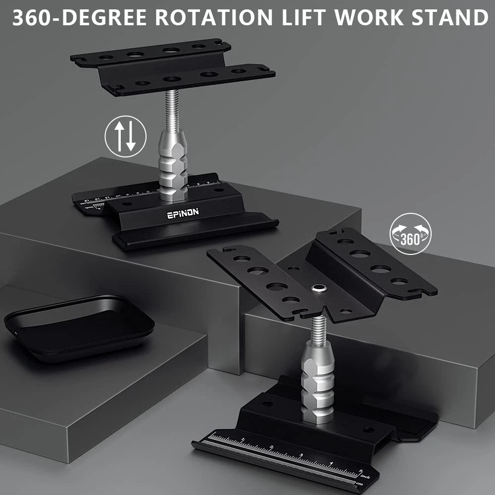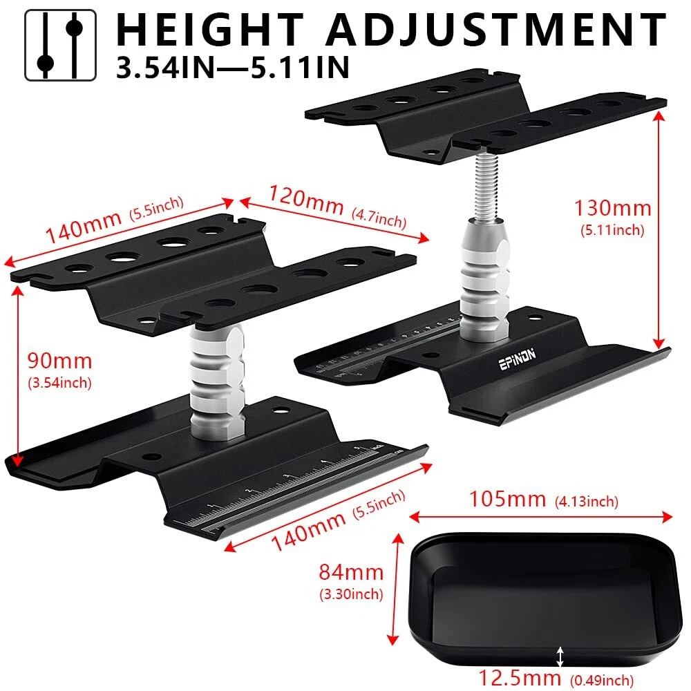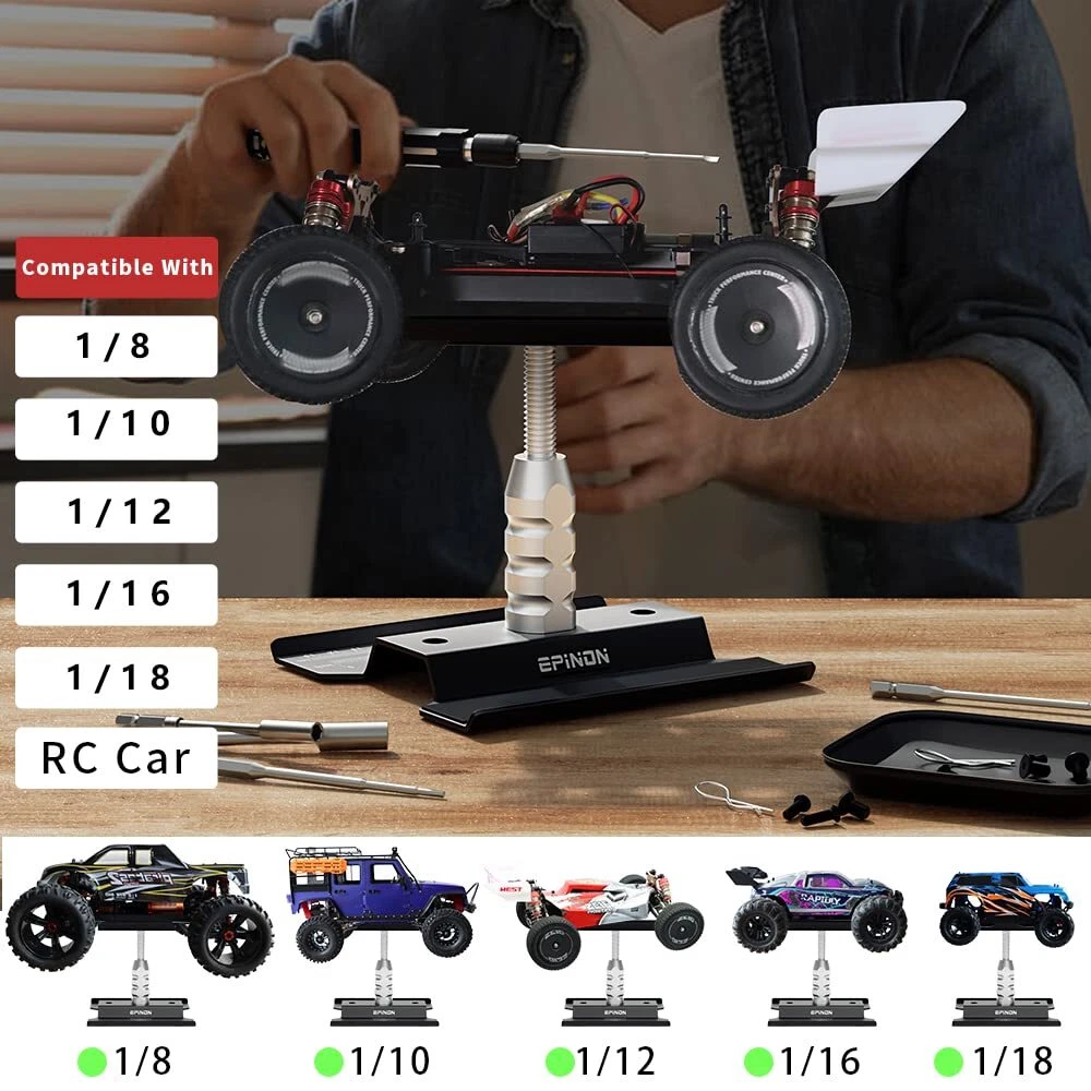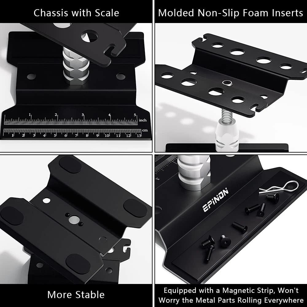 Specifications: Item Name: Aluminum RC Car Repair Work Station Color: Black Material: Aluminum Alloy Height: Adjustable from 3.54" (90mm) to 5.11" (130mm) Width of Top Plate: 4.72"(120mm) Length of Top Plate: 5.51"(140mm) Weight: 250g Package List: 1 × RC Repair Stand 6 × RC Screwdrivers 2 × Hex Nut Screwdrivers 1 × Screws Pallet 1 × Tweezer 【RC Car Work Stand Compatibility】Suit for 1/8 1/10 1/12 1/16 1/18 Scale brands RC trucks crawler buggies, suit for Slash Arrma Redcat Axial FMS RC4WD Tamiya Kyosho Globact Wltoys, etc. 【360-degree Rotation】360-degree rotation, chassis with scale, you can measure the length of the parts, equipped with a magnetic strip, won't worry about the metal parts rolling everywhere. 【Adjustable Height】RC work stand can adjust the height from 3.54in to 5.11in, a repair stand with an adjustable height function allows you to find a comfortable position to repair your car model. 【Complete RC Tool Bag】 Contains screws pallet, tweezers, and screwdrivers (hex H1.5/2.0/2.5/3.0mm, 3.0mm phillips, slotted 3.0mm, 5.5/7.0mm hex nut screwdrivers ), meet all your needs. 【What You Get】1 × RC repair stand, 6 × RC screwdrivers, 2 × hex nut screwdrivers, 1 × screws pallet, 1 × tweezer, It meets all your needs for repairing remote control cars, can be given as a gift to friends who like remote control models.