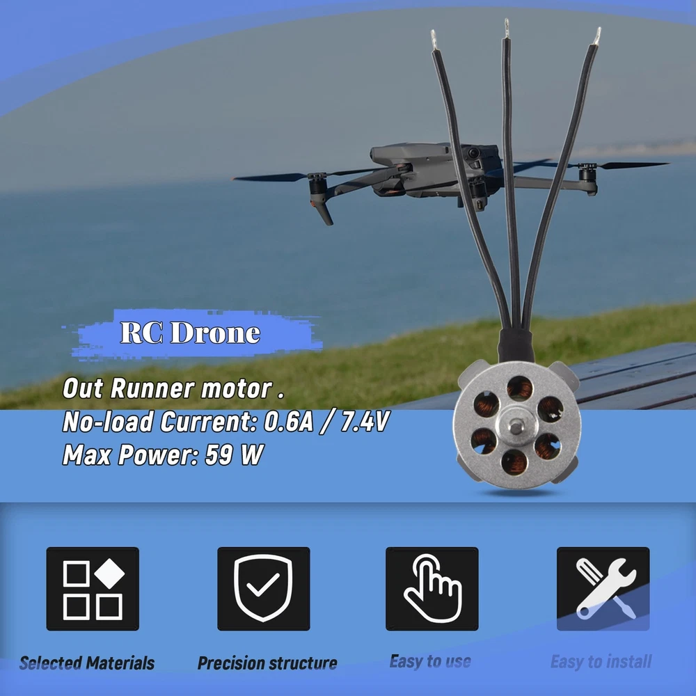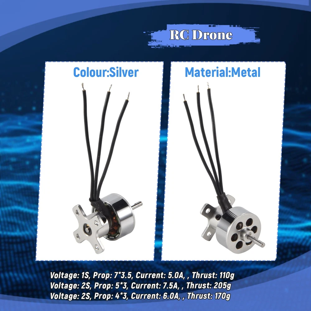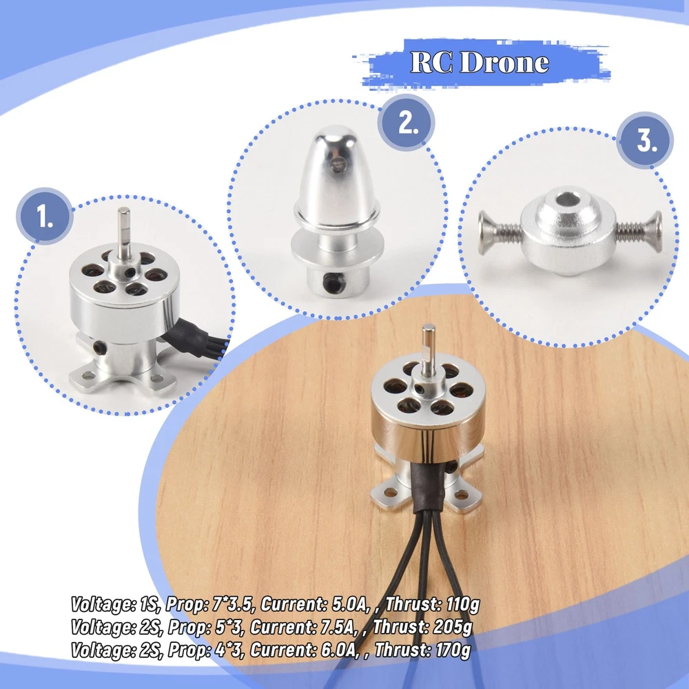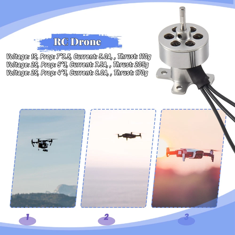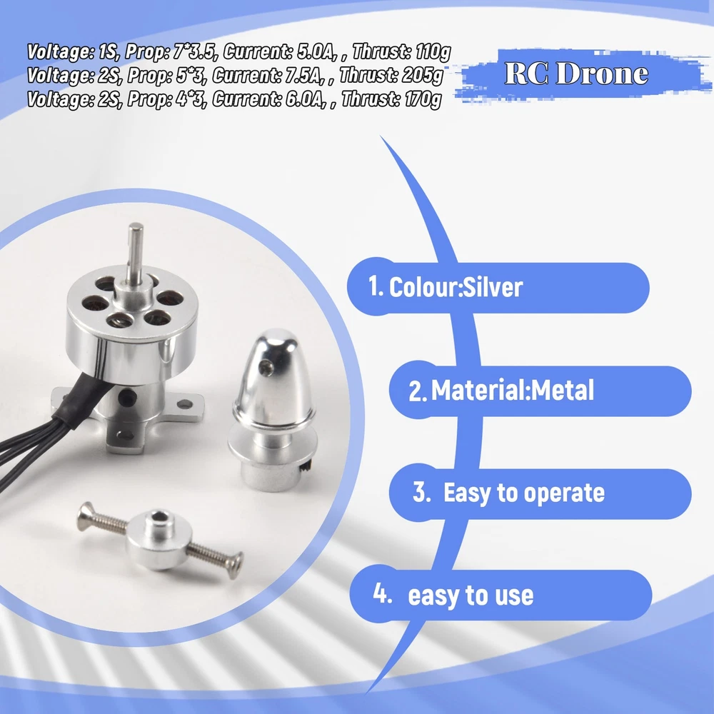 RC Drone Accessories 10G Brushless Motor Out Runner 1811 3800KV for Radio3781 Voltage: 1 - Test Data of 1811-3800KV No-load Current: 0.6A / 7.4V Max Power: 59 W Voltage: 1S, Prop: 7*3.5, Current: 5.0A, , Thrust: 110g Voltage: 2S, Prop: 5*3, Current: 7.5A, , Thrust: 205g Voltage: 2S, Prop: 4*3, Current: 6.0A, , Thrust: 170g Colour:Silver Material:Metal Size:18*18*30mm Motor Diameter: 17.5 mm Motor Length: 21.8 mm Total Length: 29.8 mm Shaft Diameter: 2.0 mm Package Contents: 1 * Motor 1 * wrench 1 * 1 * apron 1 * accessories Only the above package content, other products are not included. Note: Light reflection and different displays may cause the color of the item in the picture a little different from the real thing. The measurement allowed error is +/- 1-3cm.