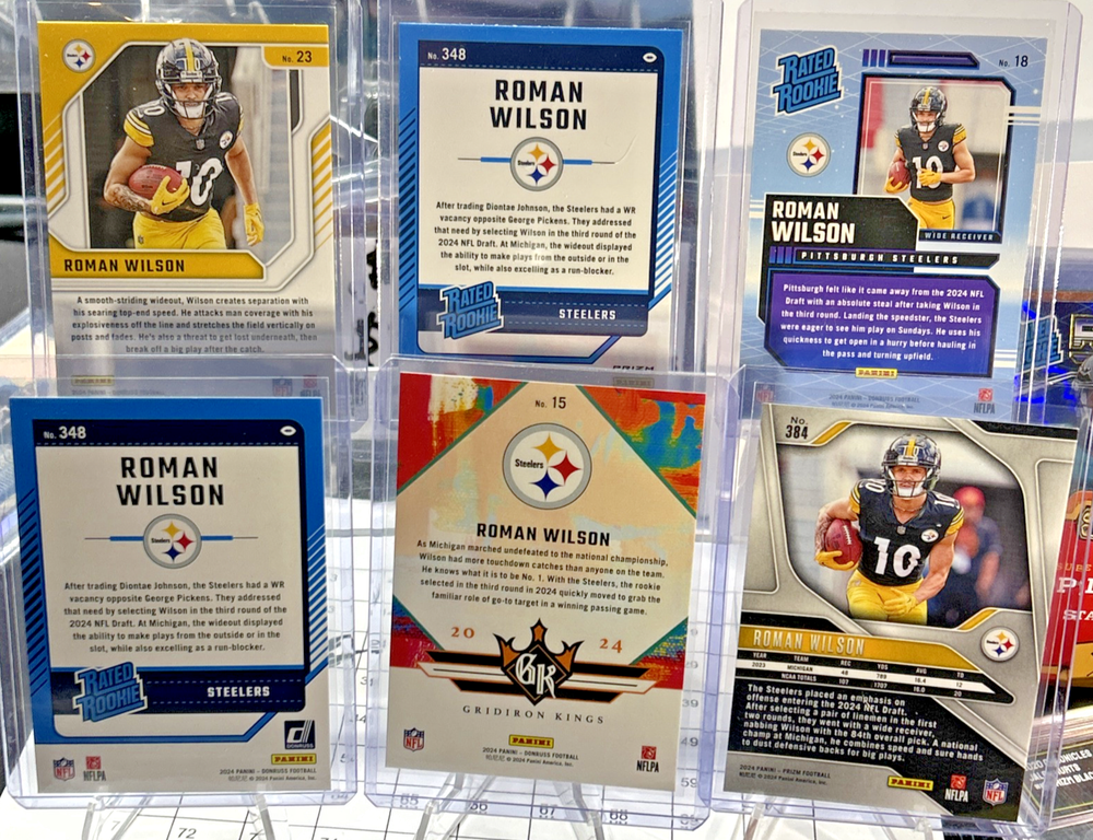 The product is a lot of six trading cards featuring Roman Wilson, a rookie player, from the 2024 Donruss Optic Red Pandora/Retro Rated Rookie series. Manufactured by Panini, the cards are part of the National Football League (NFL) collection and highlight the player Payton Wilson. ALL CARDS SOLD AS-IS NO RETURNS