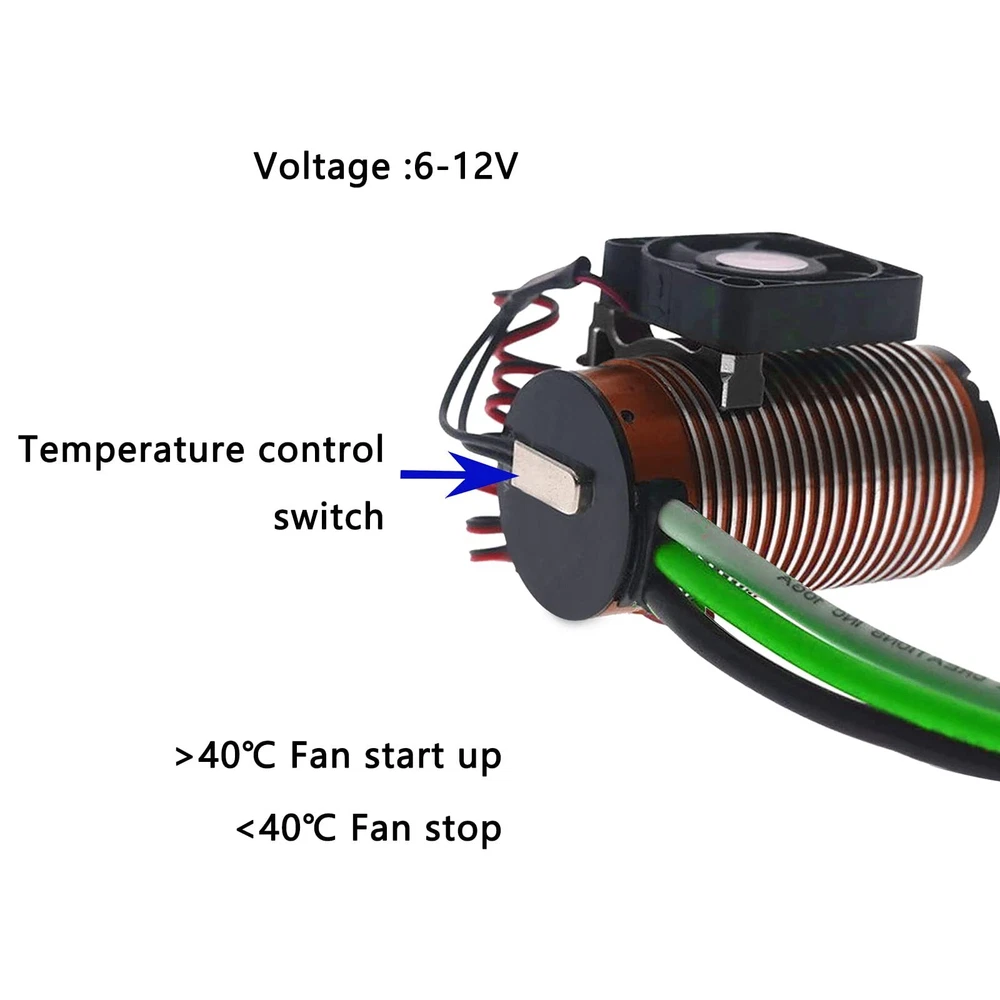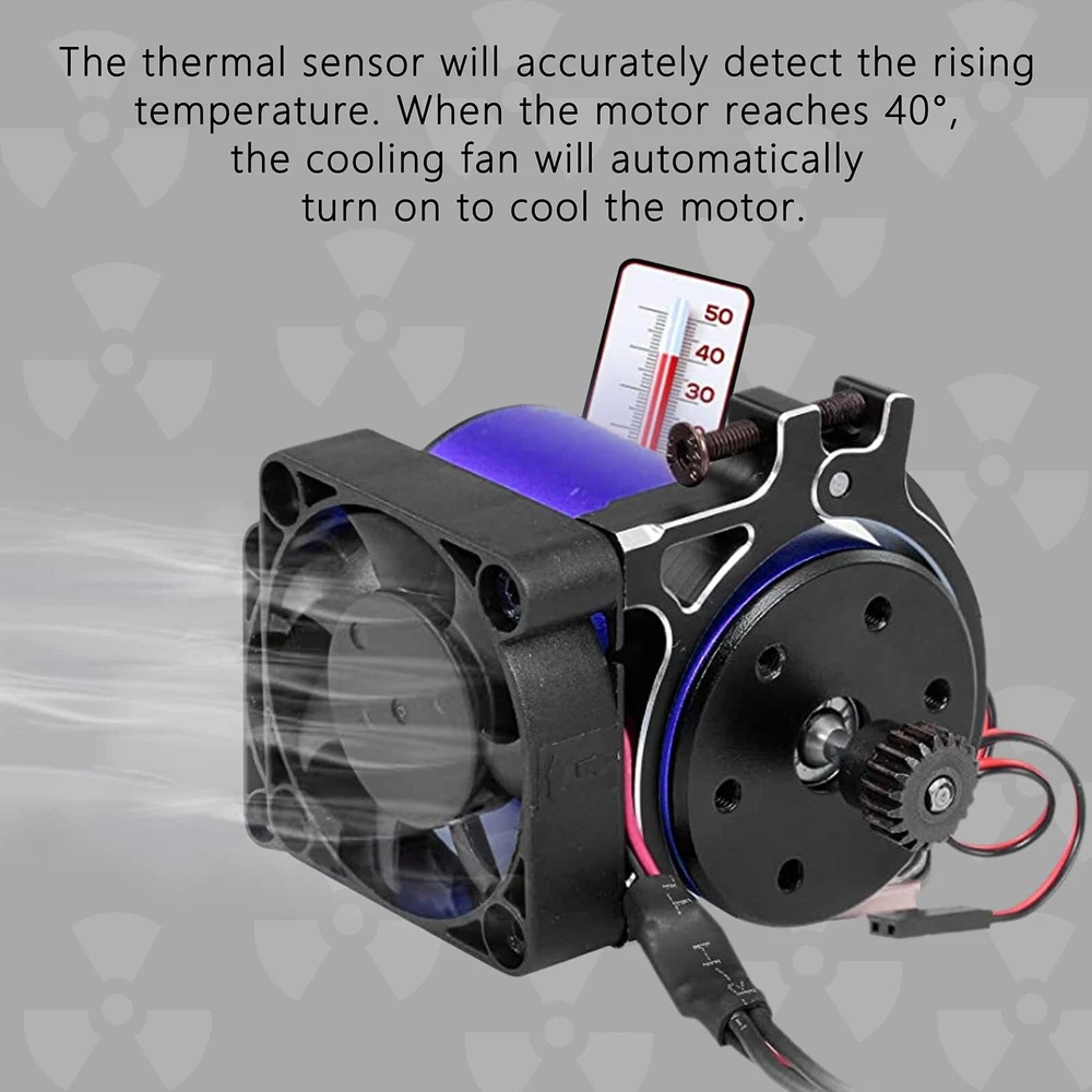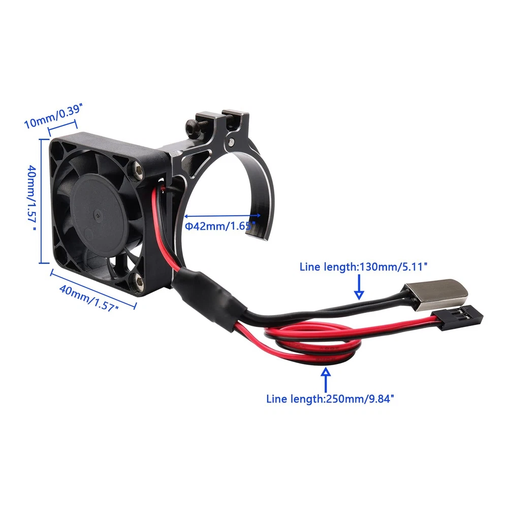 Specification: Material: Aluminum alloy, plastic. Fan input: 5-12V Fan size: 40mm×40mm Clamp suitable for: 42mm Motor Features: Great value RC motor heatsink set, easy to Install. Keep your temperatures in check and your motor running efficient and cool with our cooling fan. Application: Fit for 42mm Size Brushed / Brushless Motors, Such as 4076 / 4268 / 4274 / 1512 / 1515 / TENSHOCK 812 / K80 / K82 / Hobbywing 4274 / Leopard / 4274 / 4282 etc. Package Included: 1×Motor Cooling Fan w/ Clamp 1×Hex Key Work on 42mm Size Brushed / Brushless Motors, Such as 4076 / 4268 / 4274 / 1512 / 1515 / TENSHOCK 812 / K80 / K82 / Hobbywing 4274 / Leopard / 4274 / 4282 etc. Compatible with Traxxas E-Revo Summit UDR TRX-4 SCX10 Arrma Losi 1/10 1/8 Buggy Truck or Rock Crawler Electric Motors Build-in a Thermal Sensor, The Cooling Fans Will Start to Work When Motor Temperature is Above 40 Celsius Degree The Fan Speed Can Reach up to 10000 RPM, Excellent Heat Dissipation to Make Your Motor Run Efficiently 5V-12V Voltage Input - Powered By Any Spare Receiver Port