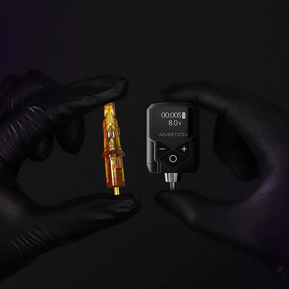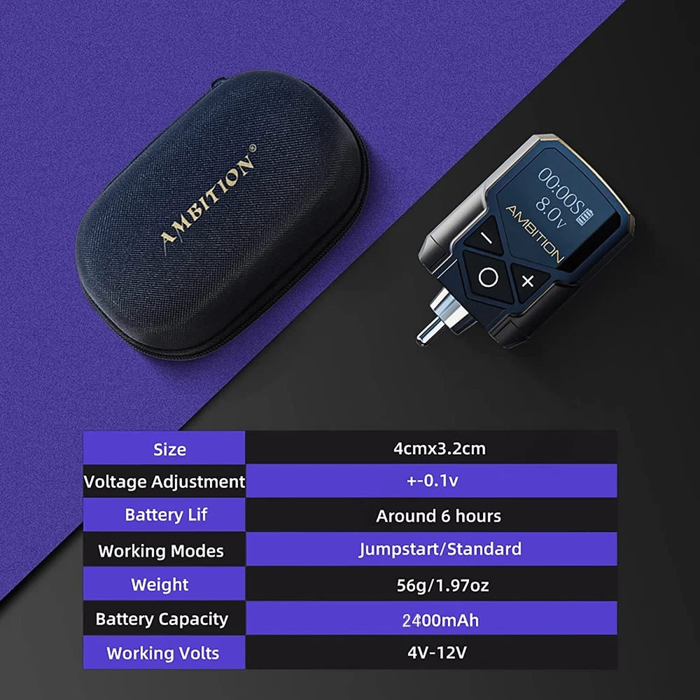 Descriptions: Material: Ambition Tattoo Power Supply made of aluminium alloy frame and high quality acrylic, the size is small, light weight(57g/2oz), length: 1.49inches, width: 0.98inches, easy to carry so that you can do tattoo work outdoors. High-quality Lithium Battery: The wireless tattoo power supply capacity is 2400mAh, the working voltage is 4-12V, the adjustment is ±0.1V. Fast charging, can be full state in 2 hours.The LED screen displays the working voltage, working time and remaining power. Support Jumpstart: 12V jumpstart function,double-click the power button to turn on(J)/turn off(S) the jumpstart, support your machine to defeat the stiffest of cartridge needle membranes. Compatible with most RCA tattoo machines. Long-lasting Power Pack: Under normal 8V voltage, the voltage stable state can last for 6 hours,long time working the voltage is stable. More convenient and quick to adjust the output voltage. Suitable for most brands of tattoo pens machine, liner and shader. Features: The simplicity and portability opration of Ambition wireless tattoo power will help you to conquer your tattoo. Material : aluminium alloy+high quality insulating plastic+silicone keys. Connector :RCA Battery Capacity: 2400mAh Charging time : About 2 hours Operation time : Under normal 8V voltage, the voltage stable state can last for 6 hours,long time working the voltage is stable. Output voltage : 4-12V, ±0.1V LED display content: output voltage range + battery usage+working time Instructions for use: Power ON/OFF: Long press "O" key for 3 seconds Output pause / resume: Short press "O" key to pause the output, and short press it again to resume the output (the resume voltage is the working voltage before the pause). Adjust output voltage: Press the "+" or"-" key to adjust output voltage. 12V jumpstart function,double-click the power button to turn on(J)/turn off(S) the jumpstart. Power: The LED display will show the remaining power, and the full power will display 4 divisions. Fast charging through the matching fast-charging cable can usually be fully charged in 2 hours. Please pay attention to the change of power at any time to prevent sudden power loss from affecting your tattooing work. Package Include: 1x Wireless tattoo power 1x tattoo power cable 1x storage zipper box SKU# Shipping Weight: 7oz Net Weight: 5.71oz MC.BD.314 2 - PADDED FR ENVELOPE 4 - REGIONAL BOX A 10 - MEDIUM FR BOX