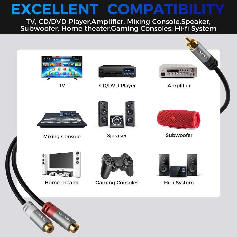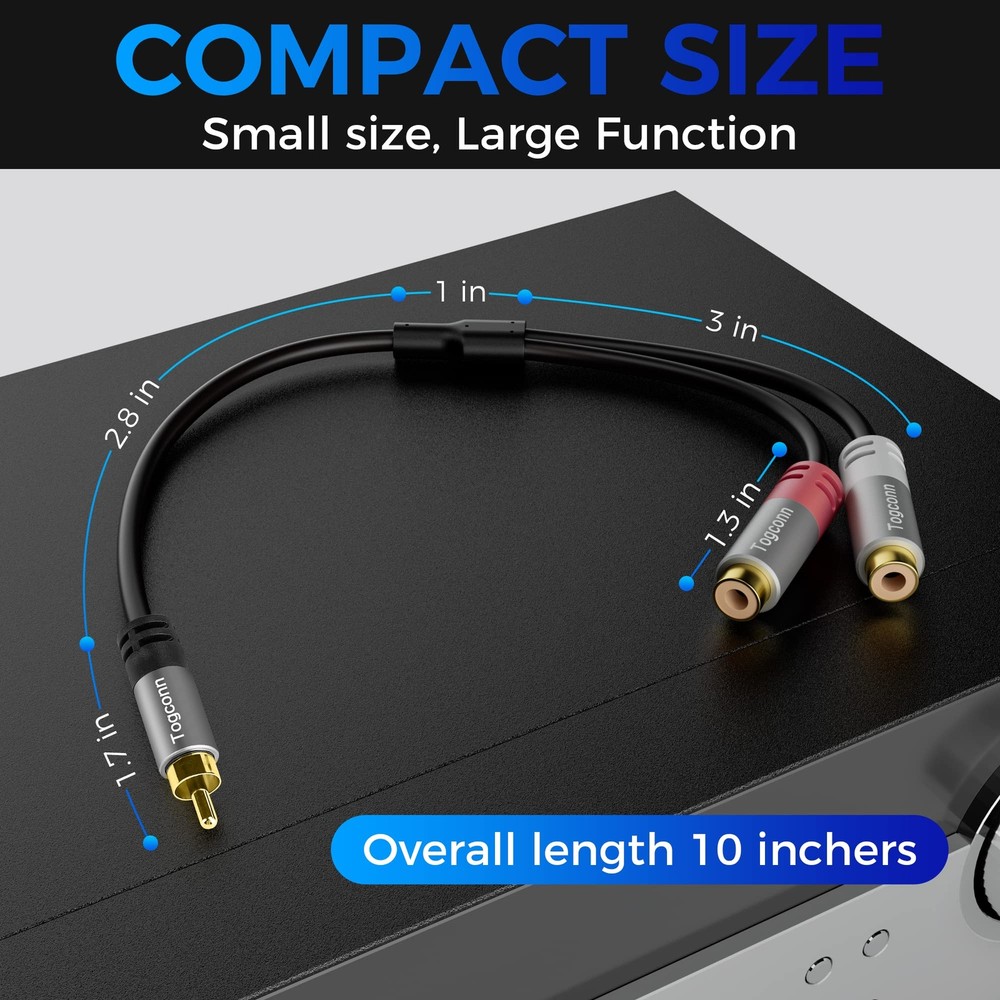 RCA Y-Adapter Splitter cable 2Pack,1 RCA Male to 2 RCA Female Stereo Audio Video Subwoofer Car Audio Cable Y Splitter Adapter Extension Cord for Home Theater, Hi-Fi System, Amplifier, Speaker-0.6 Feet RCA splitter adapter with 1 RCA Male to 2 RCA Female plug stereo audio adapter extension cord connectors. It can be used to divide the mono signal source into 2 signals or combine stereo signal sources into mono signals. High-quality cable, adopts aluminium alloy shell and 24K gold-plated plugs, improved the durability and stability, ensures minimum signal loss transfer. Give you the perfect sound quality. The cable core is made of pure copper, foil shielding and high-quality PVC jacket, which greatly reduces EMI/RFI interference. Togconn Y splitter 1RCA male to 2RCA female cables are applicable to subwoofer, amplifier, TV, DVD player, car audio CD player and other equipment supporting RCA interface. What You Get : 2 pack high-quality RCA Y Splitter and 24 months free replacement service. If you have any questions about our product, please feel free to contact with our reliable customer service, we will reply you within 24 hours. RCA Y-Adapter Splitter cable 2Pack,1 RCA Male to 2 RCA Female Stereo Audio Video Subwoofer Car Audio Cable Y Splitter Adapter Extension Cord for Home Theater, Hi-Fi System, Amplifier, Speaker-0.6 Feet Shipping We offer FREE shipping on all orders! We ship within Three business days of payment, usually sooner. We use a selection of shipping services such as UPS, FedEx, USPS etc. We only ship to the lower 48 states, no APO/FPO addresses or PO Boxes allowed. Local pickups and combined shipping options are not provided at this time. Return You can return a product for up to 30 days from the date you purchased it. Any product you return must be in the same condition you received it and in the original packaging. Please keep the receipt. Payment We accept payment by any of the following methods: PayPal Please pay as soon as possible after winning an auction, as that will allow us to post your item to you sooner! Feedback Customer satisfaction is very important to us. If you have any problem with your order, please contact us and we will do our best to make you satisfied. Contact Us If you have any queries, please contact us via ebay. We usually respond within 24 hours on weekdays. Please visit our eBay store to check out other items for sale! Thank you for shopping at our store.