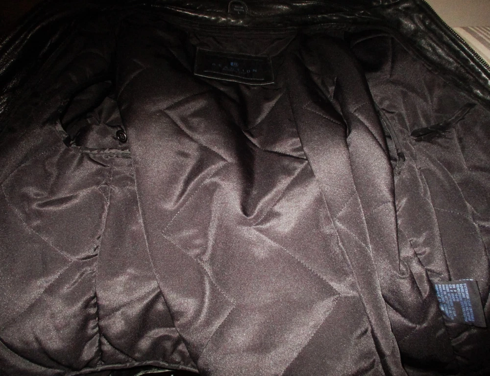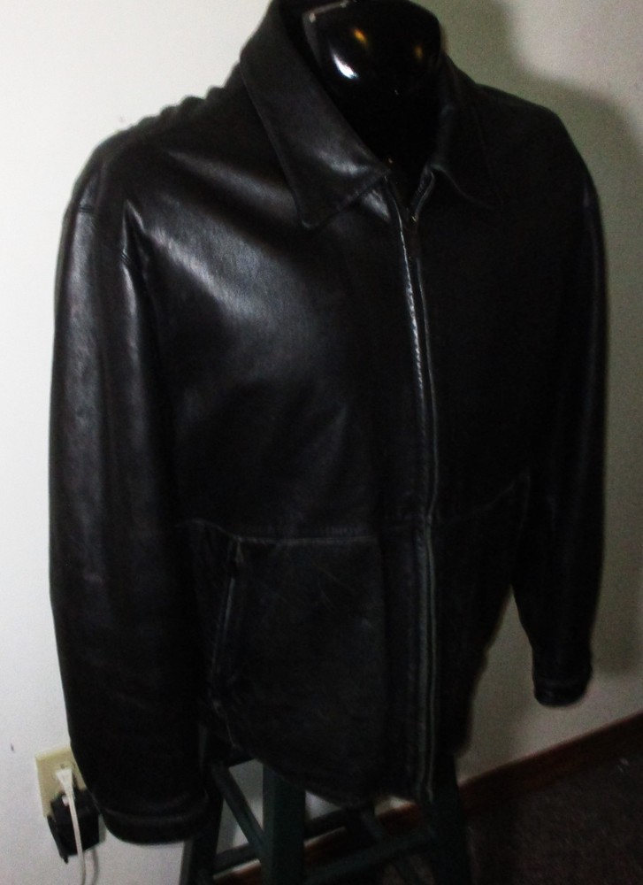 See my EBAY STORE at “SAMTPC53” to view 100’s more of my Men's JACKETS!!! Combine Shipping: (on multiple items you pay full price on heaviest item first and then HALF PRICE shipping on ALL other clothes items. Men's Full Zip Insulated 100% Leather Jacket . Brand: REACTION Kenneth Cole. Description: men's full zip "Year Round" REACTION Kenneth Cole insulated jacket, zipper removable lining with inside pocket, snap button cuffs, side pockets, see pics. Color: Black. Size: L (please see measurements). Measurements: 26" armpit to armpit, 23" back shoulders, 26" shoulder to hem, 20" insleeve. Material: 100% Leather, Lining/Filler- 100% Polyester. Condition: Very Good condition .