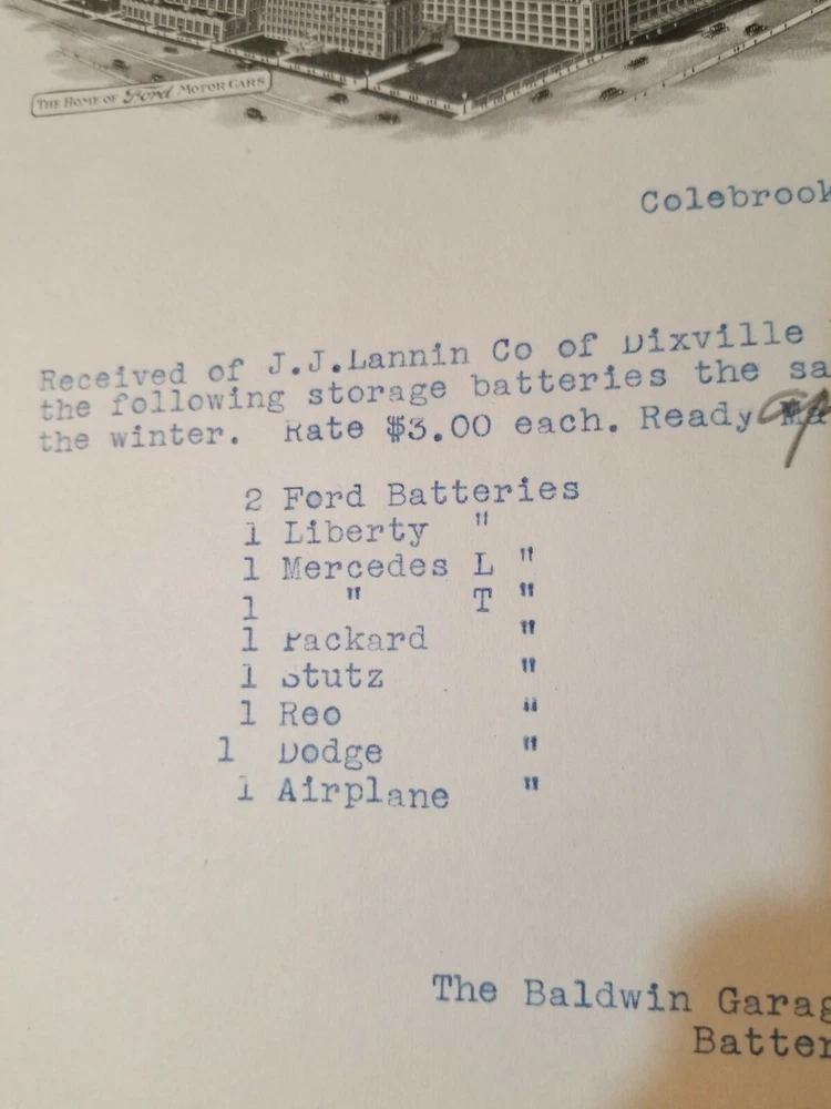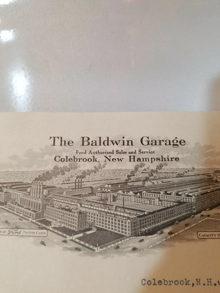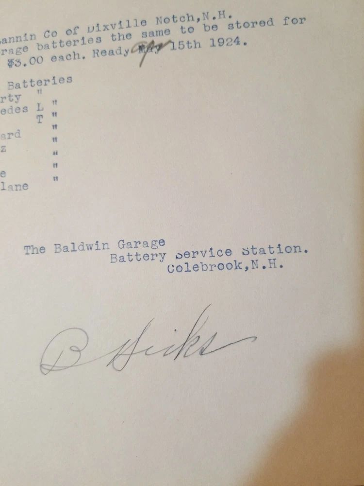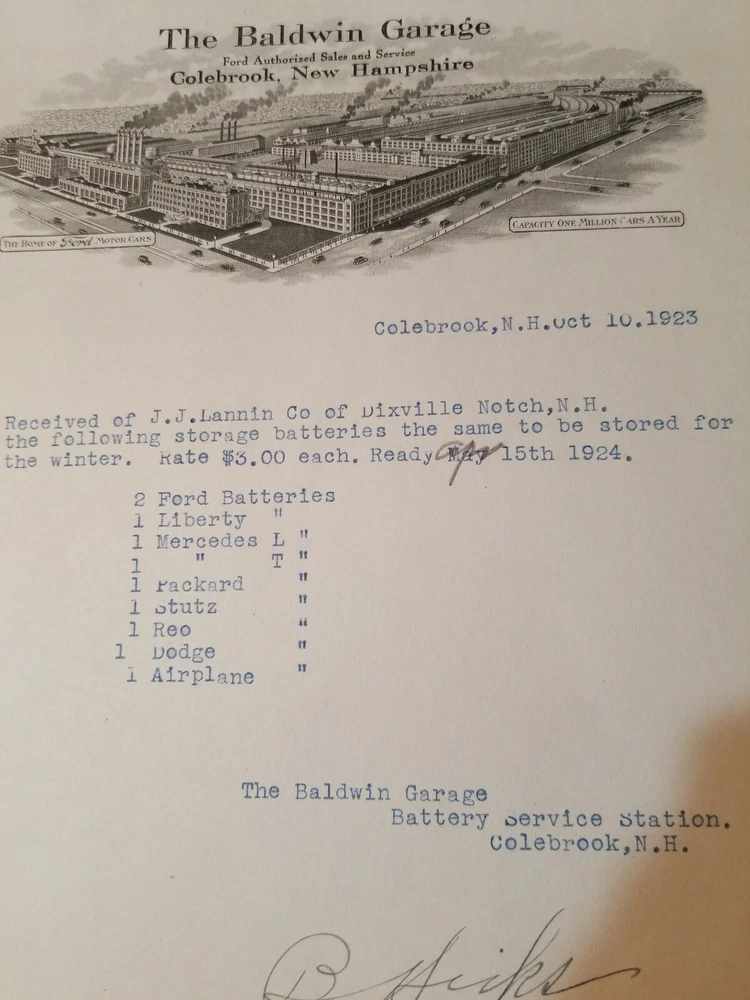 READ!! 1923 letterhead THE BALSAMS DIXVILLE NOTCH - BALDWIN GARAGE COLEBROOK NH . Shipped with USPS First Class Package. This is a letter/bill for battery storage for the vehicles owned by the Balsams. Interesting enough is the battery for an airplane. The Balsams at one time had a small fleet of planes that flew in from NY. I have actually seen the photos. Nice piece of history. Lannin co. Owned the Balsams.