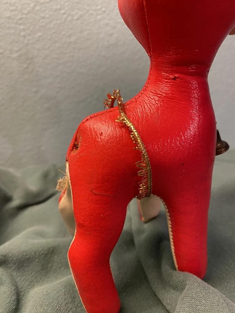 This vintage vinyl/leather stuffed reindeer deer toy is a perfect addition to your Christmas decor. Made in Japan, it exudes a charming and timeless appeal that is sure to capture the hearts of collectors and enthusiasts alike. Its smooth surface, combined with its durable and high-quality construction, makes it a great choice for kids and adults alike. The reindeer deer toy is suitable for ages 4 and up, and it is perfect for anyone who loves vintage and antique toys. Its character family is deer, and it is made in the United States. This toy is sure to bring joy and cheer to anyone who adds it to their collection. This toy shows its age, it’s missing its antlers and tail. Please see all pictures for condition.