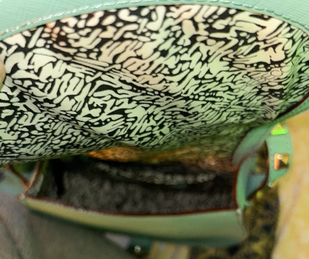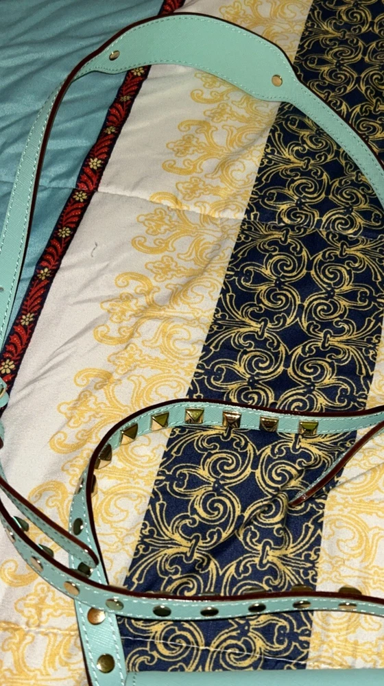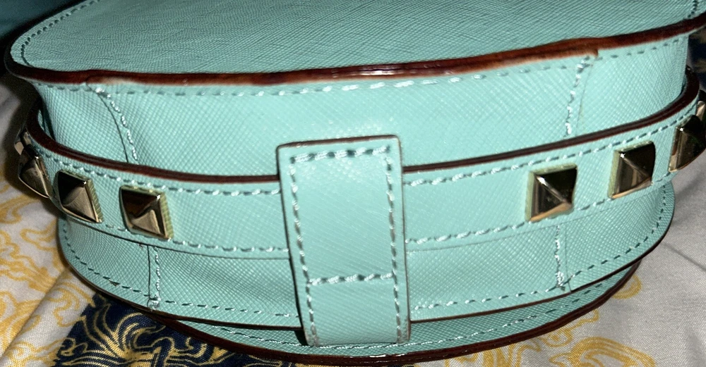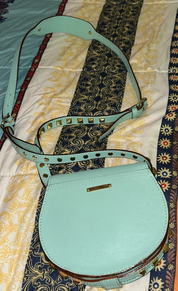 {{{{This purse has a few light tiny stains so it may need a good wipe-down but other than that it’s in pristine condition!! }}} Elevate your style with this beautiful Rebecca Minkoff Skylar Cross Body Handbag. The bag features a stunning turquoise exterior and a gold hardware color that adds a touch of elegance to your outfit. It has a magnetic snap closure that keeps your belongings secure and a laser cut in front, smooth finish in back that gives it a unique and modern look. The bag has a small size, measuring 4 inches in height and 7 inches in length, making it perfect for a day out or a night on the town. It has a detachable strap that allows you to carry it comfortably and an adjustable strap with a drop of 28 inches. The bag is made of high-quality leather and has a tan design lining material that complements the overall look of the bag. This Rebecca Minkoff Skylar Cross Body Handbag is a must-have for any fashion-forward woman.
