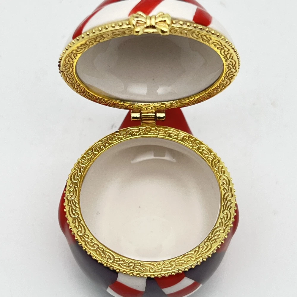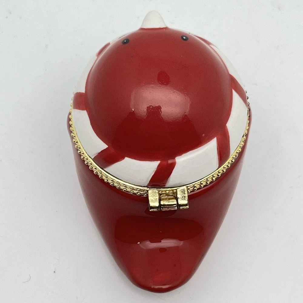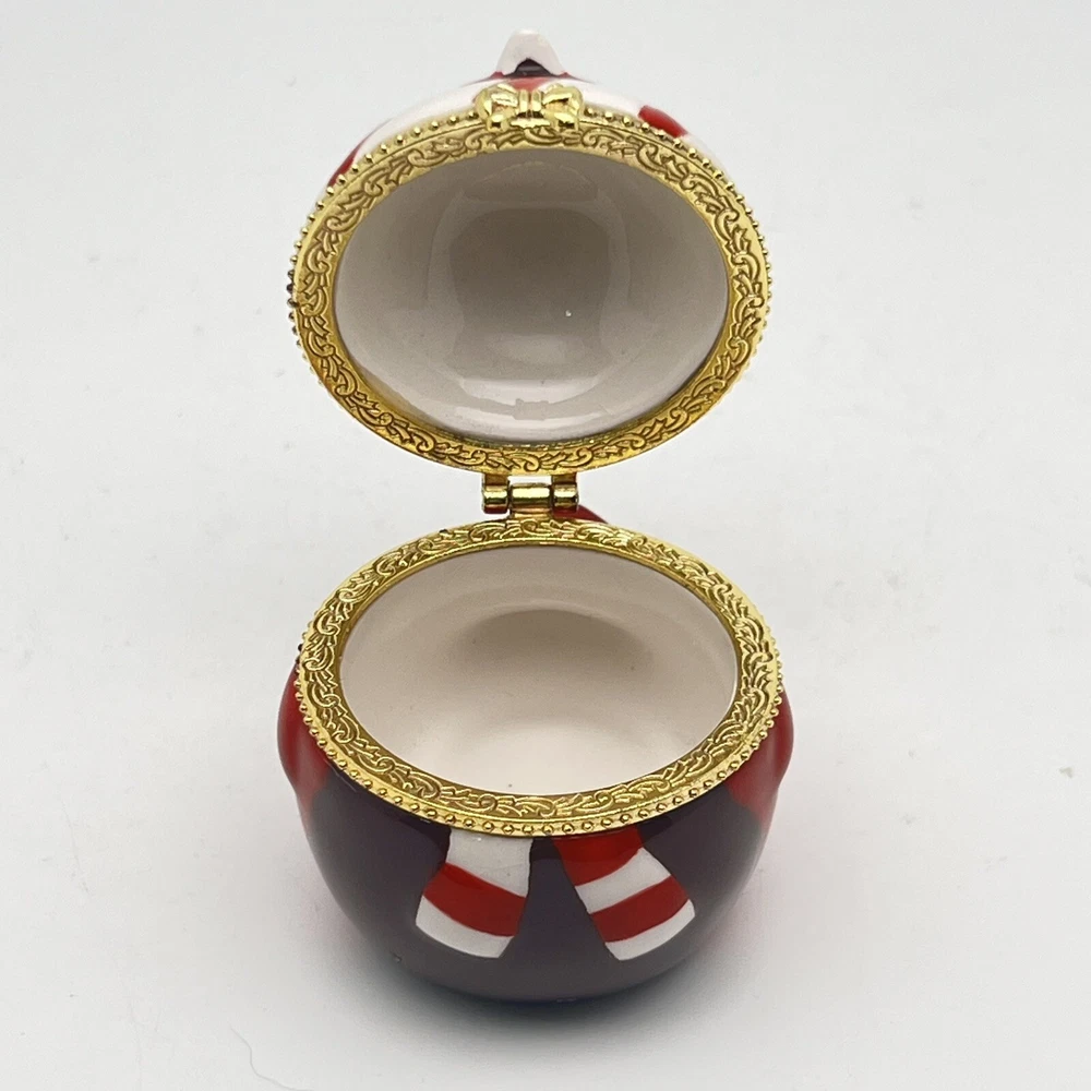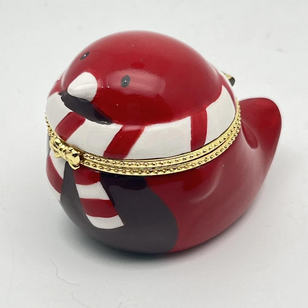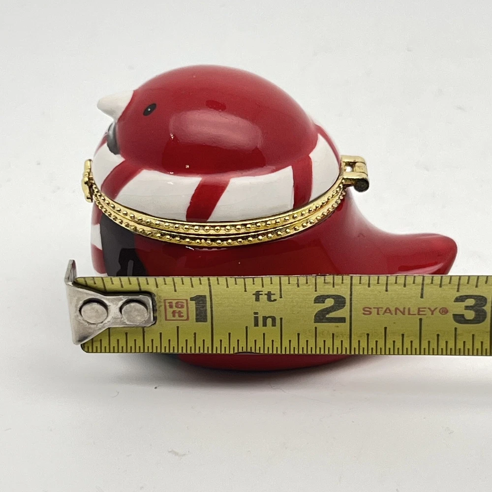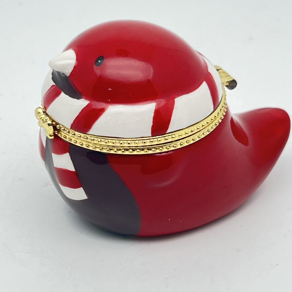 Hinge works great. There is a little tarnish on the gold- see pics. We pack safely and ship quickly. Please let me know if you have any questions and thank you for shopping with me!🌼 RED ROBIN BIRD KEEPSAKE HINGED TRINKET BOX - GOLD TRIM BABY CARDINAL CHRISTMAS.