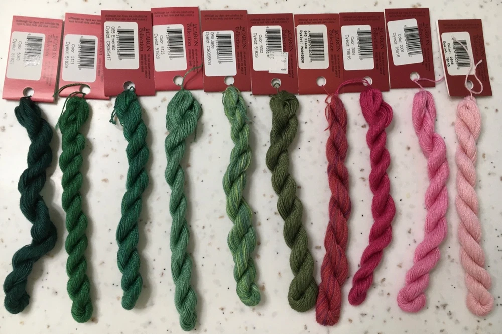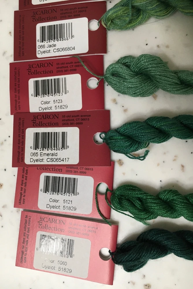 This is a fund raising auction for my embroidery chapter. Included are: 10 new skeins...045-Flame, 065-Emerald, 066-Jade,n 2004, 2006, 2035, 5002, 5060, 5121, 5123 Caron Impressions is a 50% wool, 50% silk blend. This set consists of solid colors which coordinate with Soie Cristale silk. It is about the same weight as Wildflowers, but has more loft. It is very versatile and can be used on fine linens as well as larger counts of needlepoint canvas. You can often control the look of your stitches to create either a sculptured or a satiny look simply by adding or subtracting one strand. The blend of wool and silk gives a unique appearance as the two fibers reflect light differently, giving your stitching great depth. 36 yards per skein. Retail is around $6/skein. My home is smoke free.