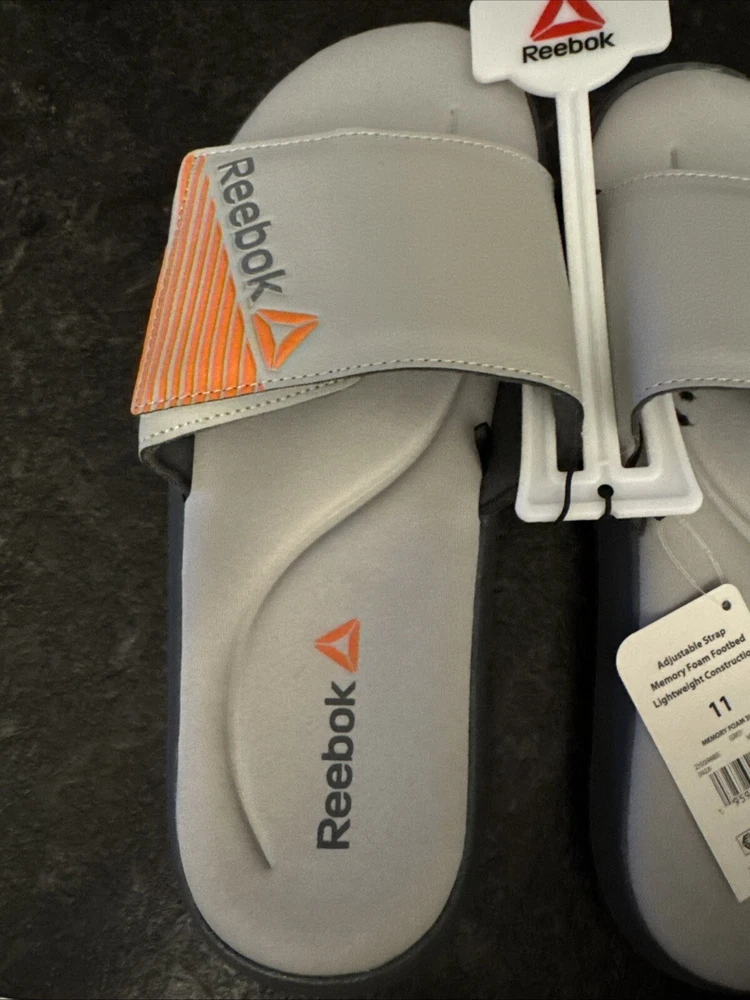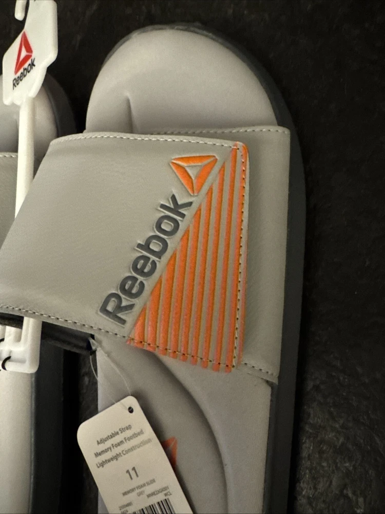 Brand: Reebok Upper Material: Synthetic UPC: 195962403904 Model: REEBOK MEMORY FOAM Color: Gray Department: Men Style: Slide Features: Adjustable, Memory Foam Type: Sandal Theme: Sports US Shoe Size: 11 gtin13: 195962403904