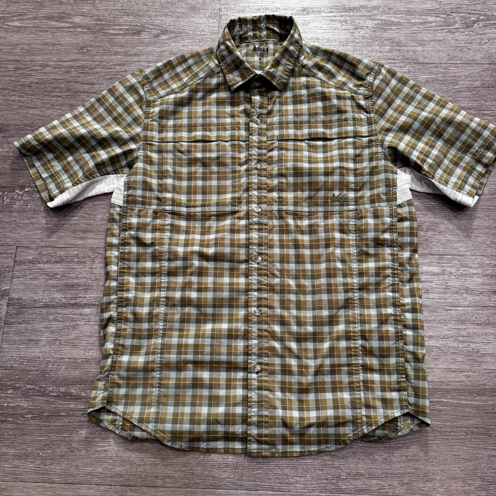 REI CO-OP Shirt Mens Medium Green Nylon Plaid Vented Hiking Outdoor Camp Safari