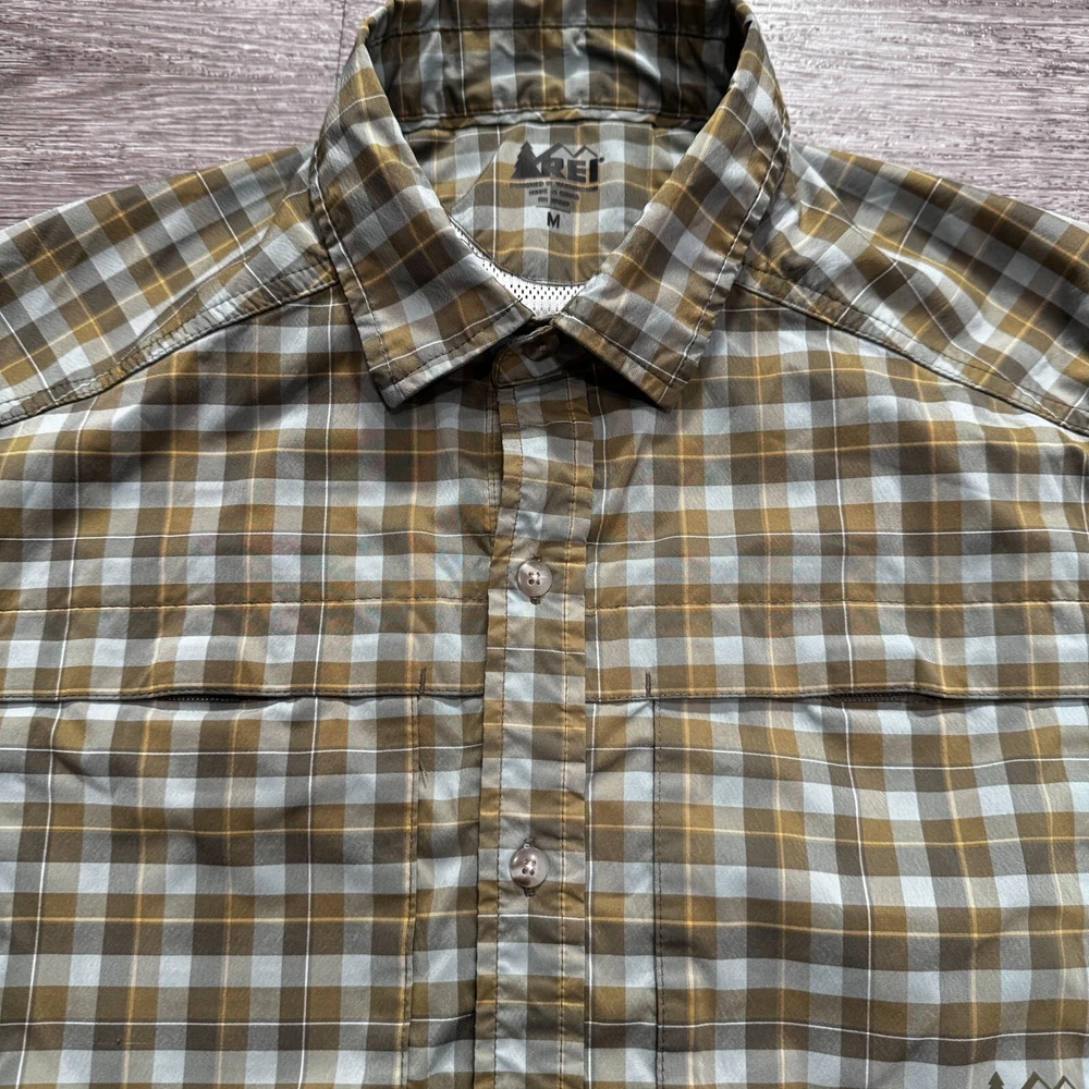 Garment Care: Machine Washable Theme: Fish, Outdoor, Classic, Sports, Nature Color: Blue Occasion: Casual, Travel, Workwear Season: Fall, Spring, Summer, Winter Size: M Collar Style: Spread Vintage: No Department: Men Material: Nylon Country/Region of Manufacture: Vietnam Accents: Button, Logo Brand: REI CO OP Fit: Regular Handmade: No Closure: Button Neckline: Collared Fabric Type: Woven Size Type: Regular Pattern: Plaid Sleeve Length: Short Sleeve Type: Button-Up Personalize: No Features: All Seasons, Breathable, Easy Care, Lightweight, Moisture Wicking, Pockets, Quick Dry, Stretch, Tagless, UV Protection, Wrinkle Resistant, vented