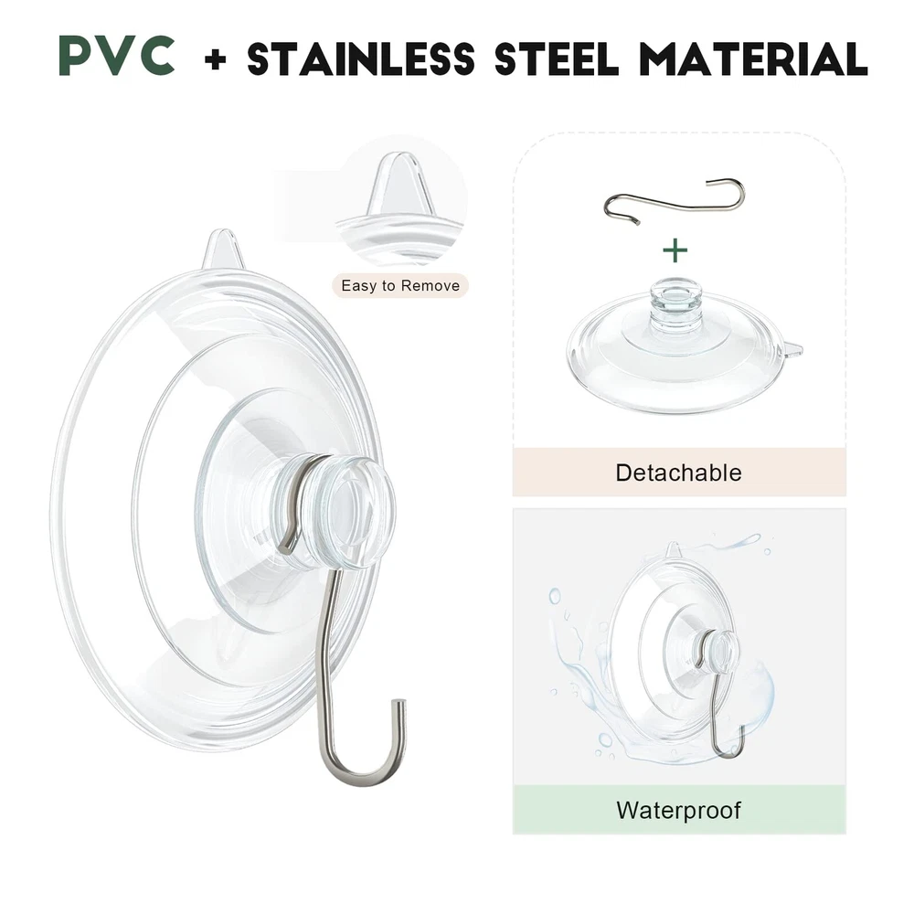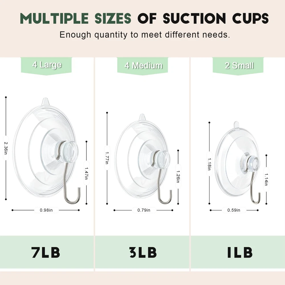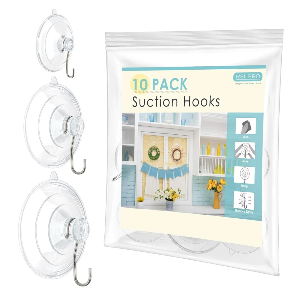 RELBRO Suction Cup Hooks, 10 Pcs Clear Suction Cups with Metal Hooks Combo Set Removable Shower Window Glass Door Suction Cup Hangers for Bathroom Kitchen Wreath - 4 Large 4 Medium 2 Small Product Details Item Package Quantity: 10 Brand: RELBRO MPN: Does not apply UPC: Does not apply EAN: Does not apply Color: Clear Brand: RELBRO Material: Stainless Steel, Polyvinyl Chloride Finish Type: Glossy Mounting Type: Wall Mount Item Dimensions: 6.5 x 4.7 x 1.9 inches Shape: Round Theme: Stylish Style Name: Stylish Color: Clear Finish Types: Glossy Material Type: Stainless Steel, Polyvinyl Chloride Weight Supported: 7 Pounds Surface Recommendation: Window, Mirror, Glass, Metal, Tile Model Number: Clear Suction Hooks Brand Name: RELBRO Recommended Uses For Product: Towel, Wreath, Utility, Wall, Garage, Kitchen, Shower, Offices, Laundry, Door Included Components: 4 Large suction cups with hooks, Medium 2 Small hooks Additional Features: Removable, Reusable, Easy Install, Heavy Duty, Rust Resistant Number of Hooks: 10 Weight Capacity Maximum: 7 Pounds Mounting Type: Wall Mount Superior Material: Clear suction cup with hooks adopt high-strength PVC and anti-rust stainless steel materials; waterproof; lightweight and sturdy; Clear appearance make these suction hooks almost invisible and matches most of home style; the PVC suction cups will not turn yellow or gray after a long-time use Variety Pack: Comes with 3 different sizes of suction cup hooks; combo set meet your different hanging needs; including 4 large: 2.36 inches and max beating capacity is up to 7 lbs; 4 medium: 1.77 inches and max beating capacity is up to 3 lbs; 2 small: 1.18 inches and max beating capacity is 1 lbs; powerful and stable Detachable & Reusable: Transparent suction cup and stainless steel hook can be detached; you can hang items with suction cups or suction hooks separately; Besides; soak the suction hooks into warm water and dry it before using; you will find the hook is still stable and hard-wearing after many times of use Easy to Use: No need for tools; nails or grill; Just clean the smooth surface; push the suction cup firmly to exhaust inner air; done! A release tab helps take off the suction hooks easily and no trace left Multifunctional Use: Suction cup hangers are suitable for hanging sun catchers, plants, string lights, wreaths, utensils, towels or other decorations on window, glass, mirror, tile or other smooth surfaces, great for organizing or decorating your house