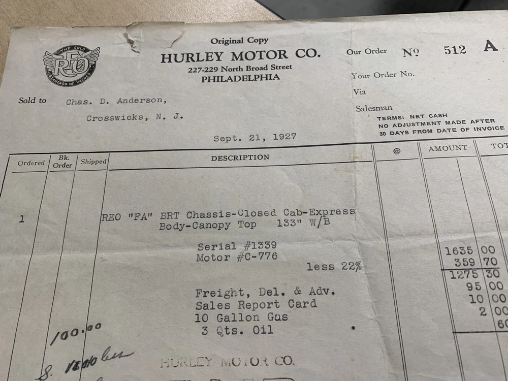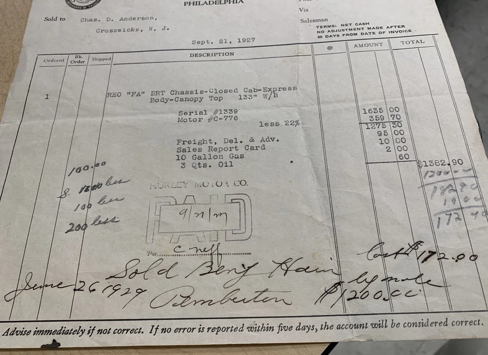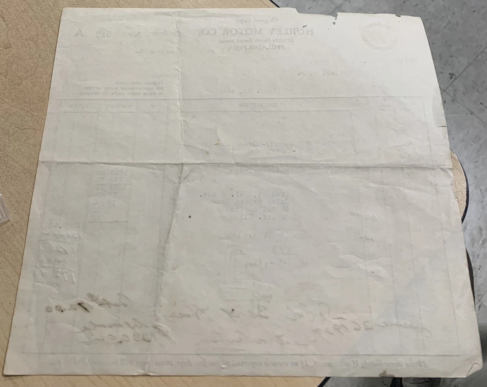 This is a rare sales invoice from REO - Hurley Motor Co. in Philadelphia, PA from the early 1920s. It is a valuable piece of ephemera for collectors of antique automobiles and paper memorabilia. The invoice details the sale of an REO motor car and includes the names and addresses of the buyer and seller, as well as the purchase price and any applicable taxes or fees. This item was manufactured in the United States and is a unique addition to any collection.