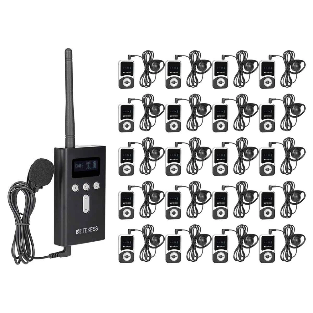 Model TT116T+TT116R TT125 T130+T131 Product Frequency Range UHF:902-928mhz 2.4 GHz 195-230MHz Transmission distance 200m(Open Area) 150m(Open Area) 60m(Open Area) Standby Time about 10h(Transmitter) about 18h(Transmitter) about 12h(Transmitter) about 13h(Receiver) about 80-100h(Receiver) about 18h(Receiver) Channel number 50 channels 999 channels 99 channels Noise Reduction Technology YES YES NO One-key Pairing YES YES YES One-key Mute YES YES NO Charging Port Type-C Type-C USB Battery Capacity 3.7V 1000mAh 3.7V 3000mAh 3.7V 900mAh(T)/600mAh(R) Microphone Omnidirectional Omnidirectional / Earphone D-shaped;Suitabel for both ears D-shaped;Suitabel for both ears D-shaped;Suitabel for both ears Size 114.8X54.8X20.6mm(T&R) 114.8X54.8X20.6mm(T&R) 99X56X14mm(T)+72X42X12mm(R) Weight 65g(T)+56g(R) 100g(T&R) 58(T)+45g(R) RETEKESS T130S-T131S Wireless Tour Guide Audio System 20 Receiver Church Meeting Transmitter Features: Portable design, the smallest and lightest PLL synthesized design, with high frequency stability 49 channel: allows 49 groups to operate simultaneously at the same place One transmitter can work with any number of receivers About 120m(393ft) communicating distances The transmitter supports external audio input, such as MP3, Smartphone Bulit-in rechargeable lithium battery, make sure can use all day long LCD display, volume adjustable, battery consumption display, easy to operate Two way of ID setting: Wireless and Manual. If you have to set the ID for many receivers, the wirelss ID setting method is more quickly Support the transmitter to turn off the receiver on the same frequency with one key, the transmitter to mute with one key, and the transmitter to frequency with one key Applications: Tour guide, Wireless meeting, Wireless teaching, Simultaneous interpreting, Corporate hospitality, Factory tour, Church sermon, etc. Transmitter Specification: Frequency range 195-216MHz Channel 49 channels Frequency response 50Hz-18000Hz Operating voltage DC 3.7V Transmitted output power 18dBm Audio frequency input 3.5mm line /Microphone input SNR 80dB(Typical) Image rejection ratio ≥90dB Degree of distortion <0.3% Effective working area 100m Capacity of battery 4200mAh Working hours About 20 hours Size 205 x 60 x 20 mm / 8 x 2. 3 x 0. 7 in Weight 140 g / 0.3lb NOTE: This is a wireless transmitter only, it has to match our receiver to build a wireless tour guide system, please feel free to contact us. Can be used with T131 receiver Receiver Features: Portable design, the smallest and lightest PLL synthesized design, with high frequency stability 49 channel: allows 49 groups to operate simultaneously at the same place Built-in rechargeable lithium battery, make sure can use all day long LCD display, volume adjustable, battery consumption display, easy to operate Applications: Tour guide, Wireless meeting, Wireless teaching, Simultaneous interpreting, Corporate hospitality, Factory tour, Church sermon, etc.. Receiver Specification: Frequency range 195-216MHz Channel 49 channels Operating voltage DC 3.7V Audio frequency input 3.5mm line Frequency response range 50-18000Hz SNR 80dB(Typical) Image rejection ratio ≥90dB Degree of distortion <0.3% Effective working area 100m (empty) Capacity of battery 900mAh Working hours About 20 hours Size 73x 42 x 12mm / 2.8 x 1.6 x 0.5 in Weight 45g / 0.1lb NOTE: This is a wireless receiver only, it has to match our transmitter (195-216MHz) to build a wireless tour guide system, please feel free to contact us. Package Includes: 1 x Wireless t ransmitter 20 x Wireless receiver 20 x Single earphone 1 x Lavalier microphone 20 x USB charging cable 20 x Lanyard 1 x English manual Long working distance Signal transmission distance up to 100m/328ft, is ideal for keeping social distancing, such as tour guides, translators; factory visits; training meetings and other scenarios. The frequency range is 195-216MHz, helping tour groups overcome background noise and distance from the guide. One key to mute When the tour guide has to answer the phone during the explanation, he can turn on the mute function with one button on the transmitter instead of turning off the transmitter. PLL technology for signal stabilization PLL digital locking frequency synthesis design, more stable frequency, data mute locking technology, no interference noise. Ensures the clear and smooth audio transmission in a tour trip or in a conference. Ultra-long standby rechargeable battery Built-in 4200mAh lithium rechargeable battery in the transmitter can be used for 20 hours. Built-in 900mAh lithium battery in the receiver can be used for 20 hours. Long working time ensures your guests won’t miss any of your message,readily for a whole-day conference or journey. Wireless ID Setting Manual ID Setting We have 2 ways to set ID: Wireless ID setting and manual ID setting. Wireless ID setting works better for the occasion that if have to set the ID for many receivers, like a big conference; Manual ID setting works better for the occasion that if have to set the ID for few receivers, like a small class, a small group of tourists; Support 49 channels In the same tourist attraction, there will be multiple sets of equipment for explanations at the same time, and 49 optional channels will keep your team free from interference from other equipment. AUX and MIC dual-channel audio input The tour guide can play background music through the AUX function when explaining. Allow visitors to immerse themselves in the attractions. The clear and high-quality sound offers enjoyable listening experiences.. D-shaped earphones Compatible with left and right ears, it can reduce the burden on listeners who wear headphones for a long time compared to wearing headphones on one side. It is convenient to wear and solves the difficulty of using some hearing-impaired people, increasing the wearing options of users. Intuitive user interface LCD display for battery power, channel, volume, it is very easy to operate. The lit disp