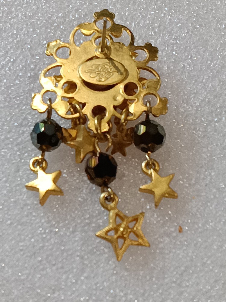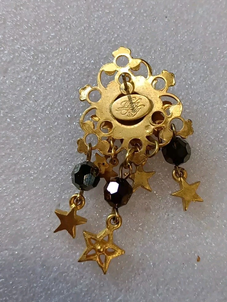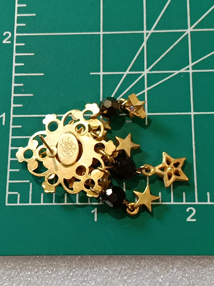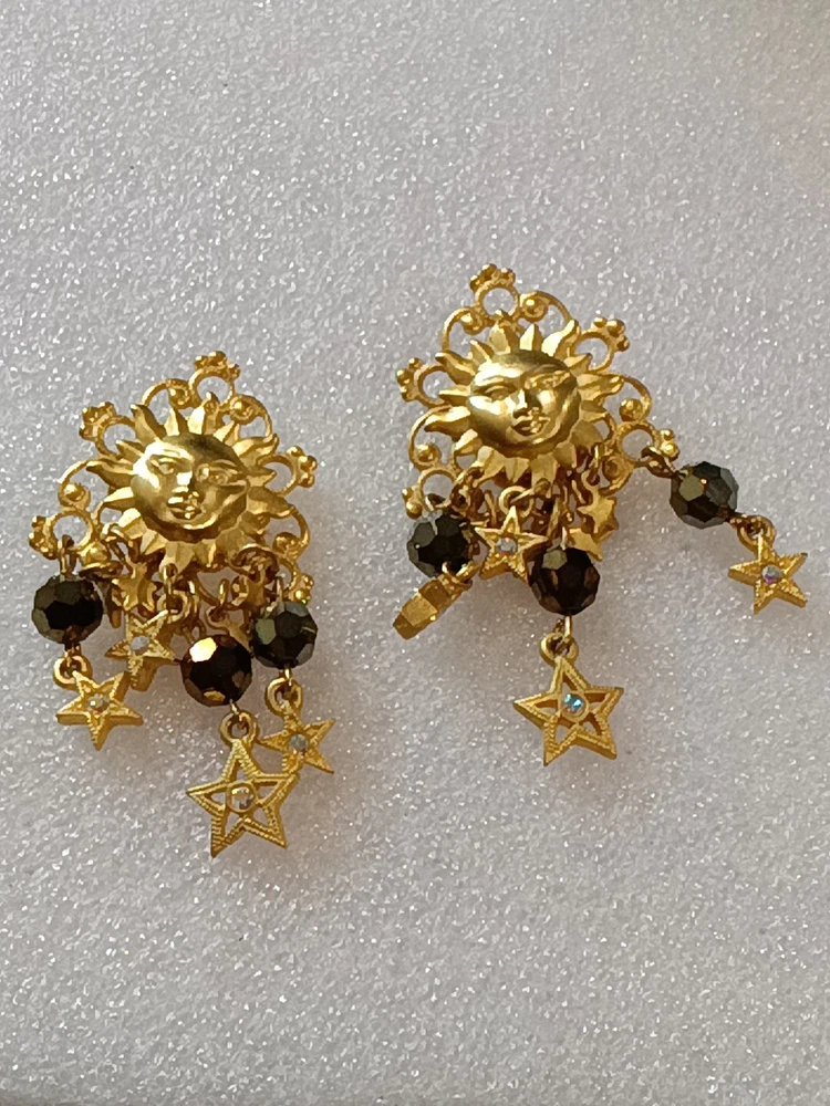 These beautiful earrings from Kirks Folly feature a stunning celestial design with dangling stars and brown breads. The leverback closure makes them easy to wear and they are perfect for any occasion, from Mother's Day to Graduation. The earrings have a vintage feel, dating back to the 1990s, and are sure to make a statement with their unique mix of colors and shapes. The earrings are a perfect gift for any occasion, whether it's for a loved one or to treat yourself.