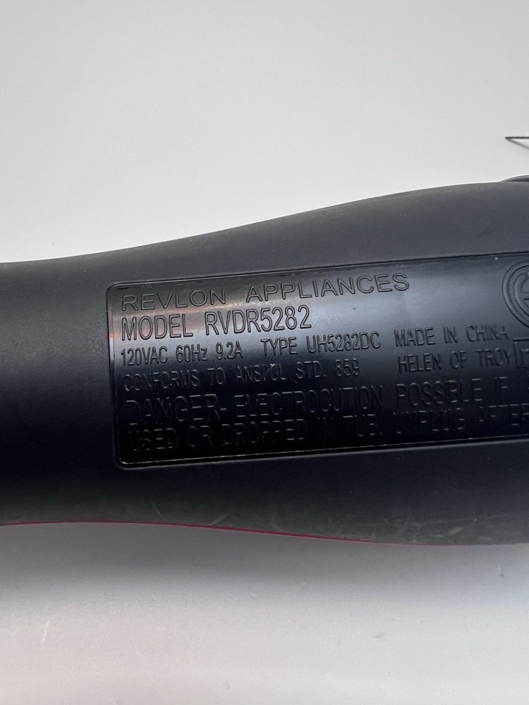 Color:BlackCountry of Origin:ChinaFeatures:Adjustable Heat SettingsCustom Bundle:NoNumber of Temperature Settings:3Size:Travel SizeBrand:RevlonType:Volumizer Hair DryerMaximum Temperature:180 °FBarrel Size:2.4 inNumber of Speeds:2Department:UnisexPower Source:ElectricPower:1100 WSeller Notes:“Normal wear and tear...”MPN:RVDR5282Model:REVLON RVDR5282Material:Plastic