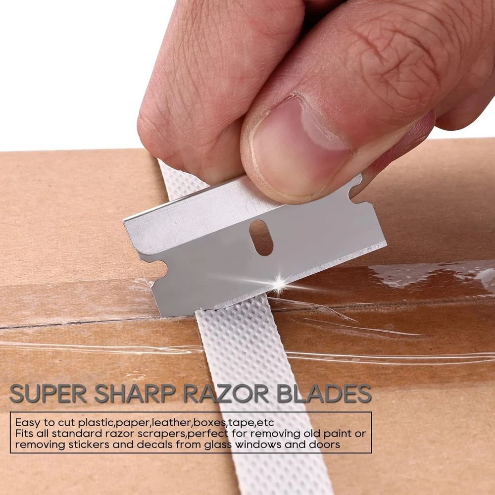 Made by high quality steel for strength and durability All blades were individually wrapped by antirust waxed paper Easy to cut plastic,paper,leather,boxes,tape,etc Fits all standard razor scrapers,perfect for removing old paint or removing stickers and decals from glass windows and doors Includes 100 total 1.5" x 0.75" thick steel single edge razor blades Product Description Super Sharp Edge Made by high quality steel for strength and durability.Fits all standard safety scrapers.Perfect for removing old paint or removing stickers and decals from glass windows and doors Individually Wrapped All blades are individually wrapped by antirust waxed paper, can store for a long time without rust.Easy to pick up the blades and will not cut hands 100 Pack Included Includes 100 total 1.5" x 0.75" thick steel single edge razor blades.Neat packing, easy to carry