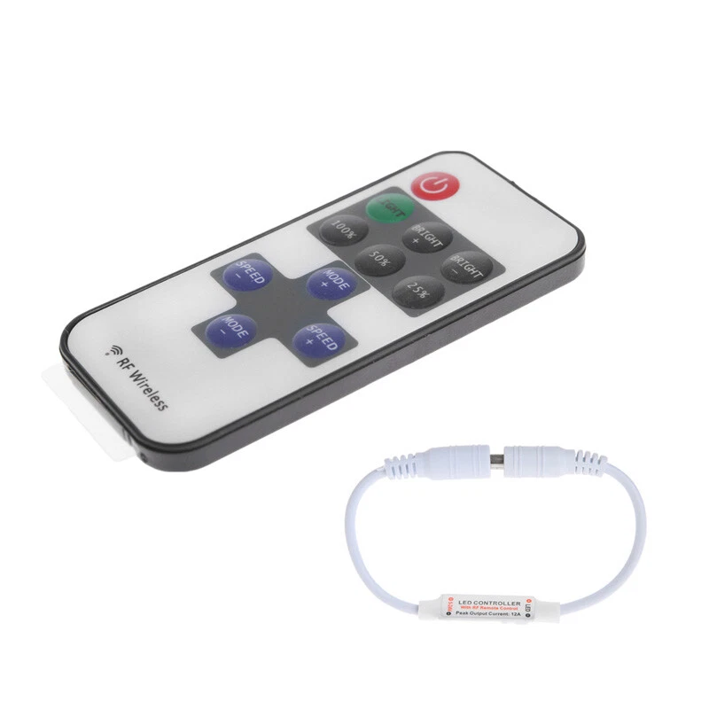 Description Instructions for RF Remote Turn On/ Standby Press this for key to turn on unit or to standby Unit will turn on and to previous at powering on moment. Lighting to lighting from dynamic Dimmer Adjust to , 50%, or 25% brightness lighting Dynamic Adjust to dynamic from lighting or between different dynamic modes. Speed Adjust Adjust playing speed of dynamic modes. Press SPEED+ to increase seed and press SPEED- to decrease. Brightness Adjust (Dimmer) Adjust lighting brightness. Press BRIGHT+ to increase brightness and press BRIGHT- to decrease Functions for RF Remote Dimmer & Dynamic 8 Dynamic Effects 10-level Dimmer 256-Grade PWM Speed Adjustable Card Type Remote Smooth Dimmer Effect 1 to 1 Remote Paired Auto Save Function Installing for RF Remote 1. Power Supply This unit accepts for DC 5V to 24V power supply. The red cable should be to positive and black cable to negative. Please proper power supply according to the LED application. 2. LED Output The red cable should be to LED positive and black cable to negative. The for output current is 12A, please reduce load if main unit is overheating. CAUTION:Do not short circuit the LED output, this may to permanent damage! 3. Remote Control Please pull out the insulate part before using. The RF remote can pass through barrier, so it\'s not necessary to aim at the main unit when operate. For proper receiving remote do not install the main unit in closed metal parts. Note: The remote is 3V CR2025 type Specification Dynamic 8 modes Dynamic speed level: 10 levels Lighting brightness level: 10 levels PWM grade: 256 grades Smooth dimmer effect: Yes Working for DC 5~24V Output current: for 12A Remote control RF Remote frequency: 433.92MHz Remote distance: >15m at open area type: 3V CR2025 included) Quantity: 1Set No Retail Packages Size for manual measurement, there may be a 0 to 2 for cm error, belongs to the normal phenomenon. Note: Due to the difference between different monitors, the picture may not reflect the actual color of the item. Thank you! Package list: 1 x RF Remote included) 1 x LED Dimmer