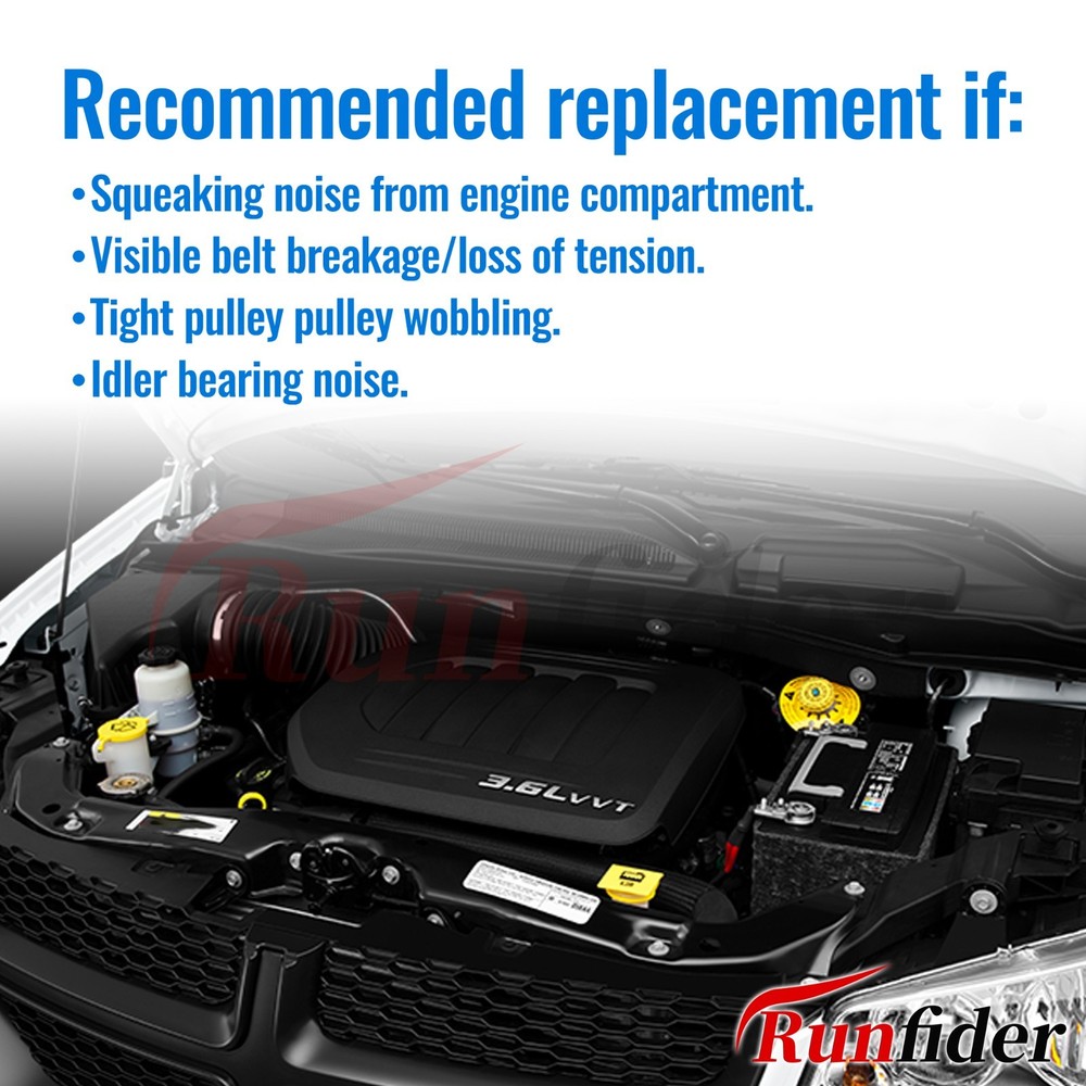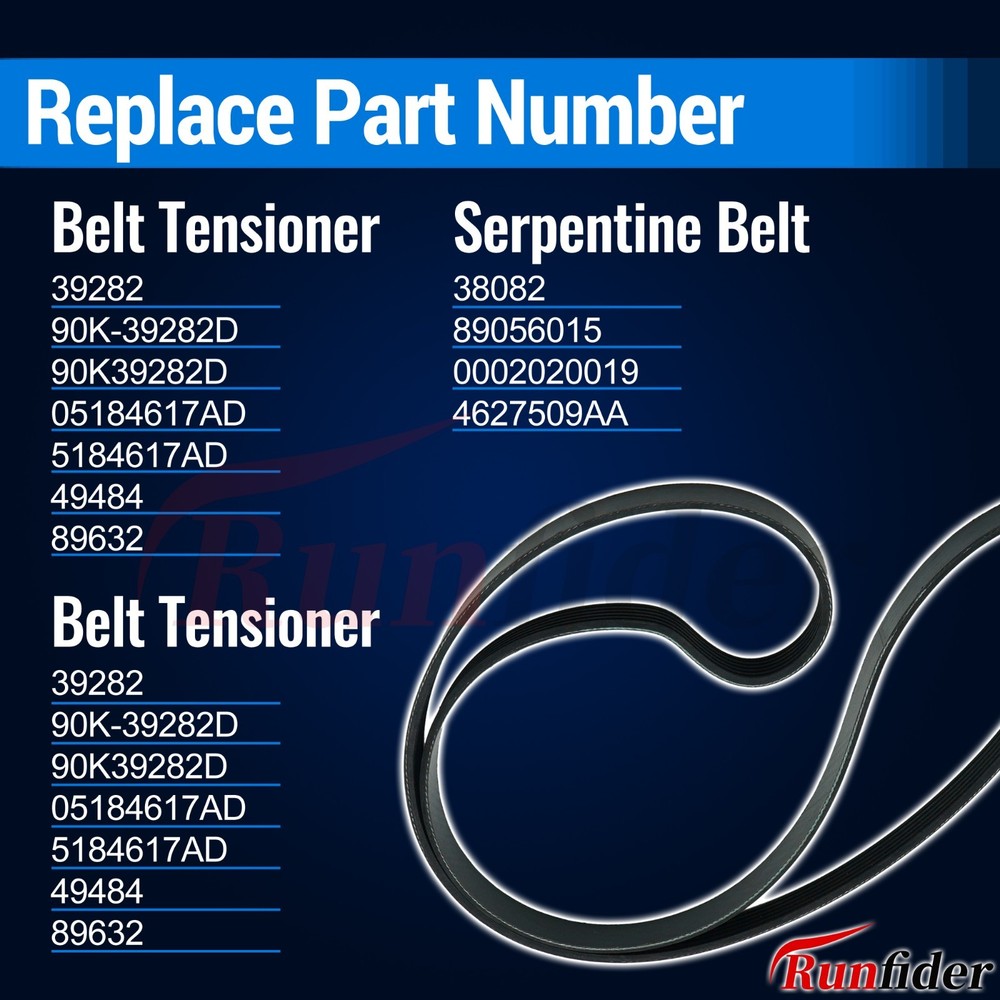 Replament Part Number: 1 PCS Drive Belt Tensioner: 39282 5184617AD 05184617AD 49484 89632; 1PCS IdlerPulley: 38082 89056015 0002020019 4627509AA 4627851AA 4792836AA 5281301AA; 1 PCS V-Ribbed Belt: 5060770 6PK1955 K060770 K060771. Before purchasing, please carefully read the product description, the model and year of the product and the MPN code to ensure that the product is suitable for your car and within your needs. Complete Replacement Kit Components: The kit contains all necessary components for a full serpentine belt system refresh: a heavy-duty tensioner with precision bearings, a reinforced idler pulley, and a durable belt. All parts mee specifications for dimensional accuracy and performance. Each component undergoes individual inspection for proper fitment and function before packaging. Professional-Grade Installation: While designed for straightforward installation, we recommend professional installation or supervision for those without mechanical experience. The tensioner features clear alignment marks for proper belt routing. All hardware is pre-torqued to factory specifications to ensure correct operation. Installation typically requires basic hand tools and takes approximately 30-60 minutes. Product Quality Inspection: The products are manually inspected before leaving the warehouse, such as size measurement, belt tension test and appearance quality inspection, and the quality of the products at the time of leaving the warehouse is rated as A grade. Runfider Quality Assurance: We offer a 12-month warranty on our products. We offer product returns and exchanges for any problems during this period. Please read the compatibility information of this product carefully before purchase to ensure that it is suitable for your vehicle model. On Nov 27, 2025 at 21:08:36 PST, seller added the following information: