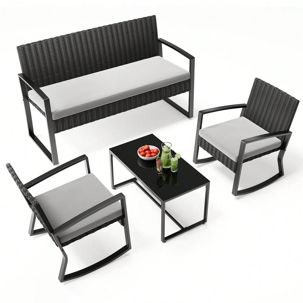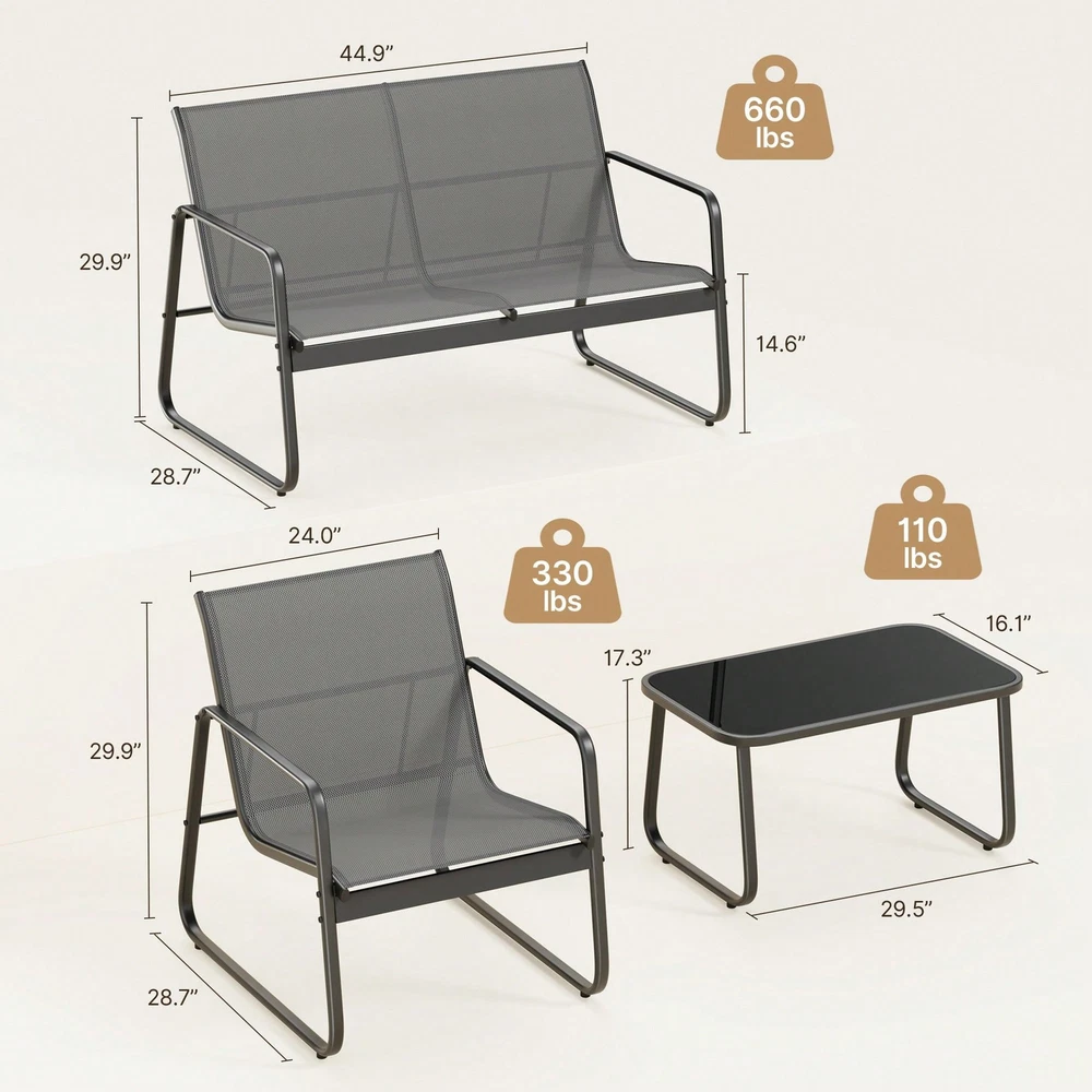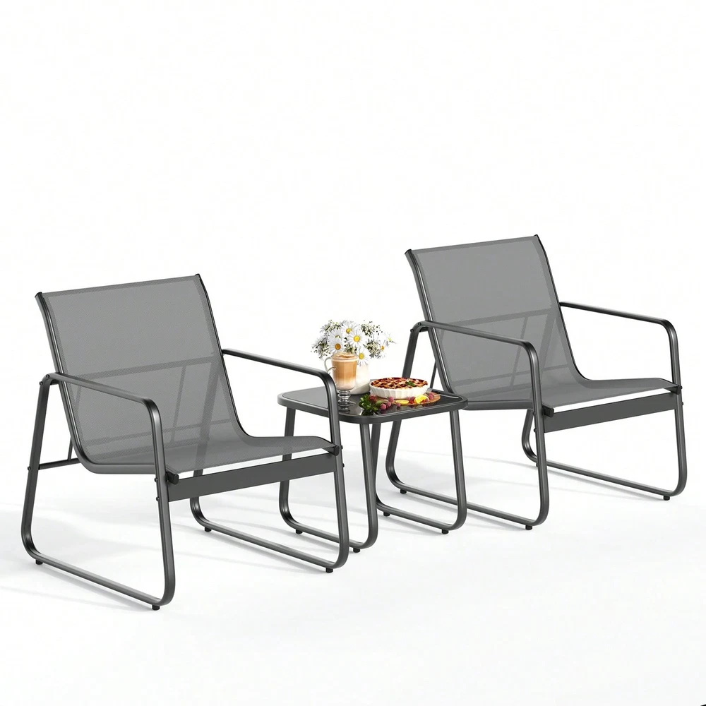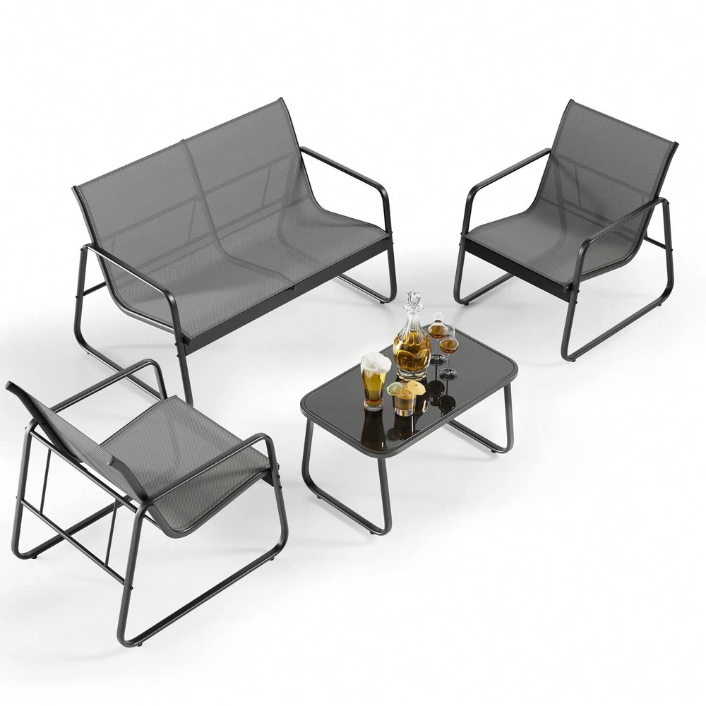 This patio set is a fantastic addition to any outdoor space! The sleek design and comfortable sofa chairs make relaxing outside a breeze. The glass table adds a modern touch, and the sturdy construction holds up well in my garden. Perfect for small gatherings or just lounging by the pool—great value for the price!