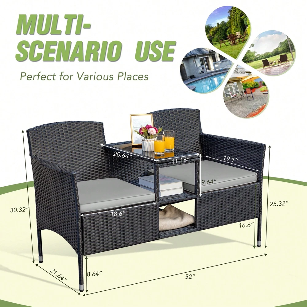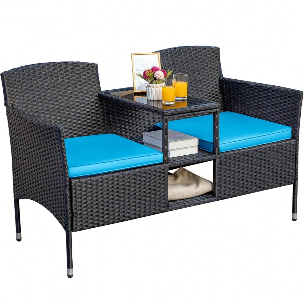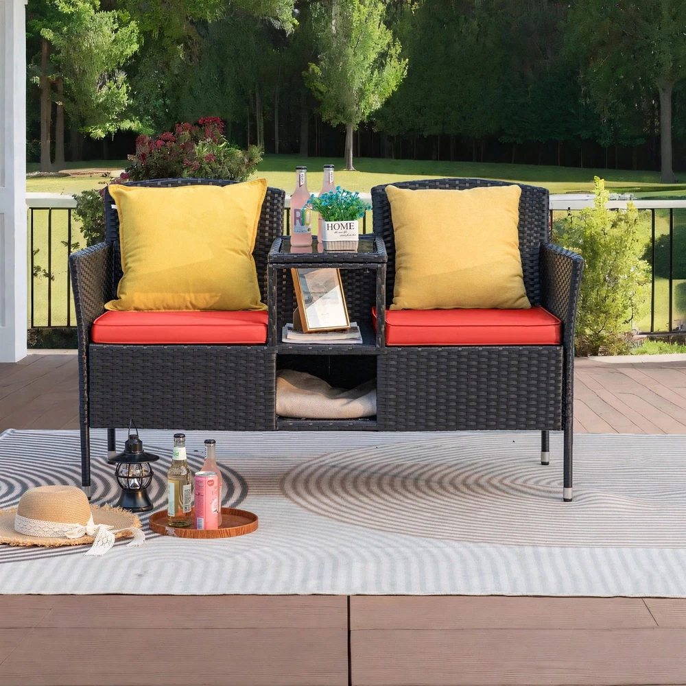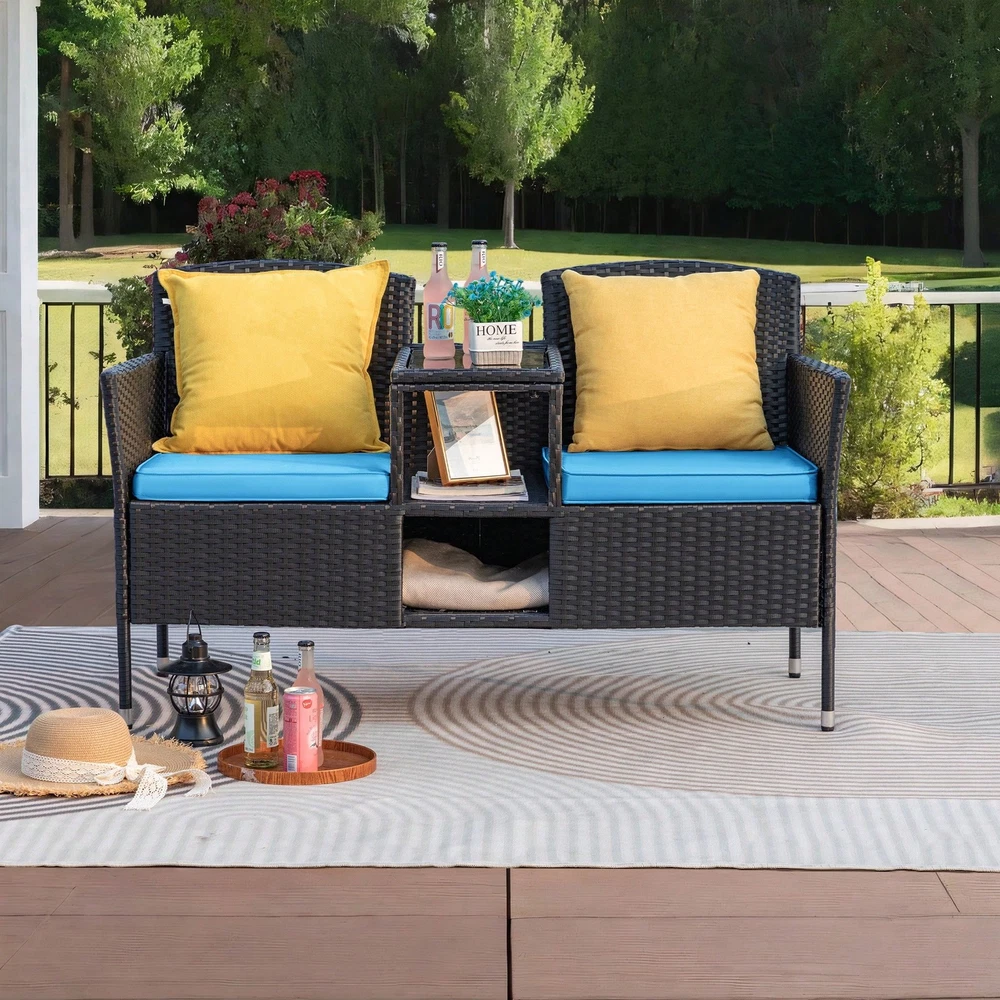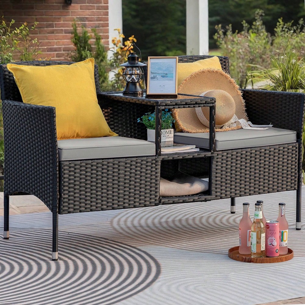 This outdoor rattan loveseat set is a fantastic addition to any patio or garden! The cushions are super comfy, and the included table is a nice touch for drinks or snacks. The rattan material looks stylish and feels sturdy, perfect for relaxing outdoors. Easy to assemble and weather-resistant—great value for the price!