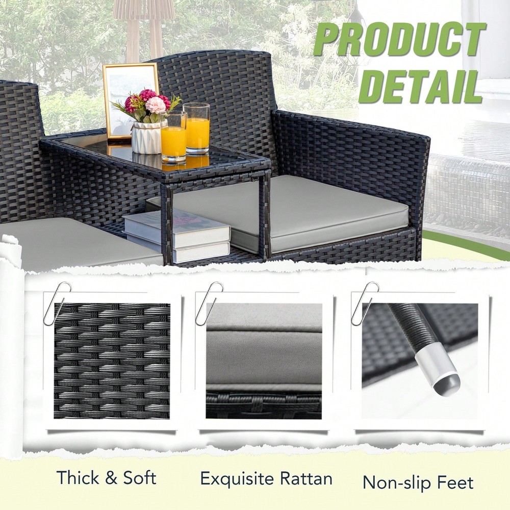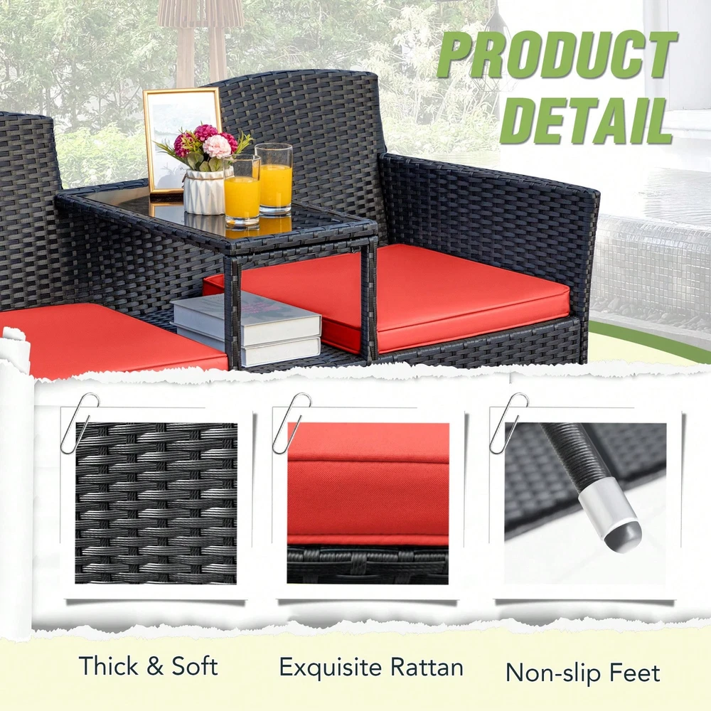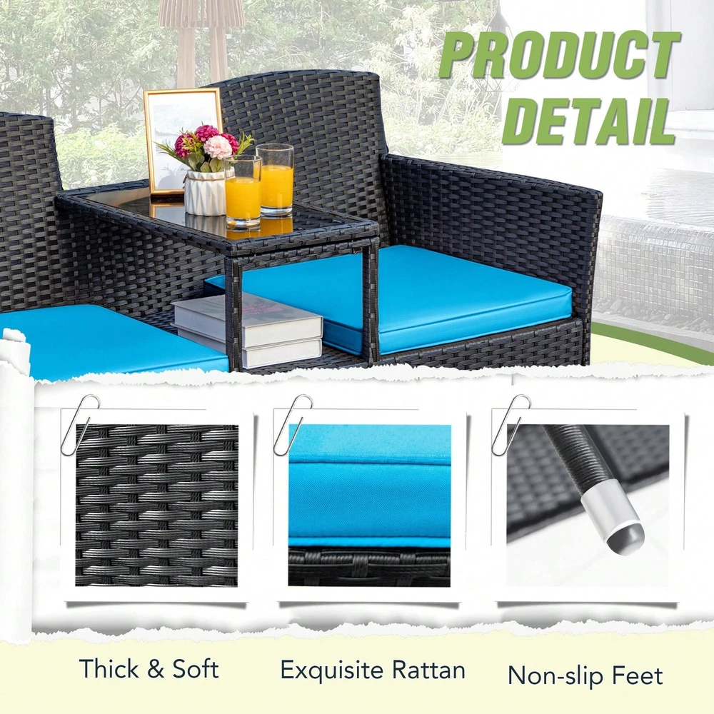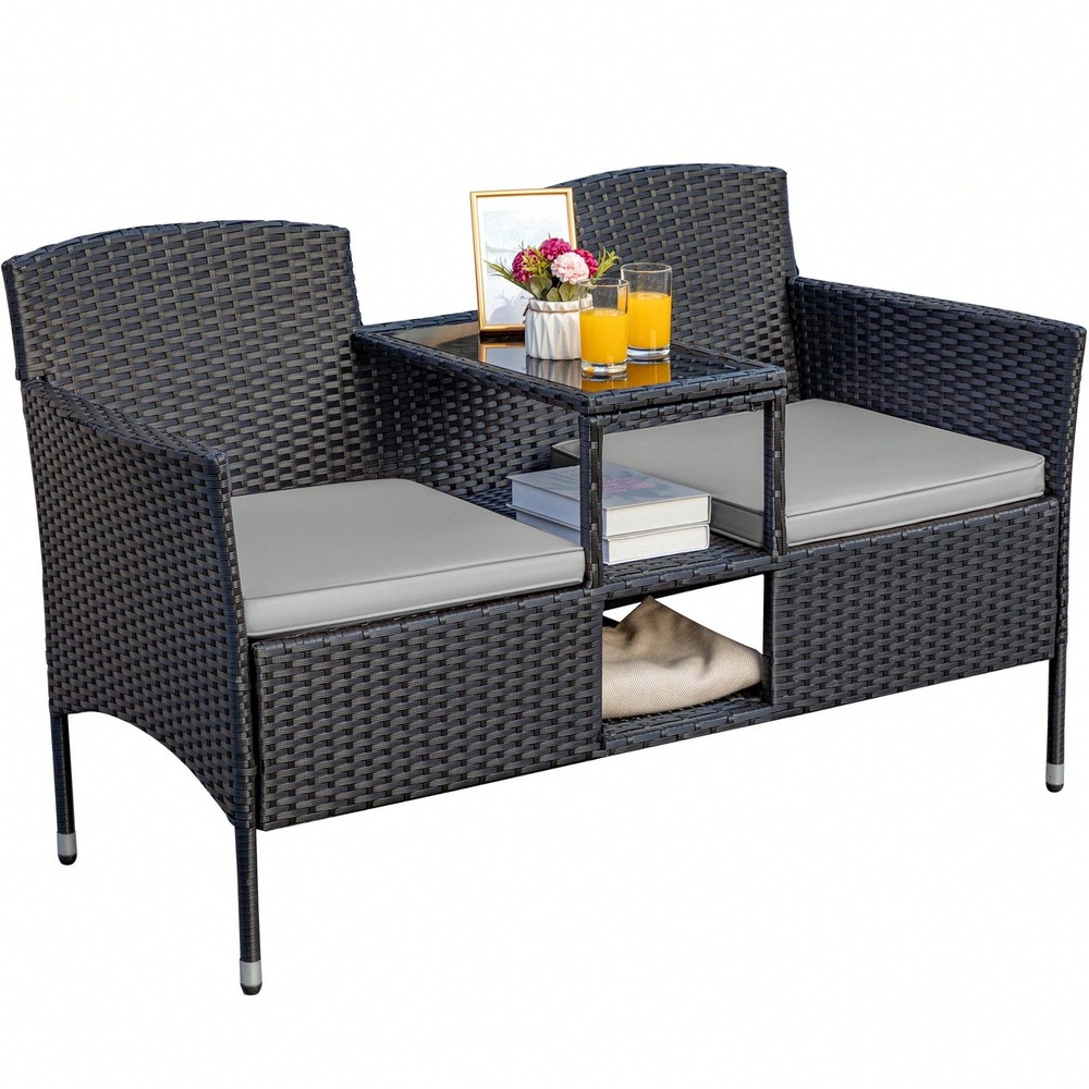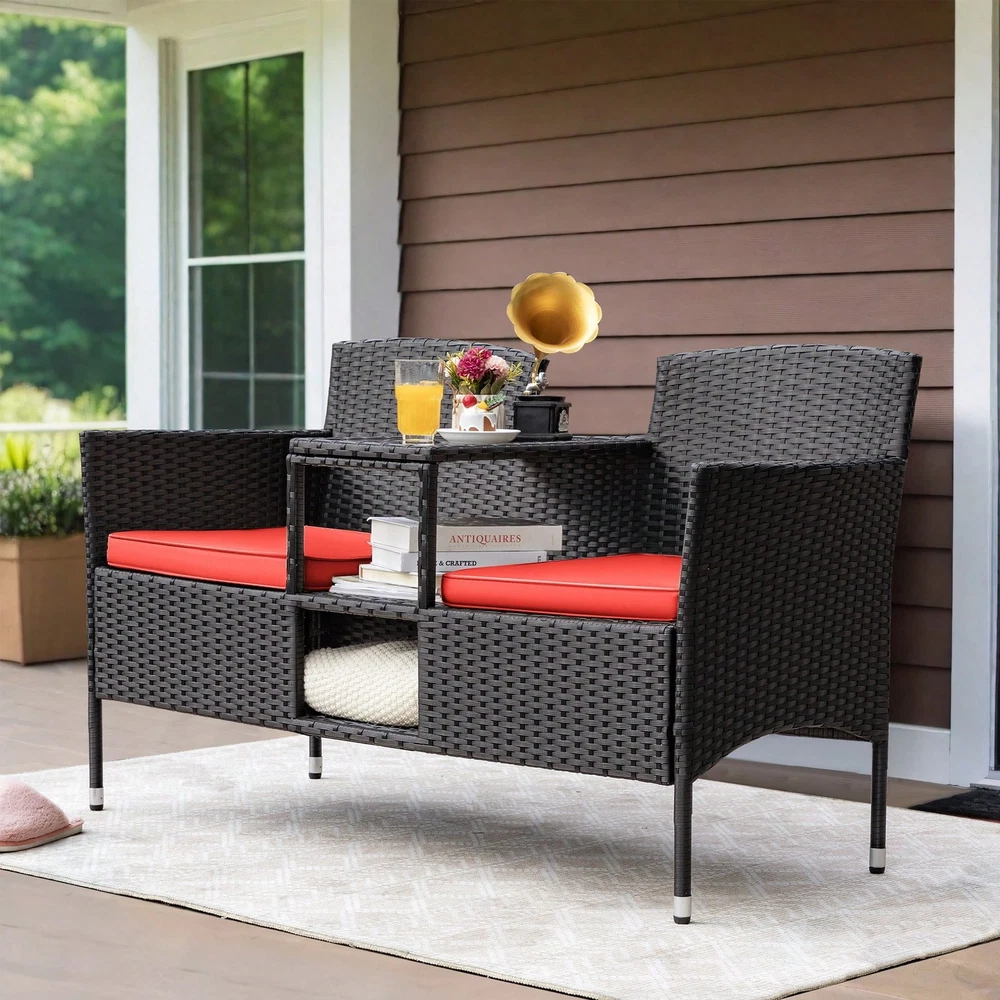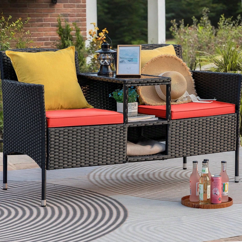 This outdoor rattan loveseat set is a fantastic addition to any patio or garden! The cushions are super comfy, and the included table is a nice touch for drinks or snacks. The rattan material looks stylish and feels sturdy, perfect for relaxing outdoors. Easy to assemble and weather-resistant—great value for the price!
