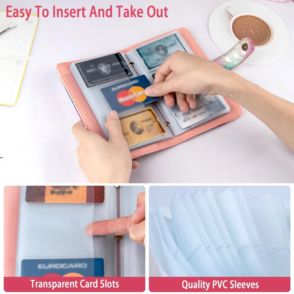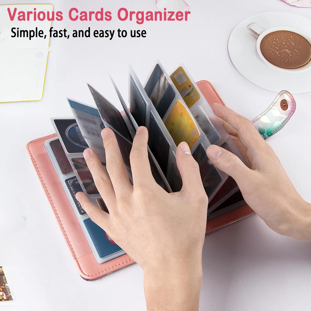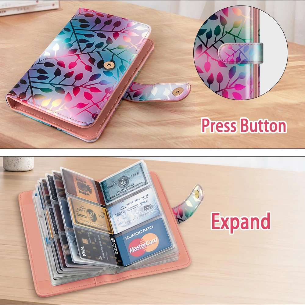 【Premium PU Leather】100% brand new! Made of premium PU leather materials. Various styles for you choose - Solid color and elegant printed patterns. Designed with pretty and delicate patterns, applied excellent printing technology to ensure color vibrant. It can be a good gift for your Friends, Family or Colleagues,etc. If there is any further questions please feel free to us. 【Multipurpose and Large-capacity】For the size details please refer to our size chart photo in the listing. Book binder style with large capacity which has 32 pages with 96 card slots can holds 192 pieces business cards. You can keep credit cards, debit cards, ID card, etc. to prevent loss and damage. Book style is easy to carry and you can find your cards easily. 【RFID Blocking Book】This cards holder book is made from special RFID blocking material that prevents thieves from scanning digital and electronic chips. It can protect your cards safe enough. 【Pratical Design】The Card Organizer book with 96 Card Slots, which can holds 96 Credit Cards or up to 192 Business Cards well , with a sturdy magnetic clasp keeps all cards in place without loosening. And the translucent PVC Card pages make it find and read card information easily, aslo easy to insert and take out. 【Best Gift】With various printed patterns and sweet solid color designs, you can use it as a gift for birthdays or holidays, such as Christmas, Easter, Valentine's Day, etc. I believe that your friends and relatives, who receive the well-made, fashionable and beautiful Business Card Holder set, will surely like it very much!