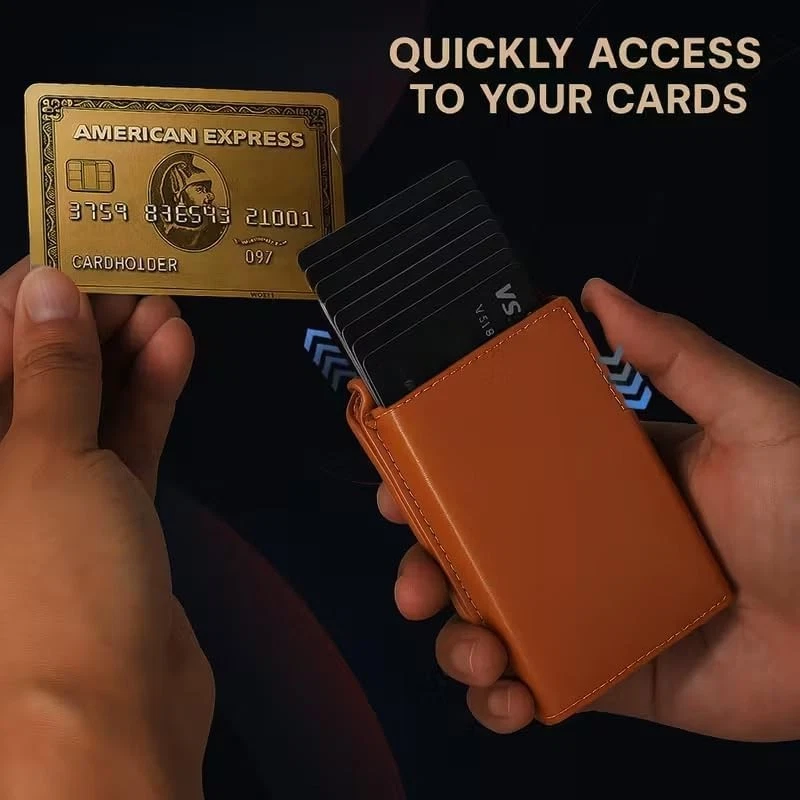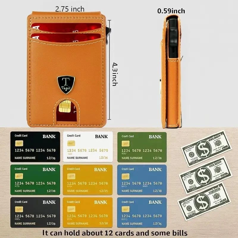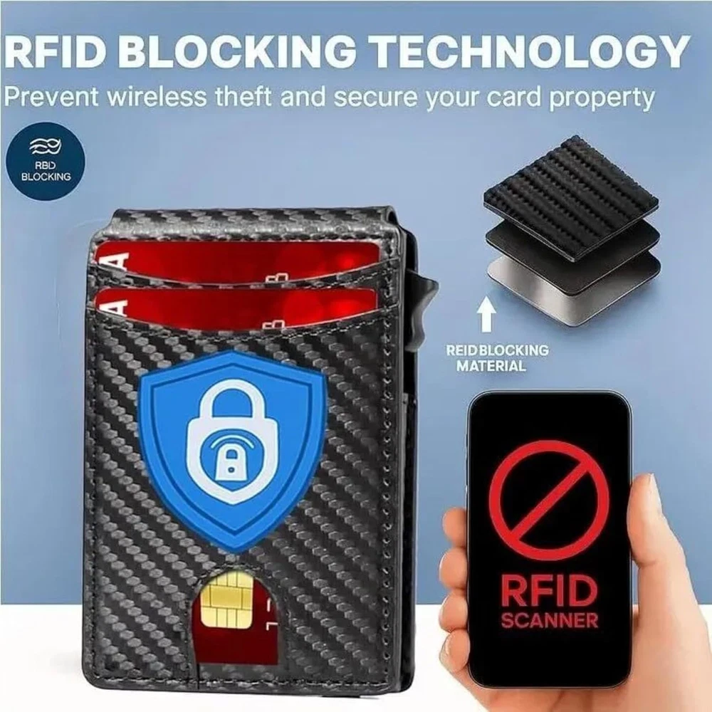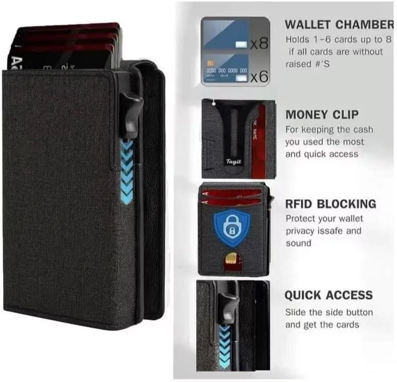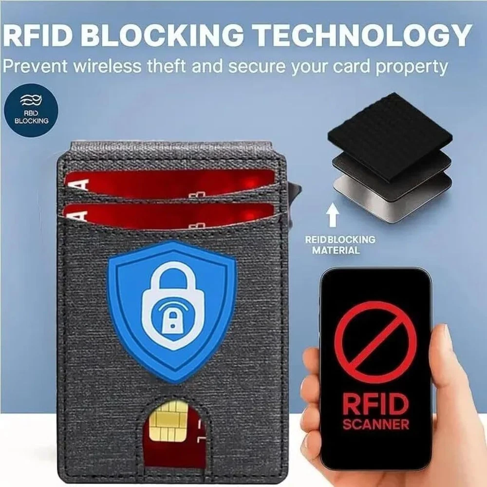 SLIM RFID WALLET – MINIMALIST DESIGN FOR EVERYDAY COMFORT Experience the perfect balance of style, function, and security with this modern slim wallet. Crafted for those who prefer less bulk and more convenience, it fits effortlessly into any pocket while keeping your essentials organized and protected. ✨ Features & Highlights ✅ Premium Craftsmanship: Made with a durable, water-resistant PU exterior for lasting performance. ⚡ Smooth Pop-Up Mechanism: Precision-built aluminum card holder allows easy access with one click. 🔒 Secure Magnetic Snap: Strong magnetic closure keeps the PU cover firmly attached to the card chamber. 💳 Spacious Capacity: Stores up to 18 cards, including a clear ID slot for quick visibility. 📏 Compact Yet Practical: Built-in metal money clip holds bills securely without extra bulk. 🚫 RFID Shielding: Advanced blocking technology prevents electronic pickpocketing. 👔 Modern Unisex Look: A versatile, elegant wallet suited for both men and women. 🎁 Perfect Gift Choice: Packaged in a premium gift box, great for holidays, birthdays, or special occasions.