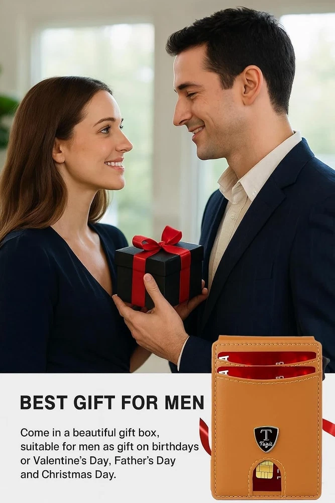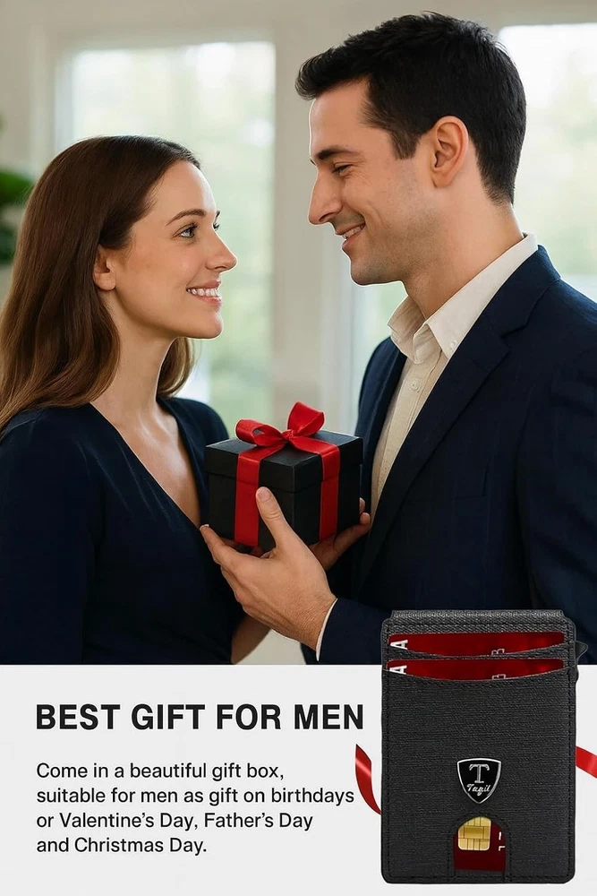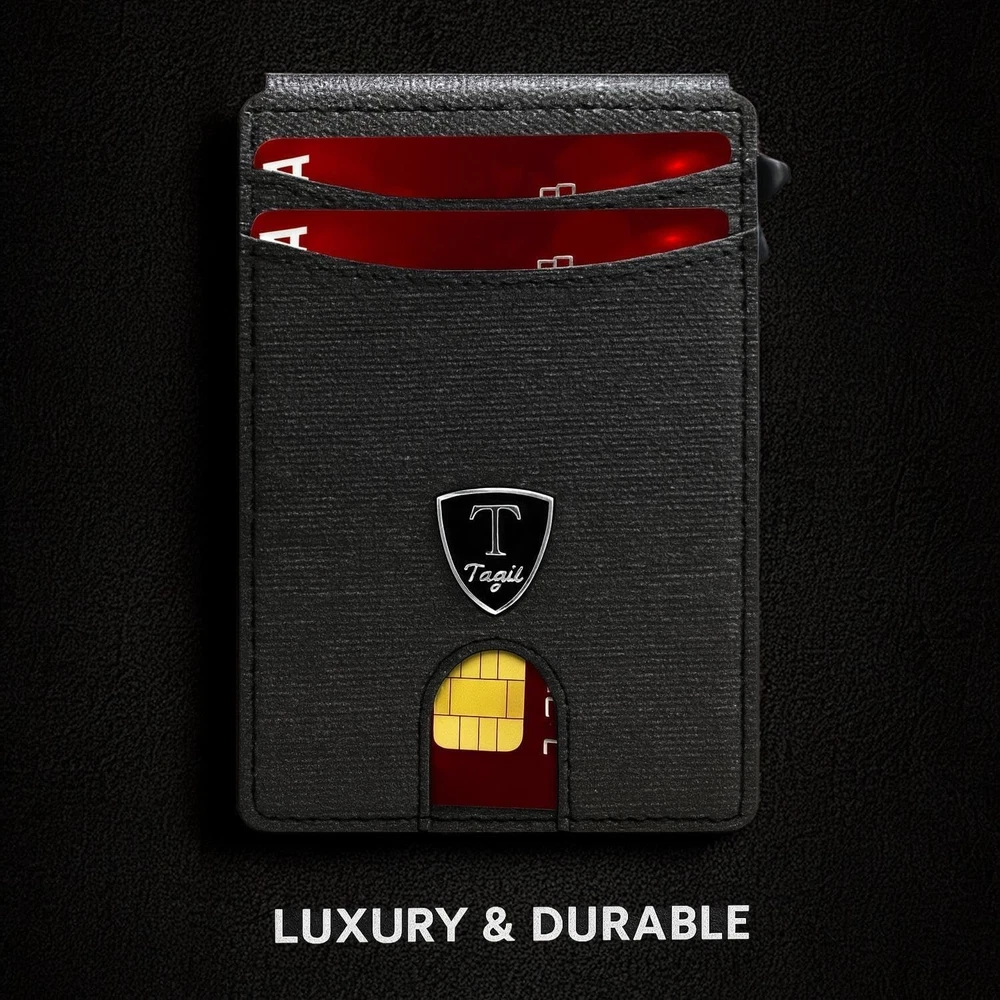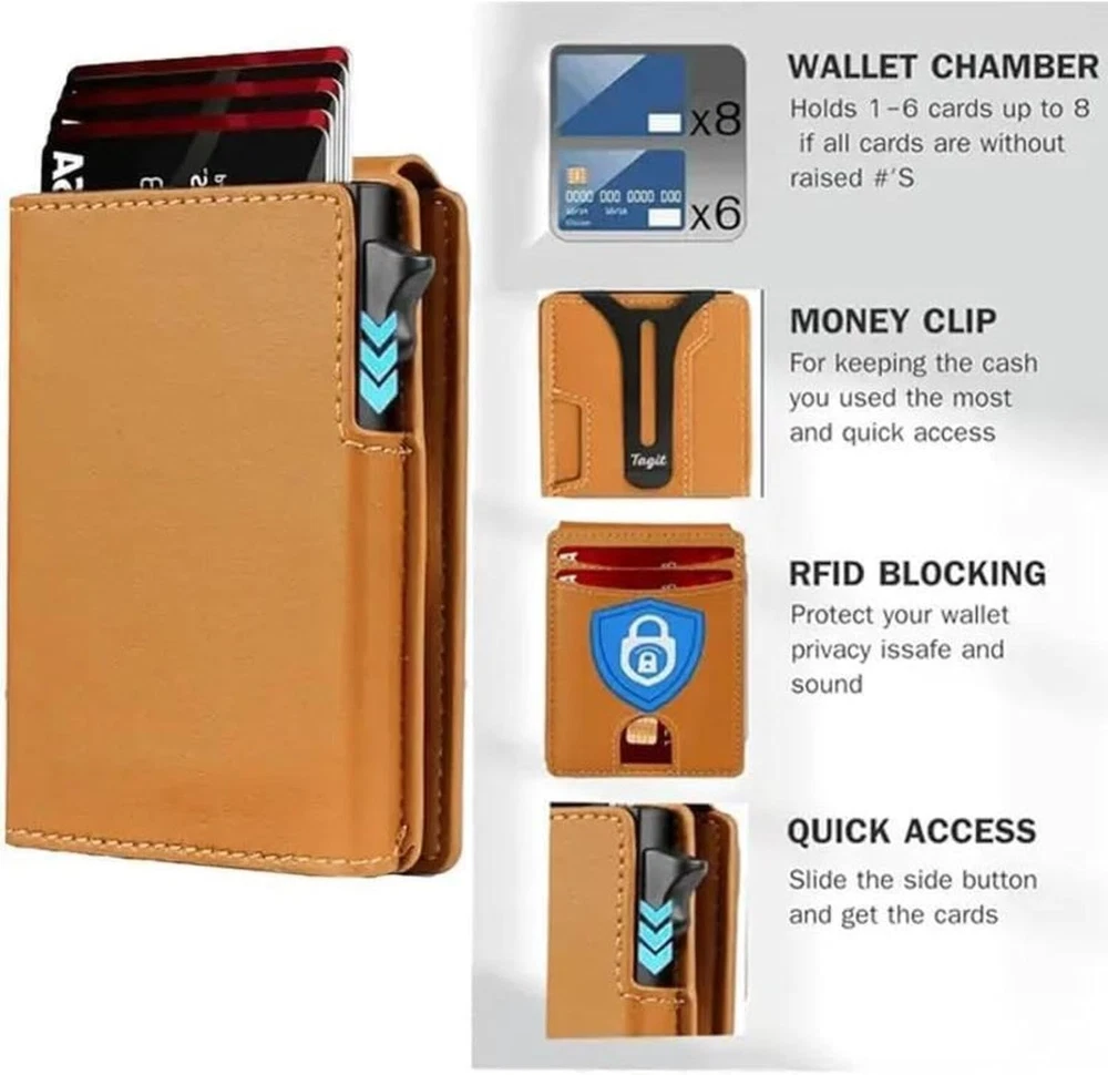 SLIM RFID WALLET – MINIMALIST DESIGN FOR EVERYDAY COMFORT Experience the perfect balance of style, function, and security with this modern slim wallet. Crafted for those who prefer less bulk and more convenience, it fits effortlessly into any pocket while keeping your essentials organized and protected. ✨ Features & Highlights ✅ Premium Craftsmanship: Made with a durable, water-resistant PU exterior for lasting performance. ⚡ Smooth Pop-Up Mechanism: Precision-built aluminum card holder allows easy access with one click. 🔒 Secure Magnetic Snap: Strong magnetic closure keeps the PU cover firmly attached to the card chamber. 💳 Spacious Capacity: Stores up to 18 cards, including a clear ID slot for quick visibility. 📏 Compact Yet Practical: Built-in metal money clip holds bills securely without extra bulk. 🚫 RFID Shielding: Advanced blocking technology prevents electronic pickpocketing. 👔 Modern Unisex Look: A versatile, elegant wallet suited for both men and women. 🎁 Perfect Gift Choice: Packaged in a premium gift box, great for holidays, birthdays, or special occasions.