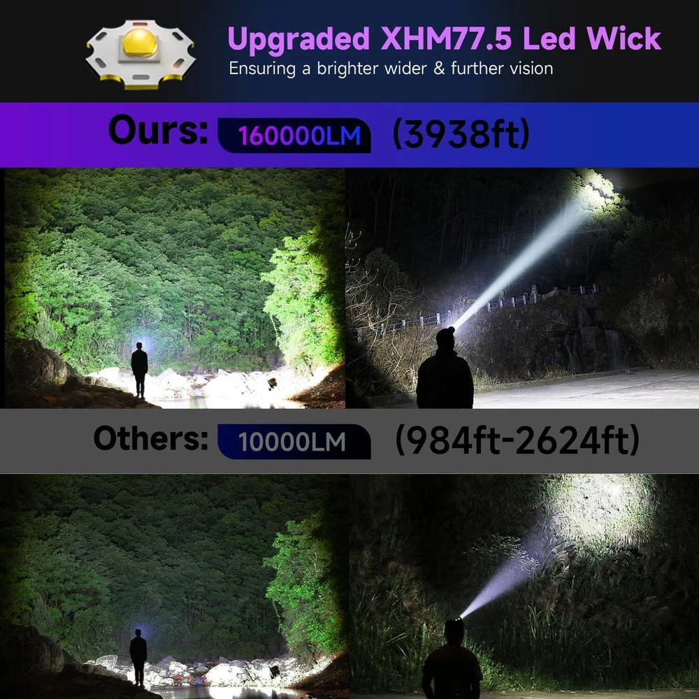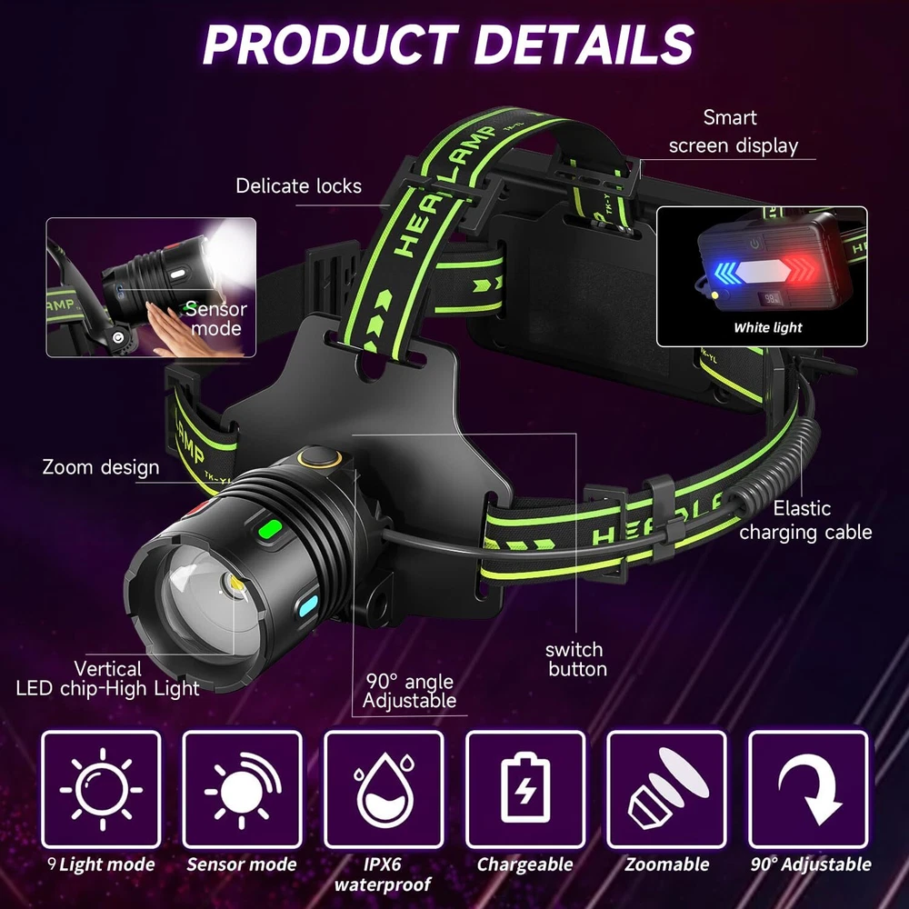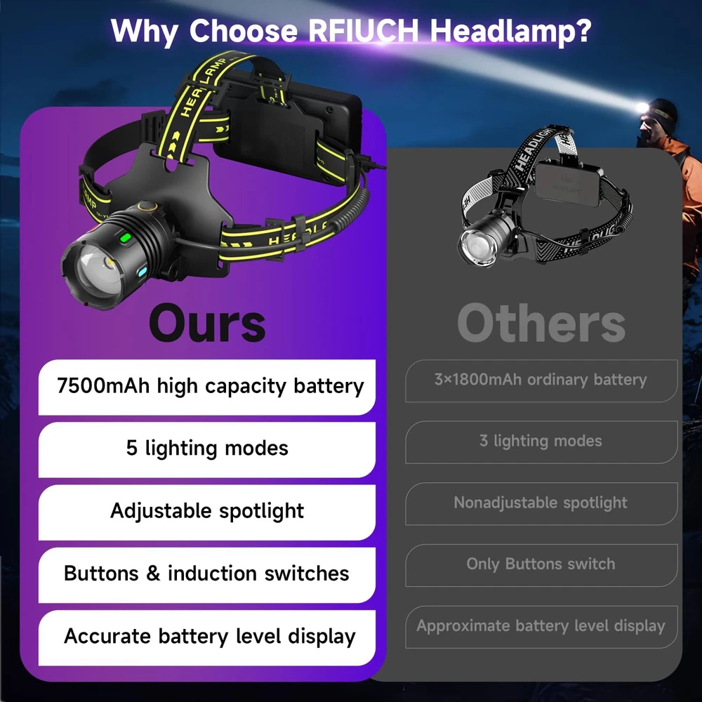 【Super Bright 160000 Lumens Headlamp】This bright headlamp upgraded used of vertical LED chips, Delivers up to 160,000 lumens, the maximum irradiation distance can reach 1200m/3938ft, this headlights run time can reach up to 6-12 hours. Headlamp flashlights are the best choice for jogging, camping, fishing, hiking, running, backpacking. 【9 Lights Modes & Upgraded Detachable Polymer Battery Cace】This brightest head lamp provides 9 main modes: 5 lighting modes (high-medium-low-strobe-sos), 4 warning lights on the back of the LED headlamp, white light (high-low), red light (high), red & blue light (strobe), turning it on can ensure your safety in the dark. This upgraded detachable polymer battery cace can be used alone outdoors and can be attached to metal to release light. 【90° Adjustable Light Angle & Sensor Mode】: The lamp head of the LED rechargeable headlamp supports 90° adjustment, you can select the most suitable lighting angle and reduce the pressure on the neck,provide more safe and convient in the use.Sensor mode can be easily use with pressing the button 3s, you can free your hands now,and no need to worry about can't manually operate the head lamp while working,turn your headlamp on and off with a wave of your hand. 【USB Charging & Power Output】Versatile head lights for forehead is specially designed with USB charging and power output, you can use any USB-C port to charge the headlamp when you are outdoors, You can also use the adjustable headlamp USB output is designed to be used as an emergency power source to charge smartphones, PCs or other devices, bringing more convenience to your outdoor activities. 【IP68 Waterproof & Heat Dissipation Rapidly】 - We have improved the density and width of the USB interface and the bulb cover to achieve IP68 waterproof. Aviation aluminum material makes the head lights resistant to high temperature, cold weather, and can quickly dissipate heat, so you will feel a little hot, it's a safe head light. The head lights for forehead can also resist falling and compressing. Just don't touch it with your hands. 【24-hour Best After-sales Service】We are here to make sure you use our headlights without any worries by providing excellent customer support and 3-year replacement guarantee. If you have any questions, RFIUCH professional customer support team is always ready to help you.