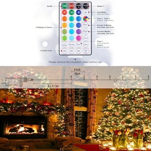 Special Features: Color Changing Package Dimensions: 5.98 x 3.62 x 2.44 inches Seasons: winter, fall Brand: Does Not Apply Type: Does Not Apply Voltage: 12 Volts (DC) Number of Items: 1 gtin13: Does Not Apply Customer Reviews: 4.5 out of 5 stars Item Height: 2.44 Material: Plastic Batteries Included: Yes Batteries Required: Yes Included Components: Remote control Color: RGB Color Item model number: SSLx-y(IC) Occasion: Christmas, Anniversary, Halloween, Thanksgiving, Valentine's Day Number of Light Sources: 100 Batteries: 1 CR2 batteries required. (included) Manufacturer: Linhai Shunsheng Decorative Lighting Co., Ltd EAN: Does Not Apply Special Feature: Color Changing MPN: Does Not Apply UPC: 794969826954 Light Color: White, Multicolor Theme: Music, Christmas, Fantasy, Halloween, Thanksgiving Indoor Outdoor Usage: Outdoor, Indoor Item Length: 5.98 Item Width: 3.62 Item Weight: 0.6 Pounds Size: 100LED Wireless Communication Technology: Infrared, Radio Frequency Number of Batteries: 1 CR2 batteries required. (included) Power Source: Corded Electric Date First Available: June 8, 2024 Light Source Type: LED Part Number: SSLx-y(IC) Controller Type: Remote Control Style: Modern Water Resistance Level: Waterproof Country of Origin: China Control Method: Remote