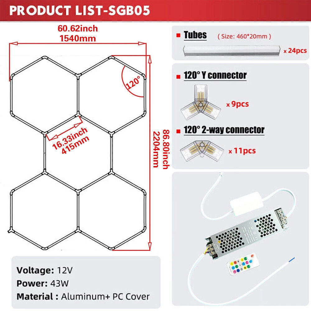 Product Description RGB Colour change Hexagon LED Lighting DIY For Gym Home Workshop Retail Specification Voltage: 220V Power: 43W Lumen: 15950LM Color Temperature: 6500K Material: Aluminum + PC Cover Product Size: 96.2 x 67.2 x 0.78 inches(L x W x H) Single Tube length: 460mm The remote is only red, green and blue. Product Included A Tube: 460*20mm 1.8w 19 pieces (INPUT→OUTPUT) B Tube: 460*20mm 1.8w 5 pieces (INPUT→NO OUT) Connectors: 120° 2-way white 11 pieces Connectors: 120° Y connector white 9 pieces The Power Cable: 1-end RGB Control System: 1piece RGB Remote Controller: 1 piece Zip Tie: 20 pieces Suspension Ceiling Light Kits: 10 Sets Installation Manual: 1 piece Want this item TAX FREE? Message us! Payment Shipping Terms Returns Contact Us About Taxes 1. We accept payment via PAYPAL ONLY . 2. Payment must be made within 4 days of auction closing. (Non-payment may result in a UPI (Unpaid Item) being put on your account. eBay will automatically close your account if you accumulate 4 UPI's total.) 3. TOTAL AMOUNT DUE includes the final auction price plus S&H(Shipping and Handling). 4.S&H will be determined based upon the SHIP TO address, Tax and customs. PLEASE NOTE: S&H DOES NOT INCLUDE DUTIES, LOCATL TAXES OR ANY OTHER IMPORTATION FEES. We are not responsible for any custom duty or import tax. 5. Please list your special requests (color, packages, etc.) in the PAYPAL NOTES SECTION when you make payment. Our working hours Beijing time from 9:00 a.m. to 18:00 p.m . Monday to Friday Delivery details 1. WORLDWIDE SHIPPING. (Except South America , APO/AFO,ect) 2.Orders processed within 24-48 hours of payment verification(excludes weekends and holidays). 3. We only ship to confirmed PAYPAL addresses. Your PAYPAL address MUST MATCH your Shipping address. 4. The images shown are not the actual item and are for your reference only. 5. SERVICE TRANSIT TIME is provided by the carrier and excludes weekends and holidays. Transit times may vary, particularly during the holiday season. 6. If you have not received your shipment within 40 days from payment, please contact us. We will track the shipment and get back to you as soon as possible with a reply. Our goal is customer satisfaction! 7. Due to stock status and time differences, we will choose to ship your item from our first available warehouse for fast delivery. 8.Delivery time: (Other countries or remote areas may take longer.) Delivery time: Country Delivery Time Working Days(not including holiday) 5-7 8-11 12-14 15-19 20-22 >22 Working Days+Saturday+Sunday 5-9 10-15 16-20 21-25 26-30 >31 United States Rate(item arrived) 5.1% 50.1% 29.6% 10.5% 4.7% Contact seller United Kingdom Rate(item arrived) 9.9% 63.2% 19.1% 3.4% 4.4% Contact seller Australia Rate(item arrived) 21.4% 50.0% 1 4.3% 7.2% 7.1% Contact seller France Rate(item arrived) 10.5% 28.6% 43.8% 10.1% 7.0% Contact seller Germany Rate(item arrived) 11.1% 22.2% 30.3% 20.9% 15.5% Contact seller Canada Rate(item arrived) 0.0% 47.1% 31.4% 17.6% 3.9% Contact seller Spain Rate(item arrived) 3.5% 25.0% 47.9% 12.9% 10.7% Contact seller (Other countries or remote areas may take longer.) Warranty: 1. One Year Manufacturer's Warranty for defective items (excluding items damaged and/or misused after receipt). Accessories come with a 3-month warranty. 2.If buyer requests a return when there is no quality problem of the item he received,return postage has to be paid by buyer,and postage for the item won't be returned. 3.If item is damaged or defective on arrival,buyer can either requests a refund or replacement,and postage will be paid by us,meanwhile,the item must be returned. Note: A. Customs duties is neither included in the item value nor the postage,which should be in the responsibility of buyers. B. Please check with your country's customs office to determine what these additional costs will be prior to bidding/buying. 1. You have 7 days to contact us and 10 days to return it from the date it was received. WE WILL ISSUE YOU A REFUND OR REPLACEMENT ! 2. All returned items MUST BE in the original packaging and you MUST PROVIDE us with the shipping tracking number , specific reason for the return, and your eBay ID . 3. We will refund YOUR FULL WINNING BID AMOUNT, upon receipt of the item in its original condition and packaging with all components and accessories included, AFTER BOTH Buyer and Seller cancel the transaction from eBay. OR, you may choose to have a replacement. 4. Return shipping is to be paid by the Buyer . Our office hours are: 9:00 a.m to 6:00 p.m (GMT +8) of Monday to Saturday. And our office is closed on Sunday and public holidays (China). We apologize for the late reply during the holidays. Anything,please contact us by ebay message,we'll service you asap!!! 1. We maintain high standards of excellence and strive for 100% customer satisfaction! Feedback is very important to us. We request that you contact us immediately BEFORE you give us neutral or negative feedback, so that we can satisfactorily address your concerns . 2. We will reply you in 24 hours on business days ( excludes weekends and holidays ) , please note the time difference, so,kindly don't take any action on eBay before getting a reply from us. 3. If you are satisfied with our products and service, please do not forget to leave a good review to us, thanks! For all orders, please note that: 1. Taxes and charges are not included in the item price or shipping charges. 2. Please check with your country's customs office to determine what these additional costs will be prior to bidding/buying. 3. If there is the cutsom fee casused by the cutsom detention, the buyer need to check with your country's customs and deal with it himself. Payment 1. We accept payment via PAYPAL ONLY . 2. Payment must be made within 4 days of auction closing. (Non-payment may result in a UPI (Unpaid Item) being put on your account. eBay will automatically close your account if you accumulate 4 UPI's total.) 3. TOTAL AMOUNT DUE includes